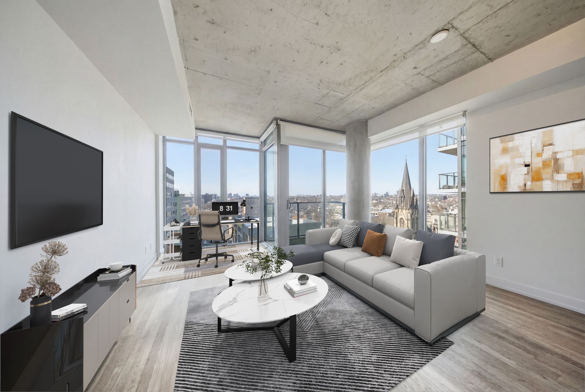 • Floor-to-ceiling windows with a loft-style feel and modern character.