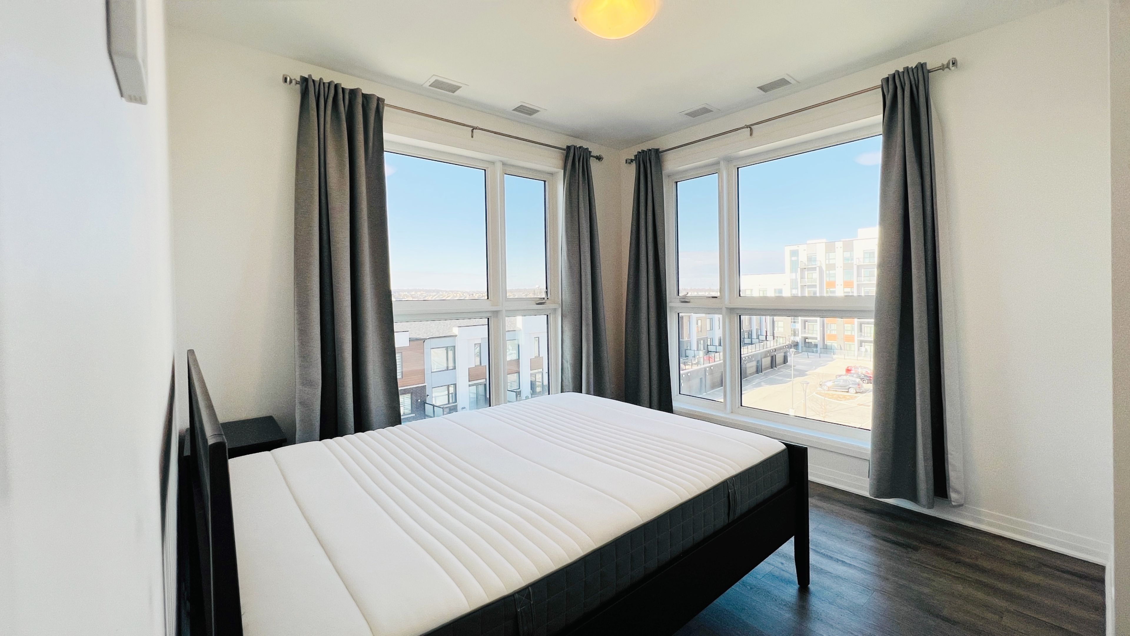 Quiet corner unit, 2 bdr 2 bathrooms low rise mattamy condo. Floor to ceiling windows. Upgradedkitchen w/quartz c/top, tiles backsplash & s/s appliances. 9ft ceiling. Open concept kitchen/living area. Clear e/w/n view. Primary bedroom with 4 pc ensuite and w/i closet. Close to schools, parks, shopping, transit. One parking and one locker included. Internet is included too. Move in ready.