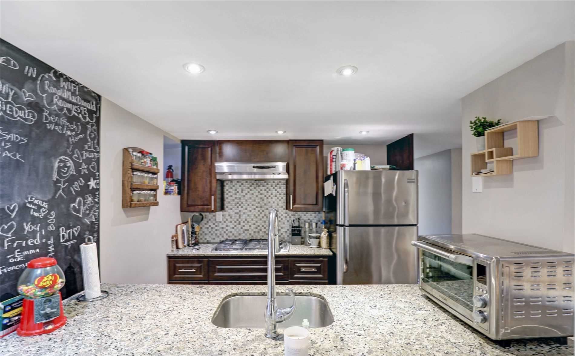 • Kitchen features granite countertops and stainless steel appliances.