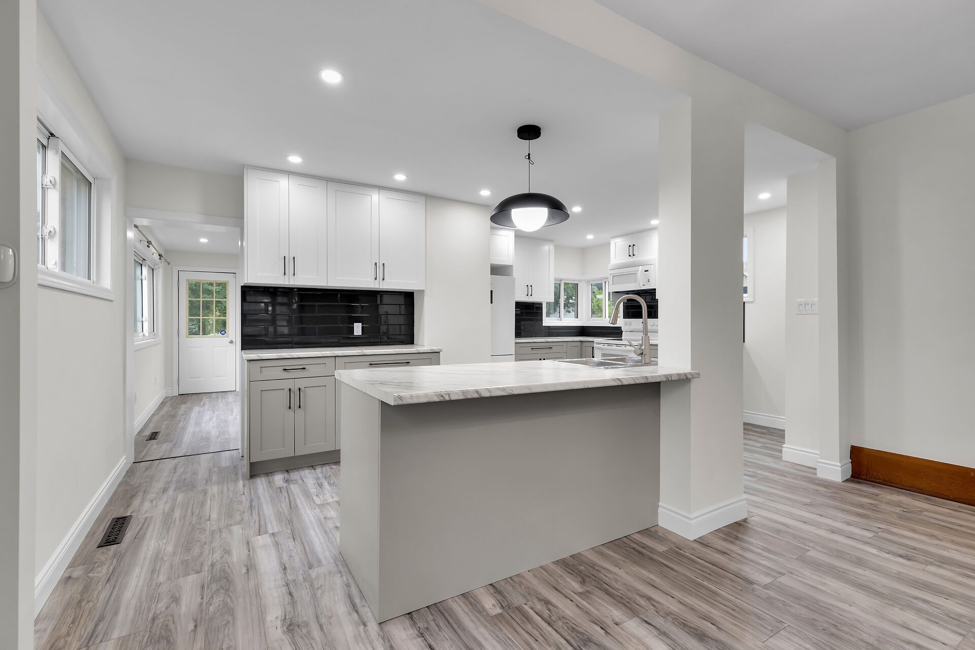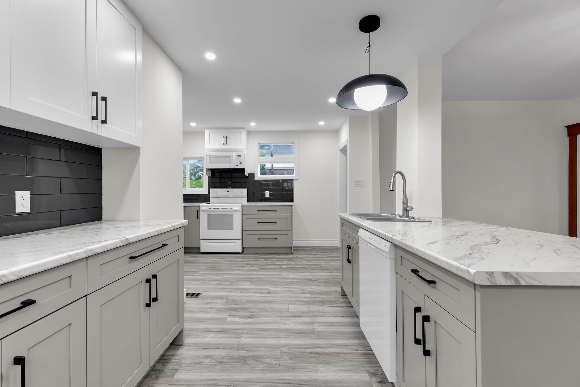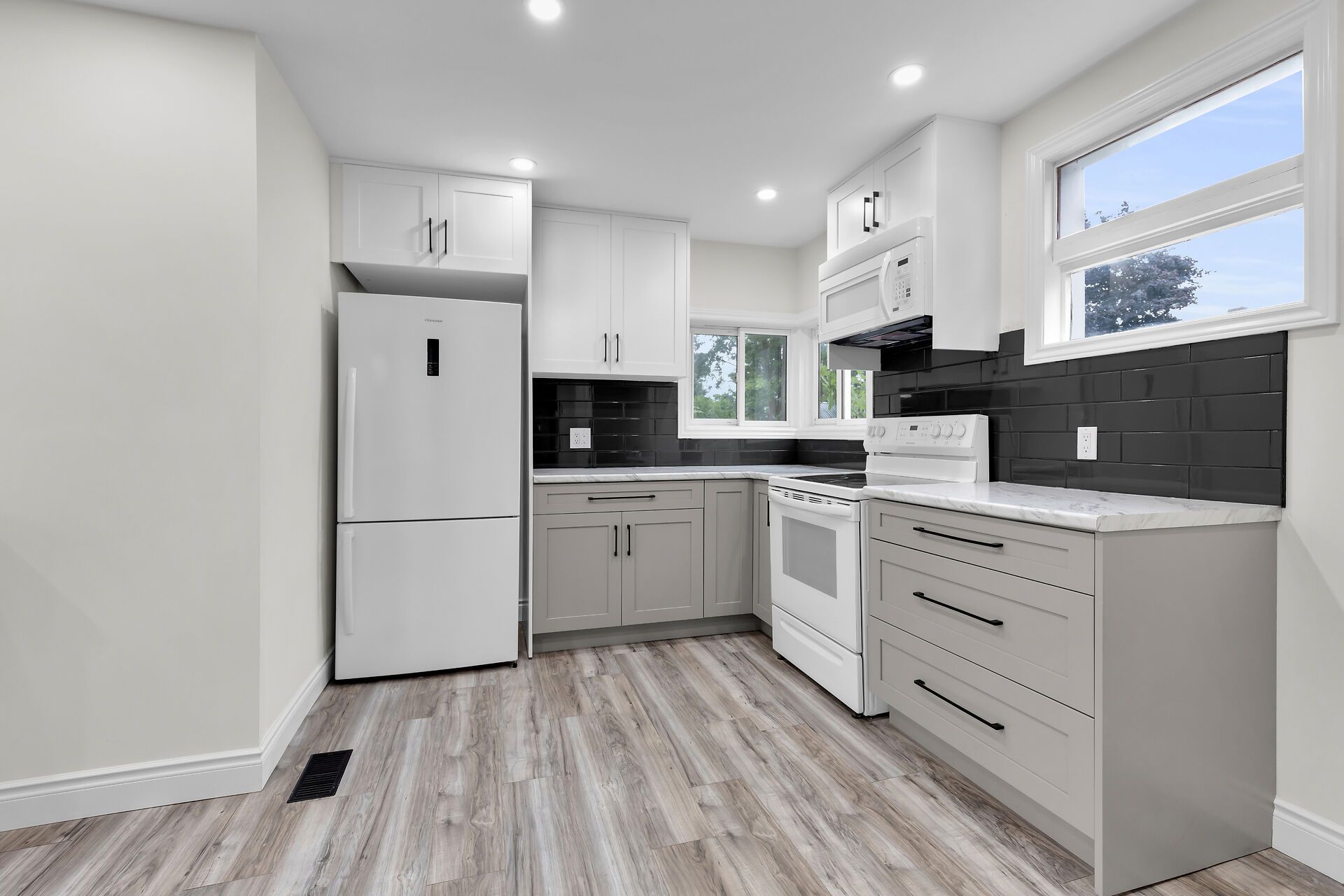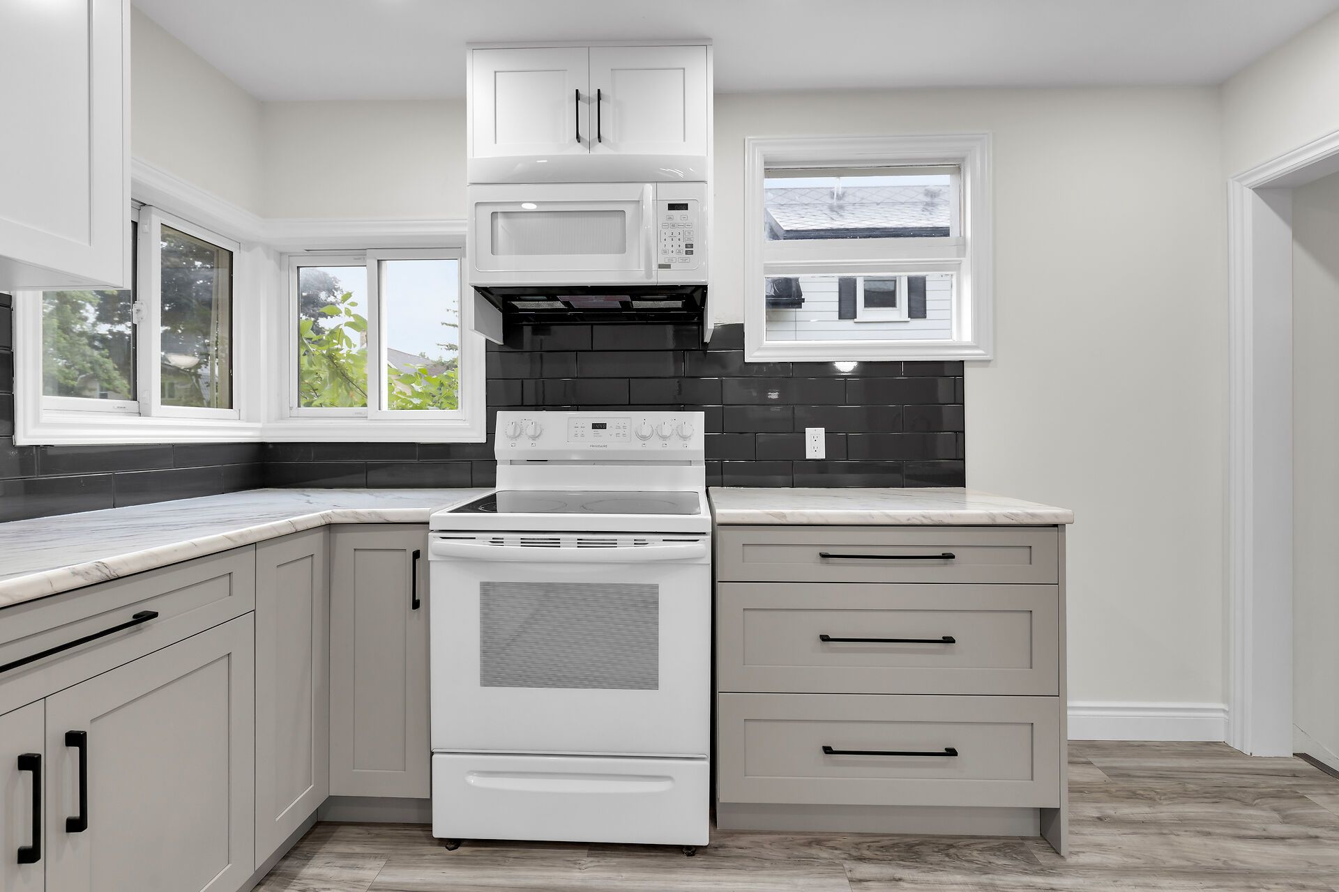 • Modern kitchen with sleek appliances and updated bathrooms throughout.