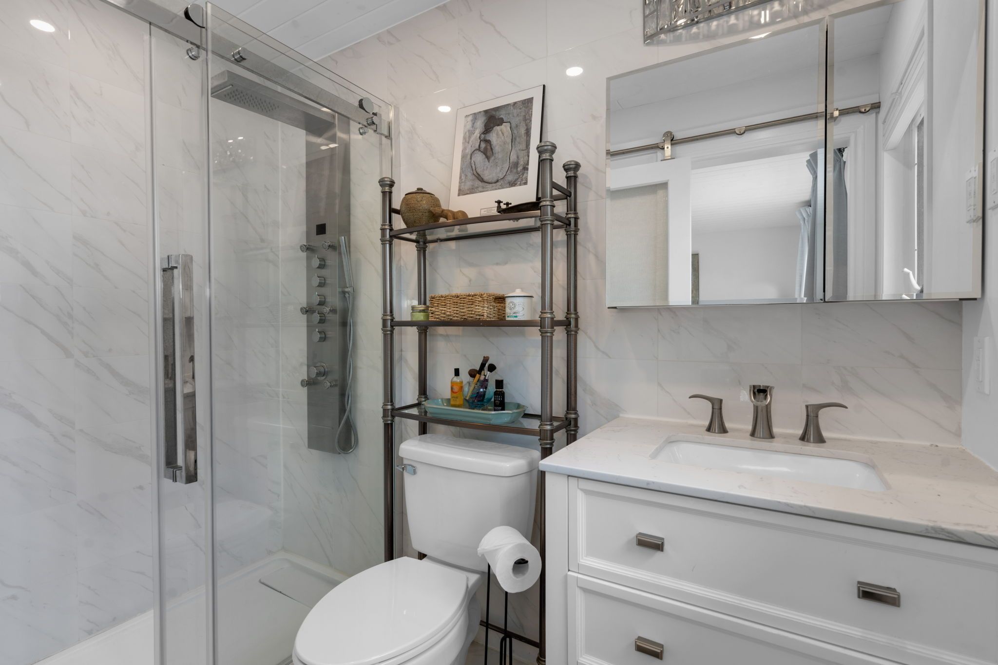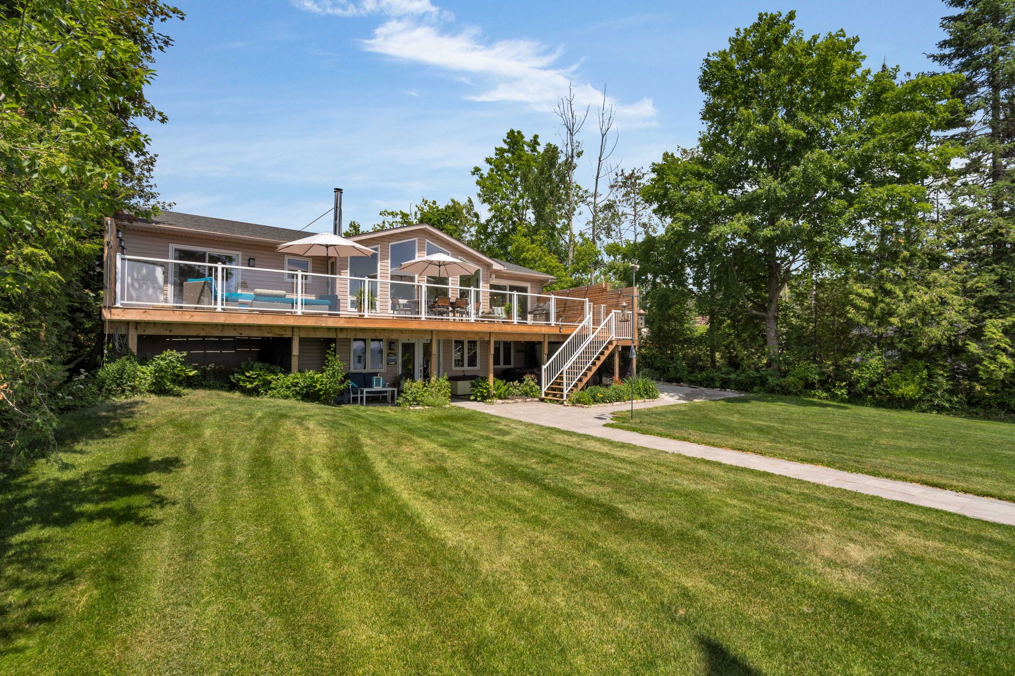 Set on 81 feet of clean, south-facing shoreline, this renovated bungalow offers over 2,700 sq ft of finished living space and a layout that works equally well as a full-time home or weekend retreat. Inside, large windows and glass doors bring in natural light and frame the lake from both levels. The main floor features an open living and dining area with a wood-burning fireplace, engineered hardwood floors, and a kitchen with quartz countertops, island, and upgraded appliances. Three bedrooms and two bathrooms include a primary suite with a walkout, custom closet, and 3-piece ensuite. The fully finished walkout basement adds flexibility with a spacious rec room, gas fireplace, fourth bedroom, third bathroom, wet bar or kitchenette, and laundry. This level connects directly to a covered patio and hot tub area, creating a seamless indoor-outdoor setup. Outside, the property is designed for enjoying the water, with a 72-foot dock, shallow beach entry, and space for swimming, paddling, or relaxing by the lake. Extensive updates and features include new shingles (2020), furnace with uv sterilizer (2021), a/c (2022), water treatment system with uv and charcoal filtration, 200-amp service, generac generator, and smart home integration. The insulate triple garage includes, heat, subpanel, and ev outlet, along with additional storage in two sheds (one with hydro). Located within easy reach of barrie, orillia, and highway 11, this is a well-rounded waterfront property now offered at a compelling price