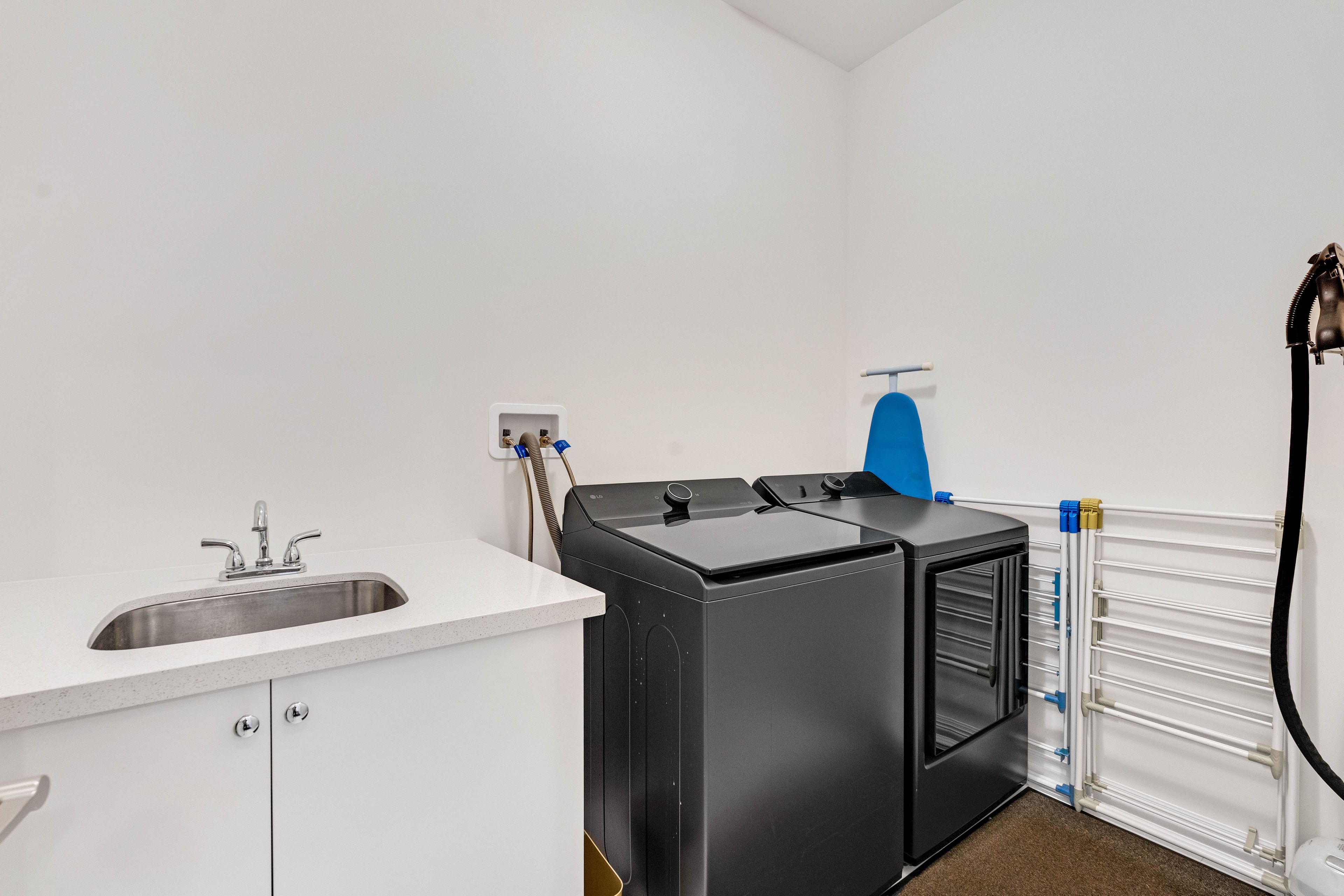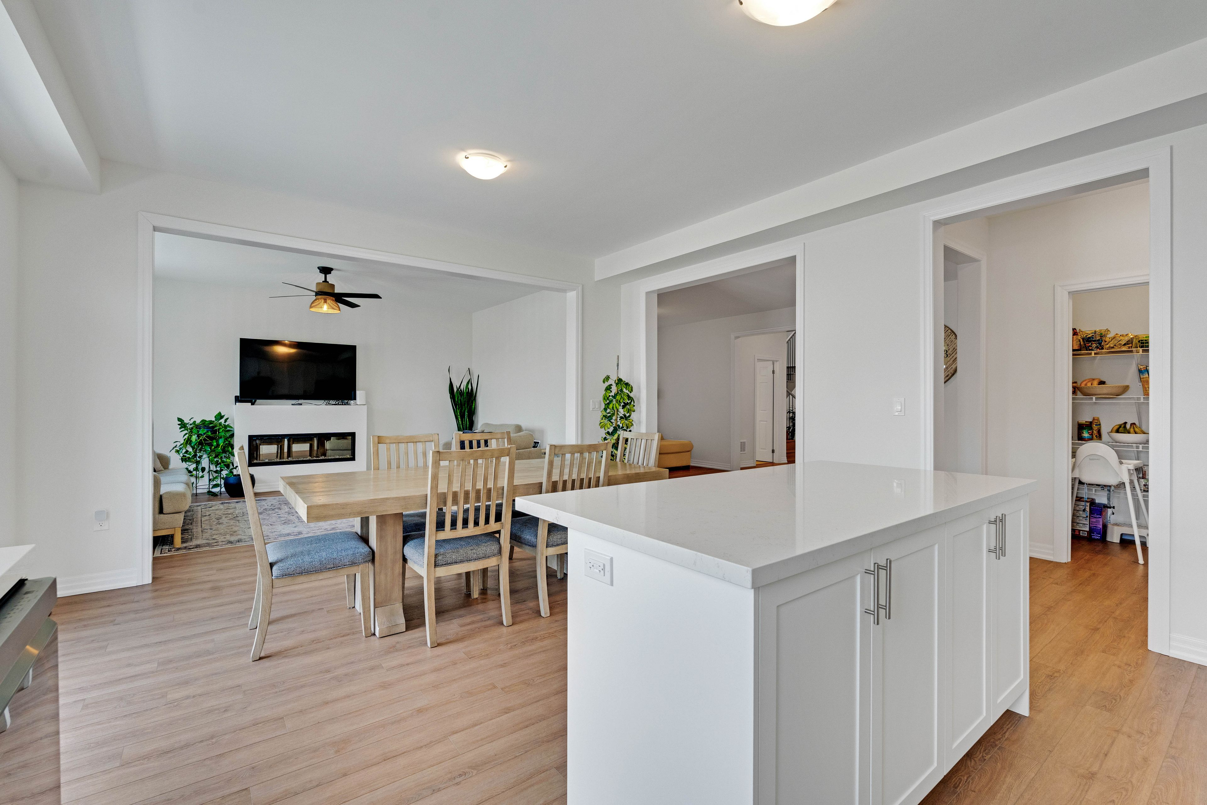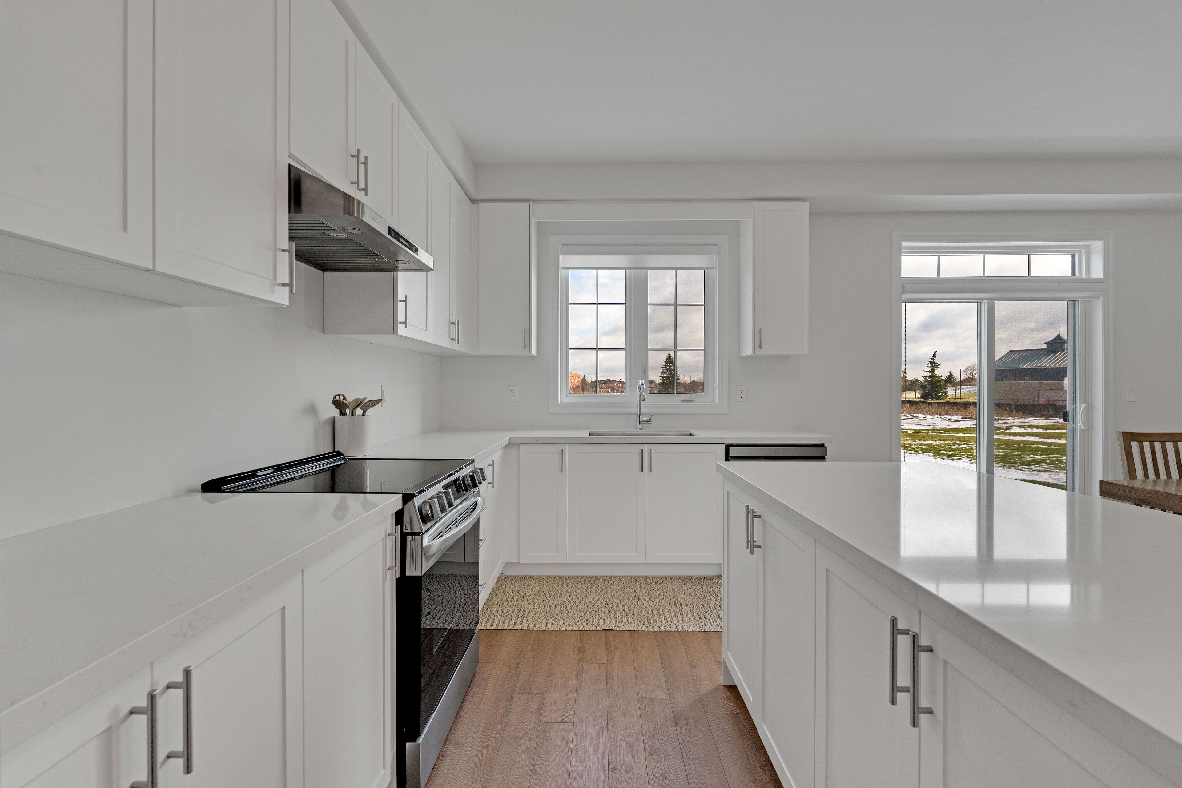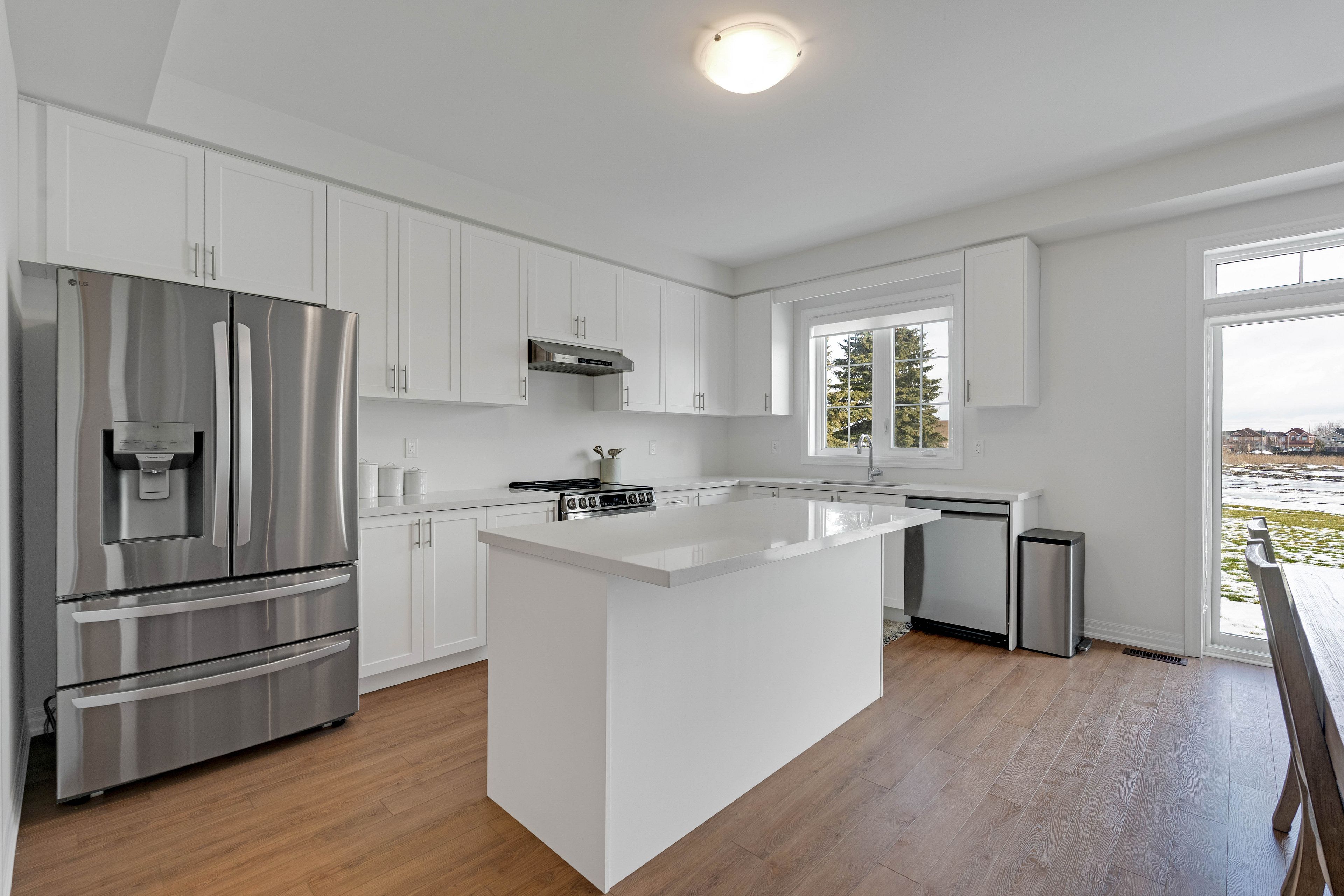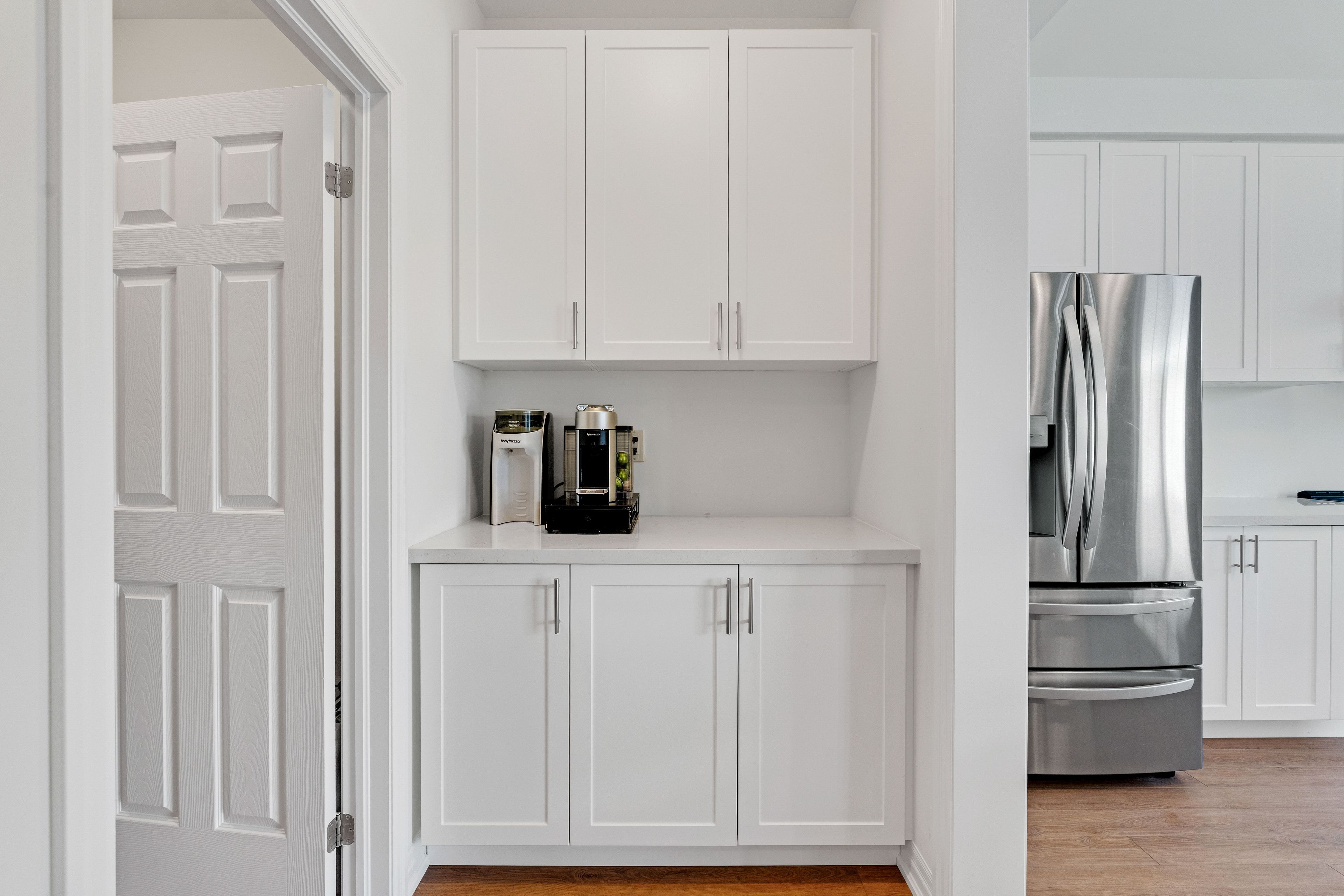 • Stylish kitchen with quartz countertops and stainless steel appliances.