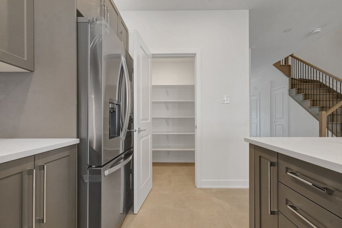 • Modern kitchen with quartz countertops and stainless-steel appliances.