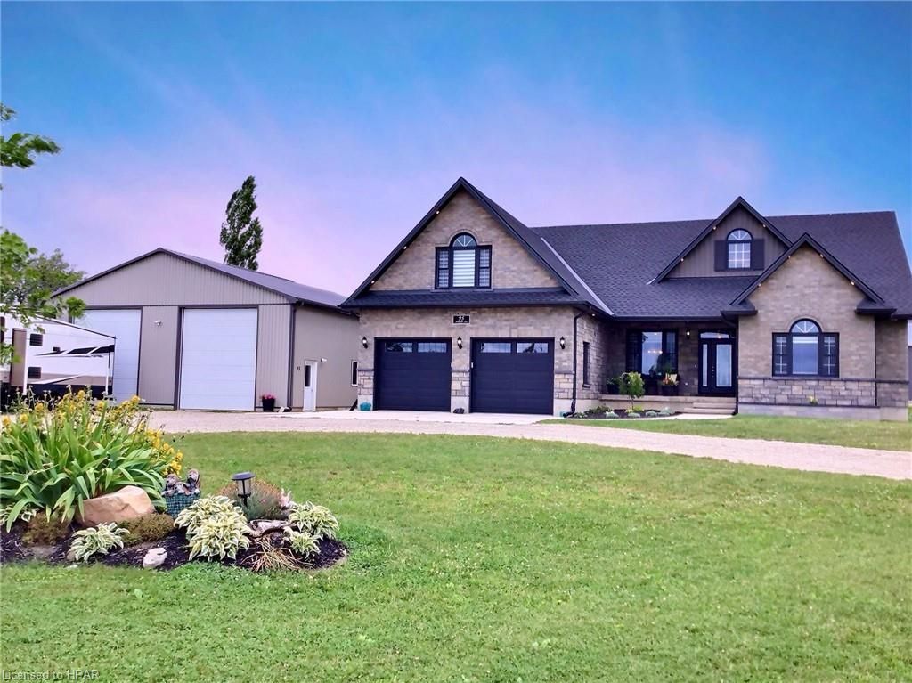 Welcome to your dream home! This stunning 2-year-old custom-built bungaloft offers modern living in a serene country setting 2 minutes from lake huron, situated on a sprawling 1. 5-acre property, this home boasts 3711 sqft. Of living space, 3+1 bedrooms and 3 full bathrooms, providing ample space for your family. As you step inside, you'll be greeted by an open-concept main floor featuring beautiful hardwood floors. The professionally designed, gourmet chef's kitchen is a showstopper, complete with granite countertops, and a large island perfect for entertaining. For added comfort, the tile floor in the kitchen and the two bathrooms have in-floor heat. The adjoining family room offers vaulted ceilings and a gas fireplace! The finished basement is an entertainer's paradise, featuring a home theatre, custom wet bar, and plenty of room for an in-law suite. Outside, you'll find a large double-car garage, a covered front porch perfect for enjoying quiet evenings and fabulous sunset views, and a private, tranquil backyard with a covered deck, patio bbq, hot tub, and fire pit. The large driveway leads to a 2000 sq ft. Insulated, heated shop with 14 high doors, large enough to store trucks, vehicles, boats, and rvs. The property also comes with a backup generator. Located just a short drive from goderich and the stunning beaches of lake huron, this property offers the perfect blend of country tranquility and convenient access to amenities. Don't miss your chance to own this one-of-a-kind home! Click the video link under property information to take the virtual tour. Call for more information.