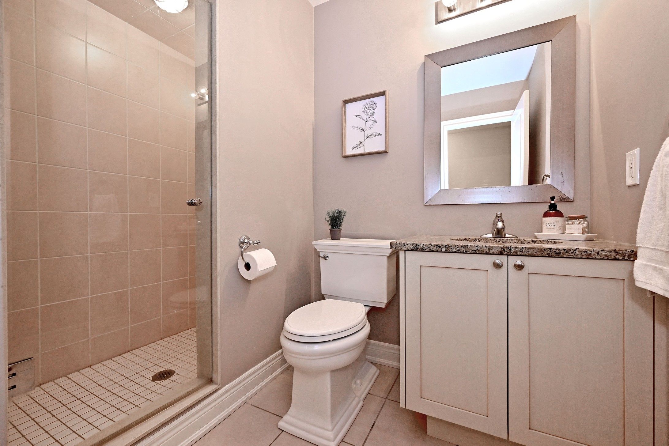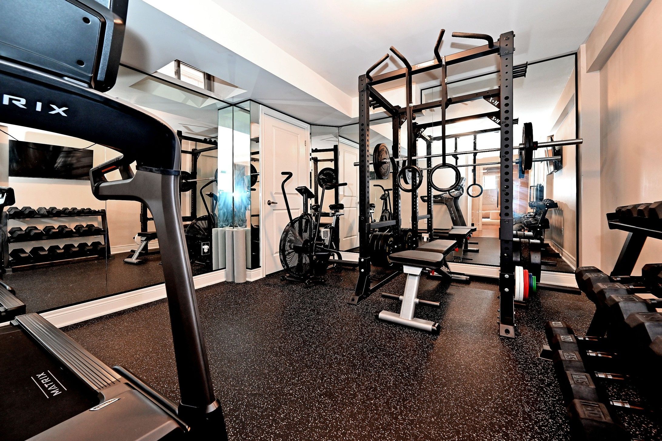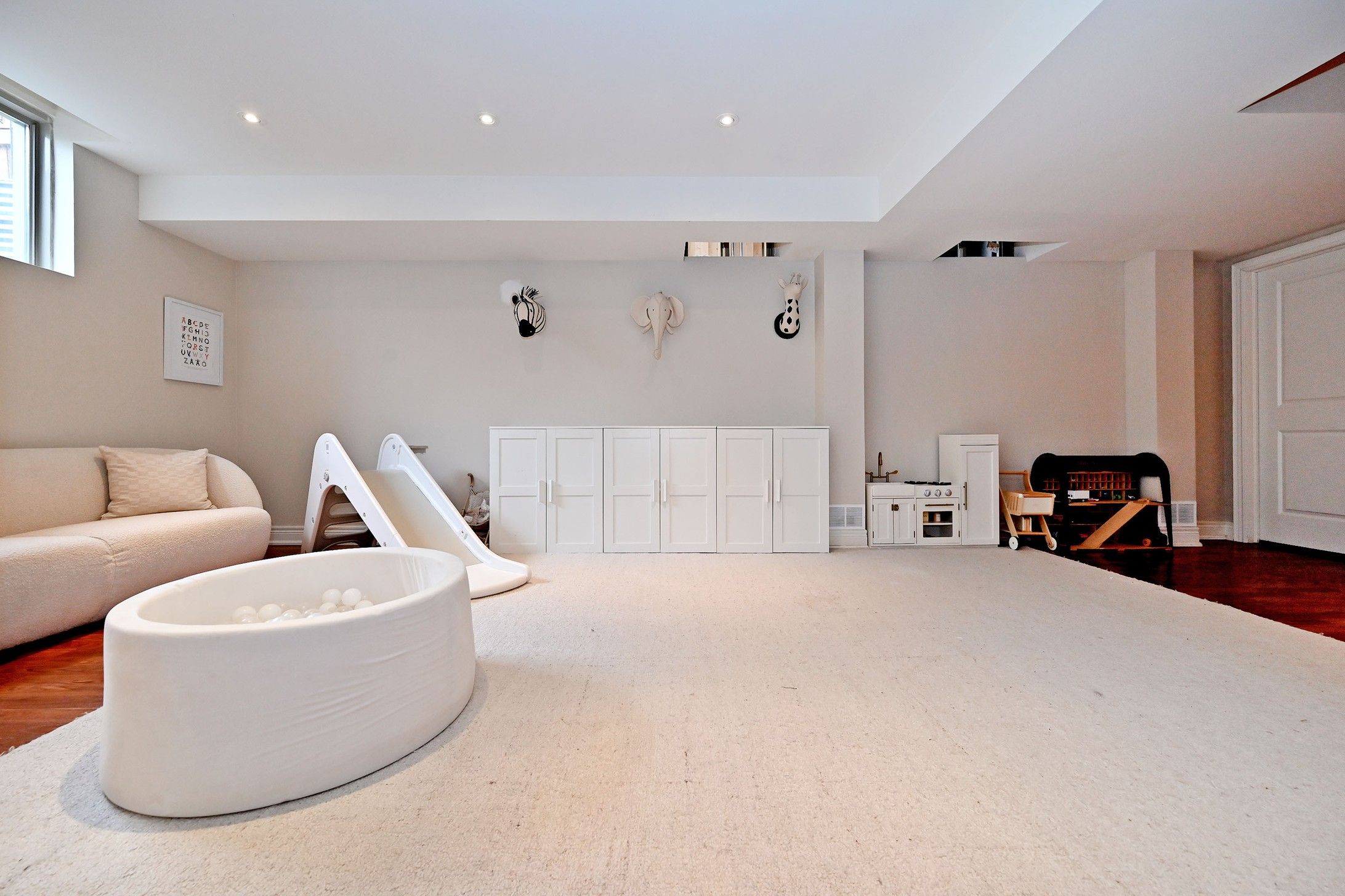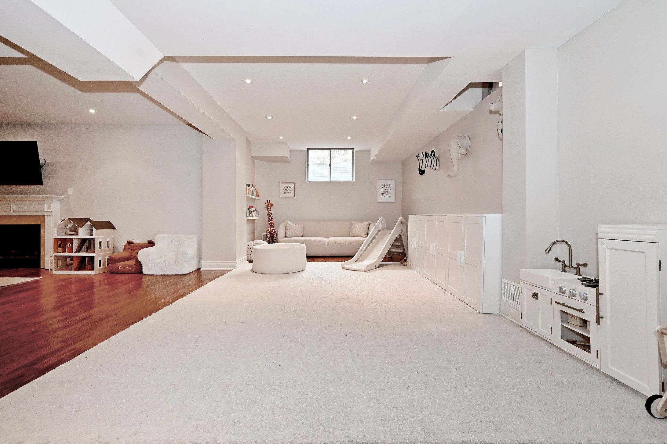 • Finished basement includes a recreation room, exercise space, and gas fireplace.