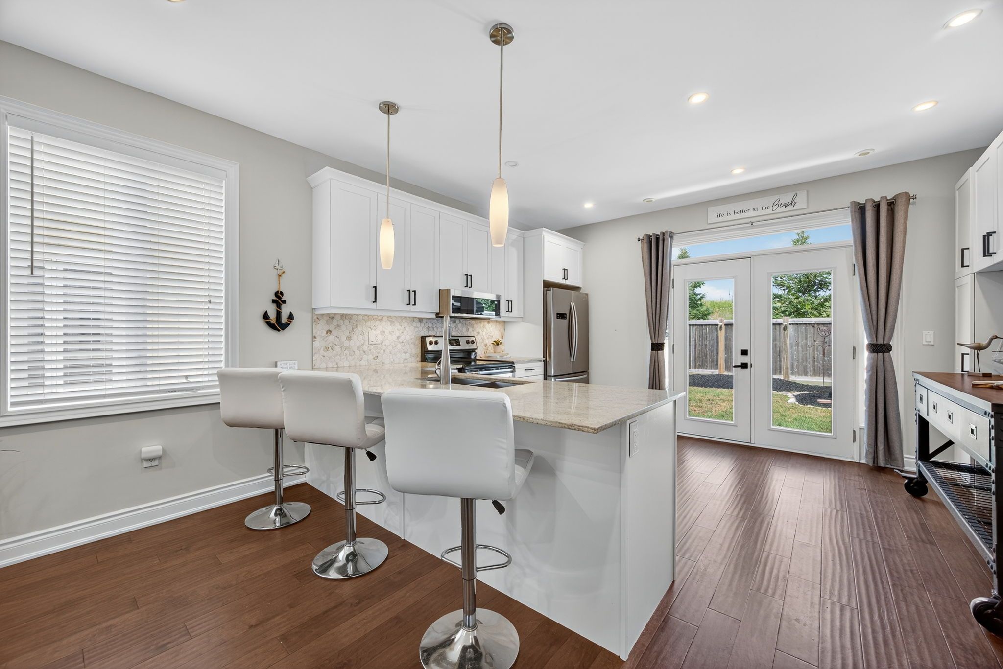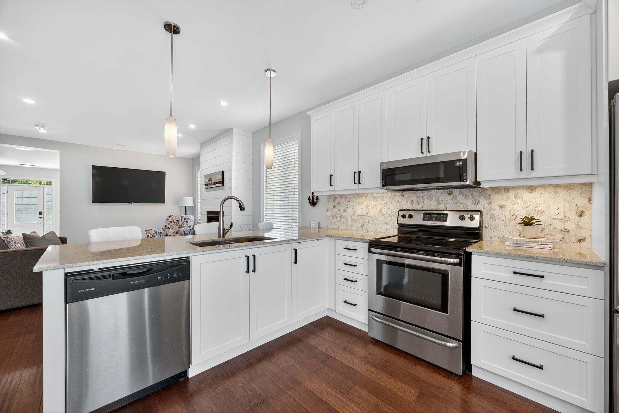 • Spacious kitchen with quartz breakfast bar and stainless steel appliances.