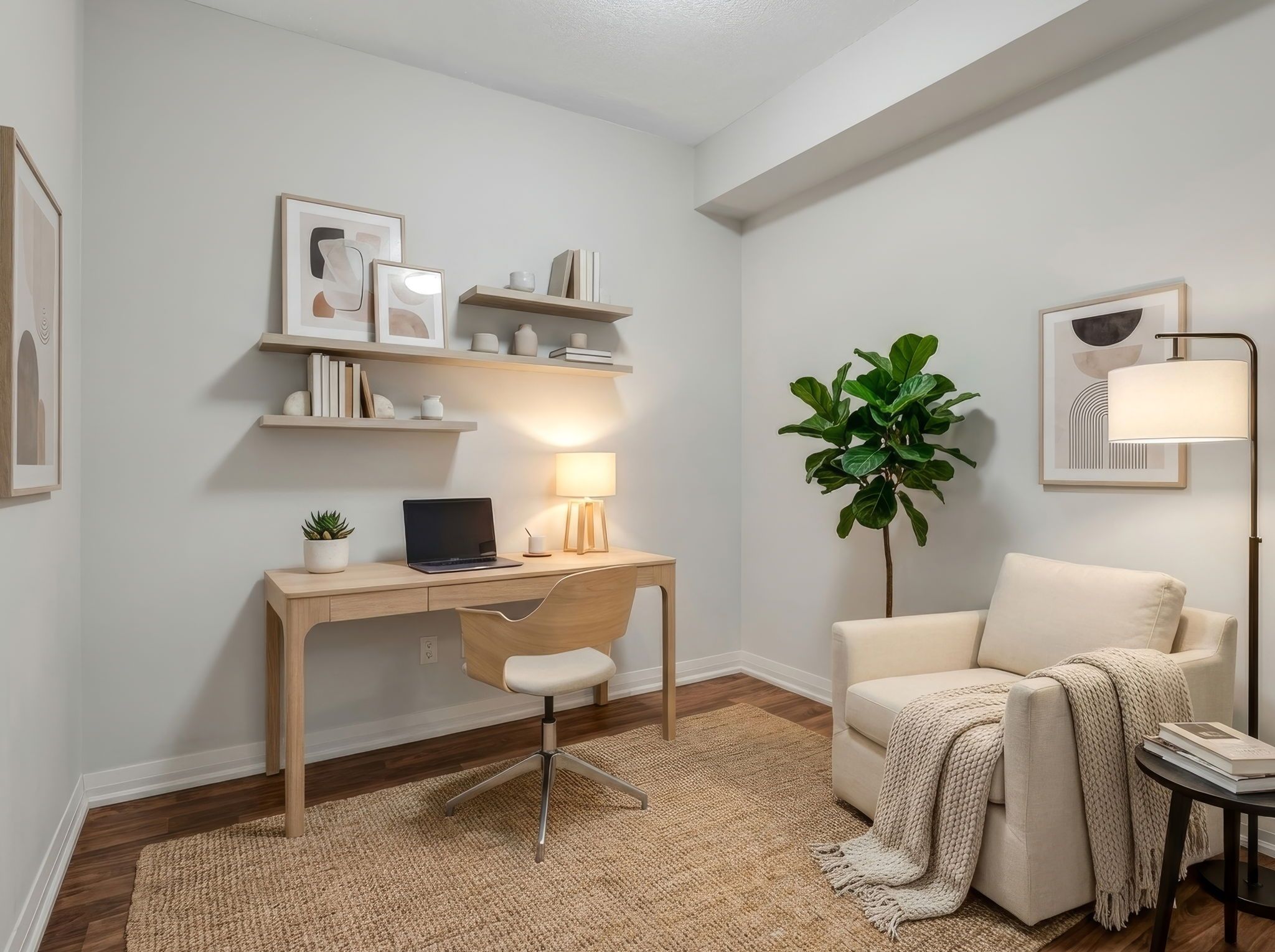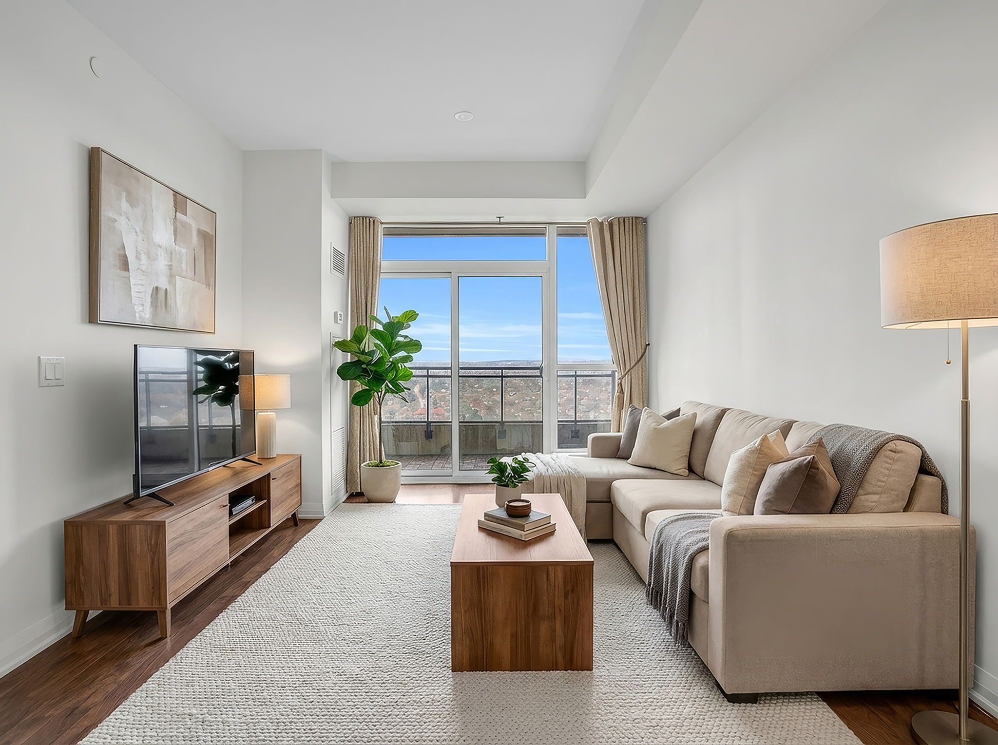 • Spacious living area with a balcony overlooking a peaceful pond.