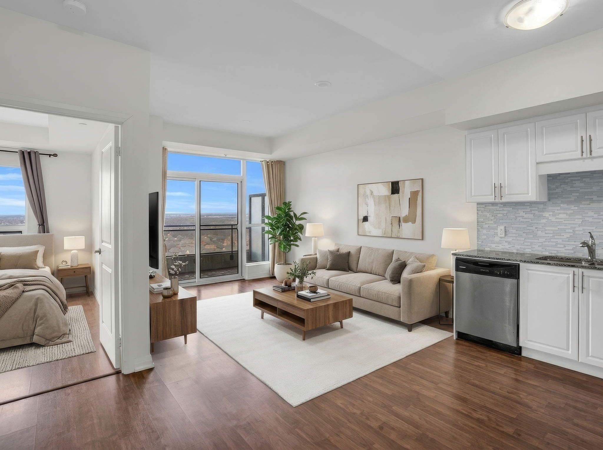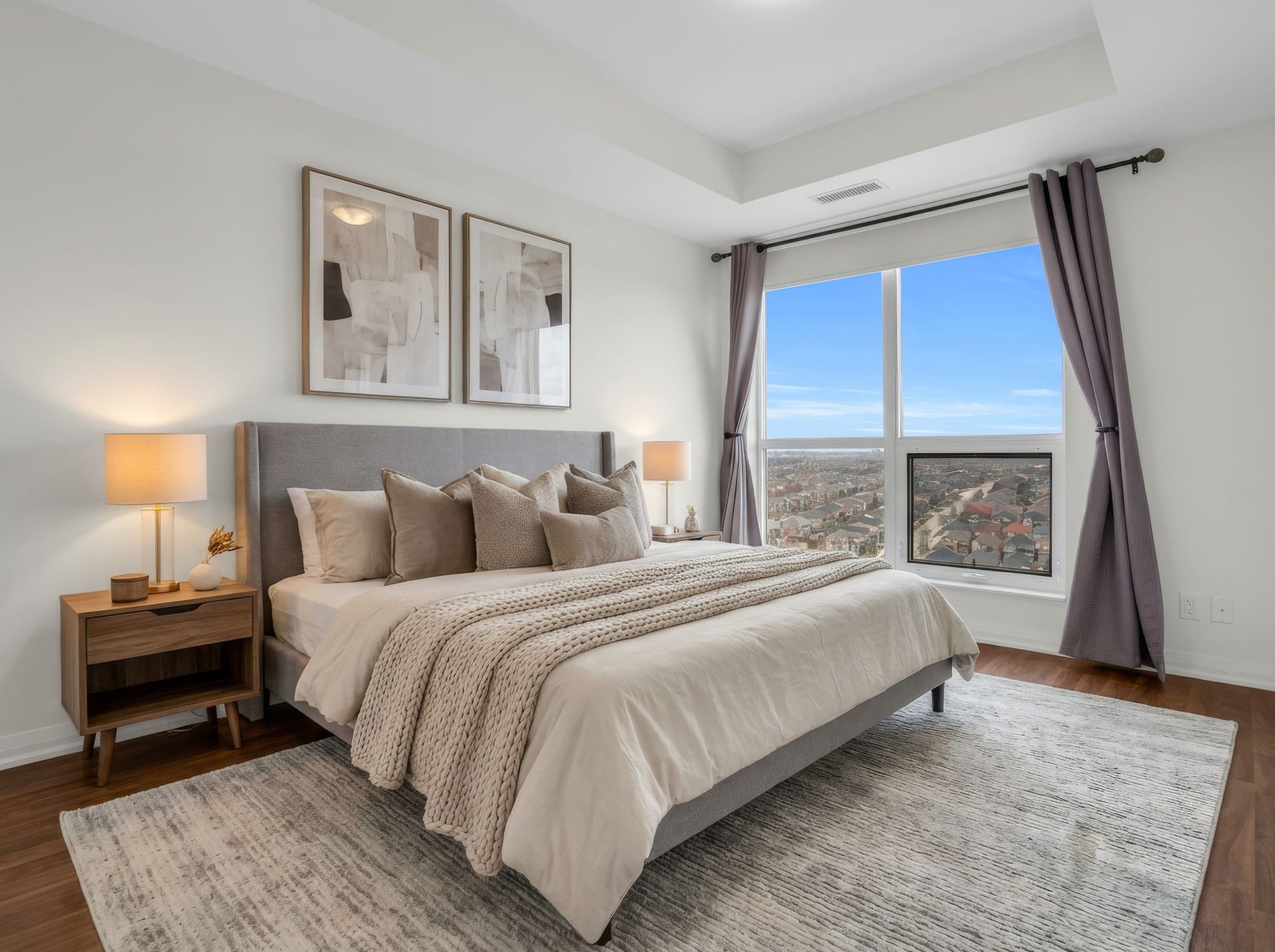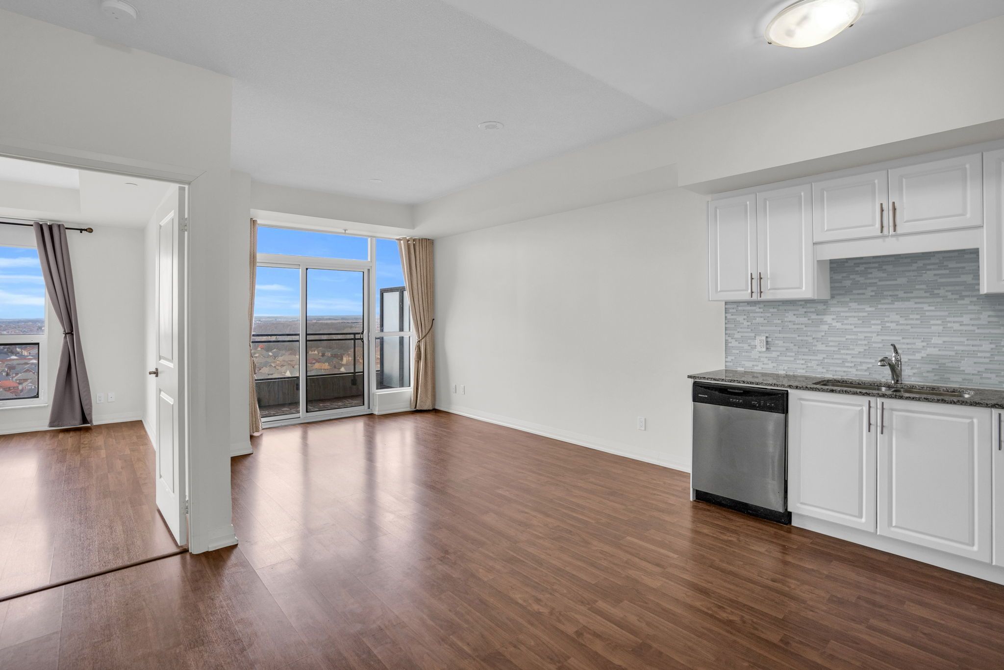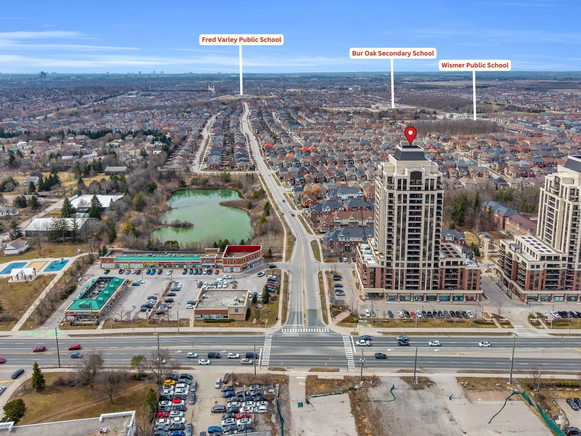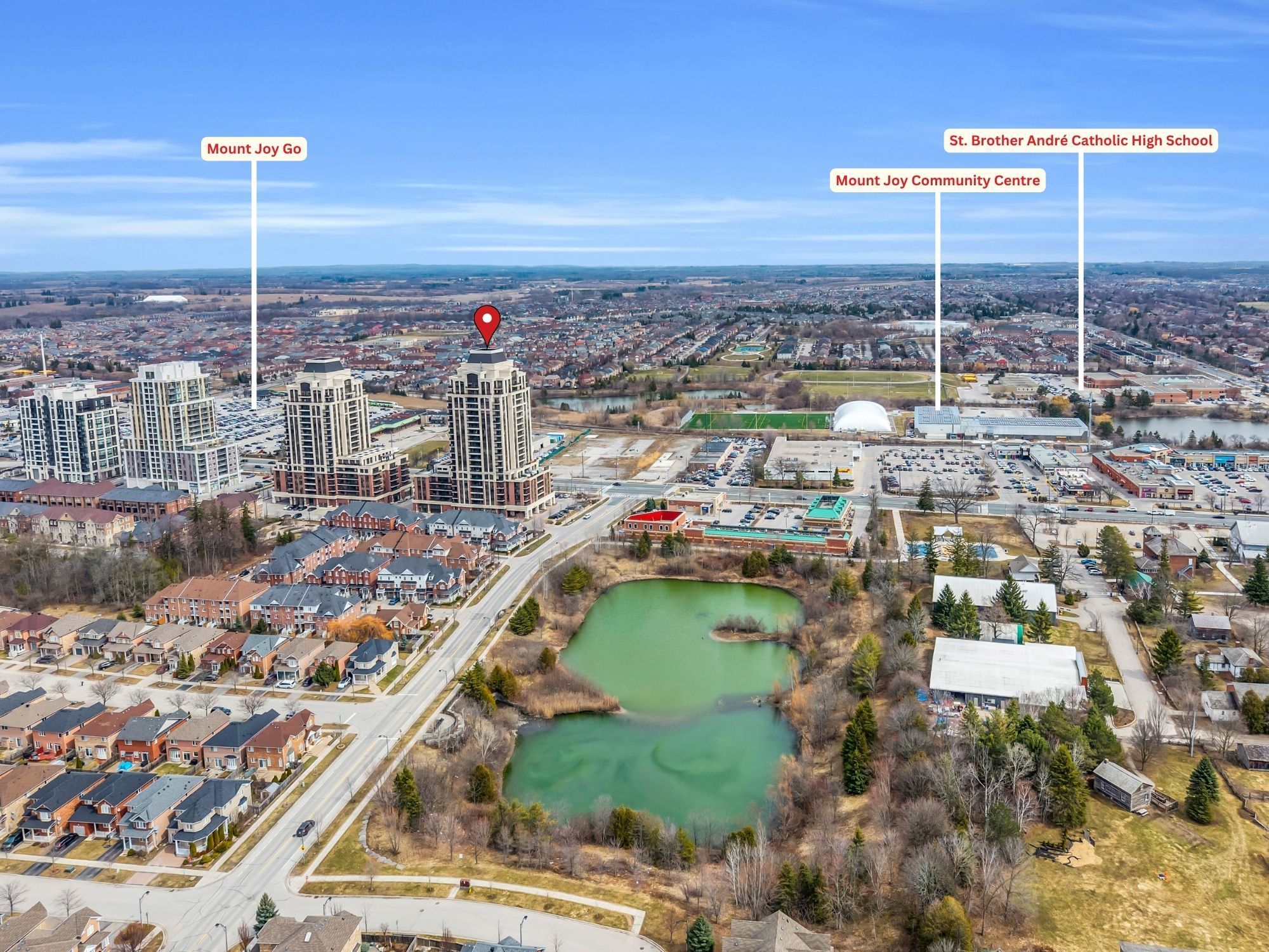 Experience condo living at its finest! Located in one of markham's premiere condominium buildings, this 18th level unit soars above the rest with it's incredible west facing views! This functional layout includes an open modern kitchen featuring stone countertops, stainless steel appliances, and trendy backsplash, a large living area with walk-out to balcony overlooking serene pond, parkette, and unobstructed neighbourhood views, spacious primary with large window, and a generous den perfect for a home office or creative space. Perfectly located within walking distance to mount joy go station, incredible schools, and endless shopping options! Building amenities include top notch concierge service, large party room with billiards table and roof top terrace, gym, and guest suites. You won't want to miss this!