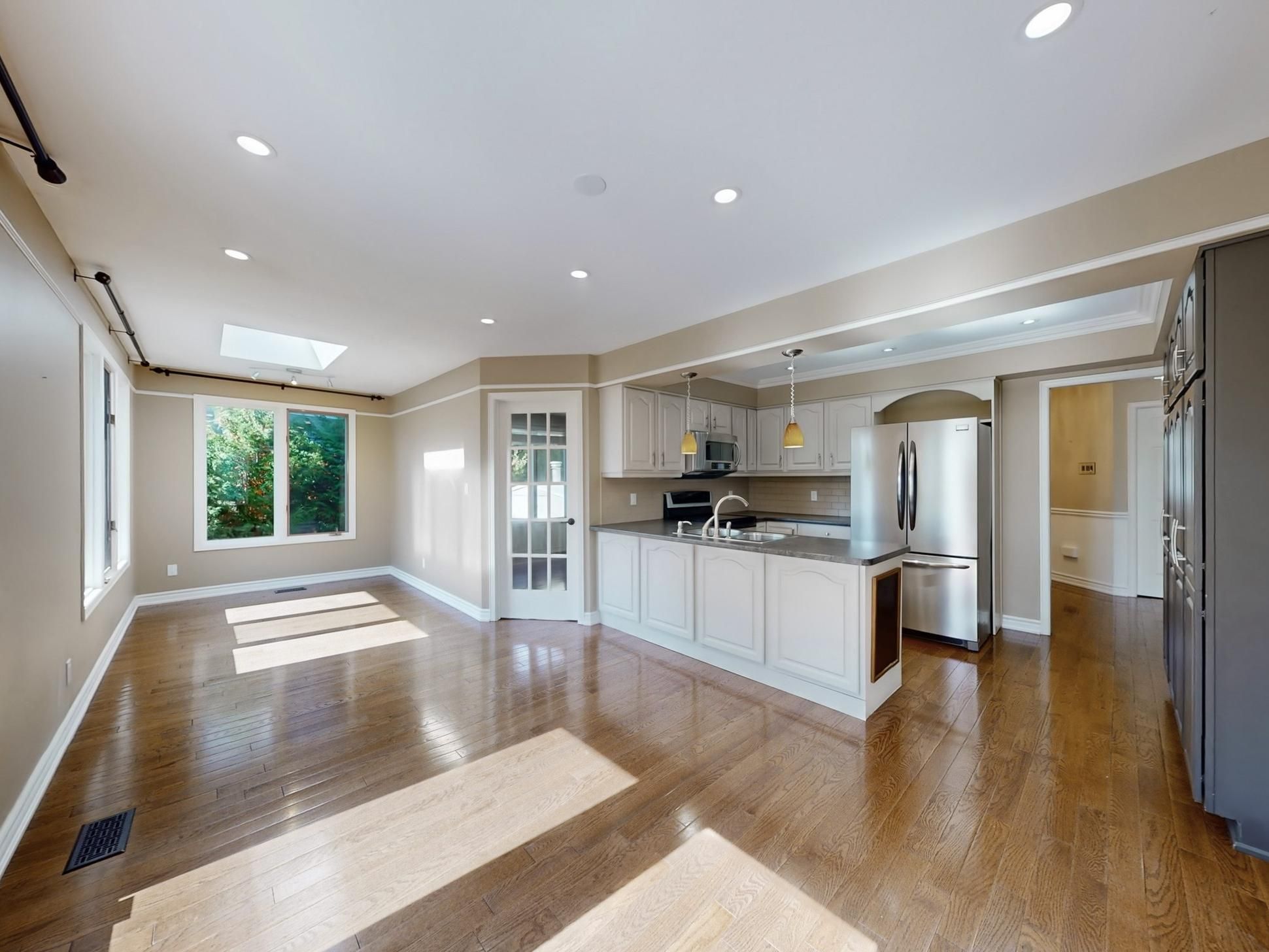• Modern kitchen with stainless steel appliances and breakfast area.