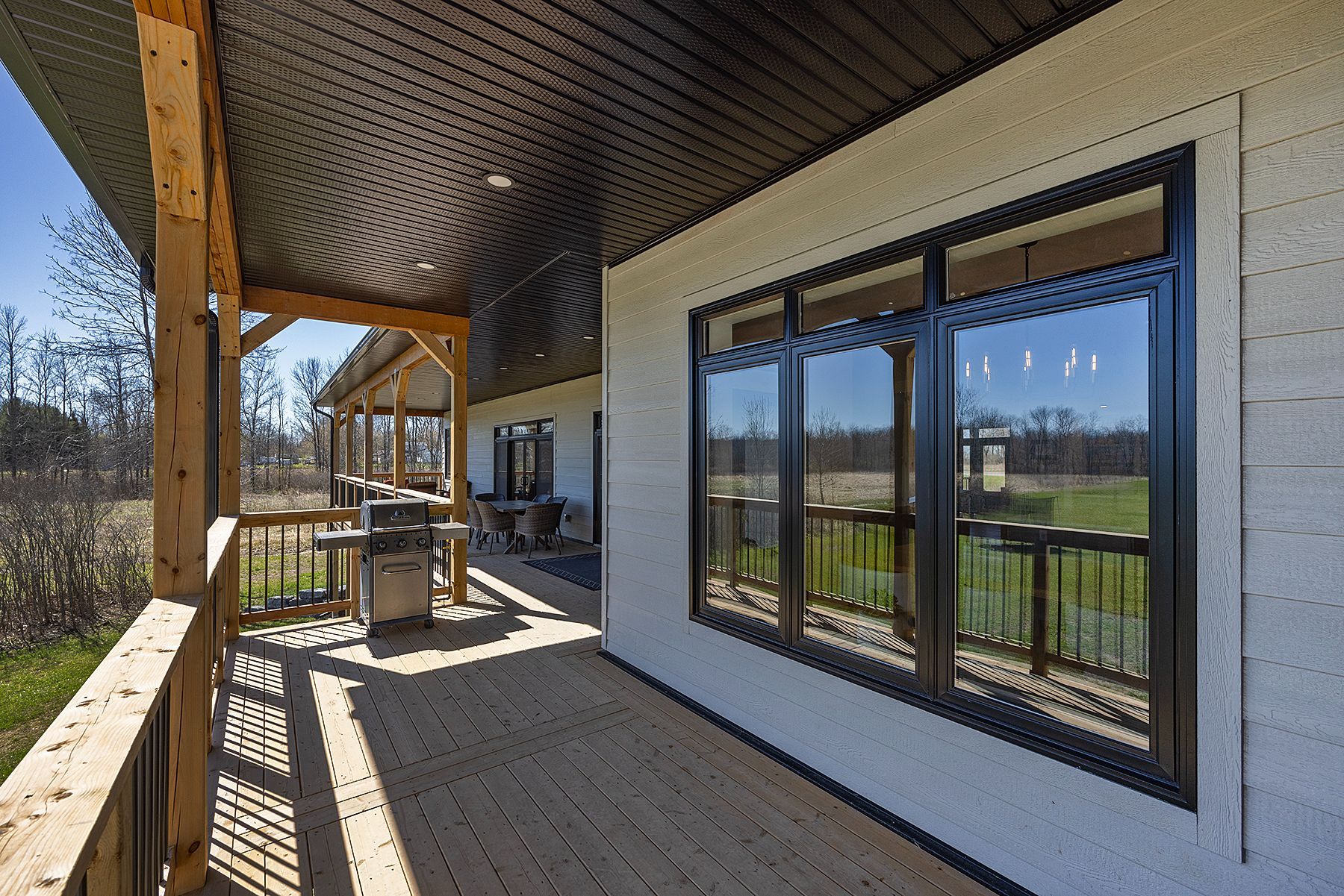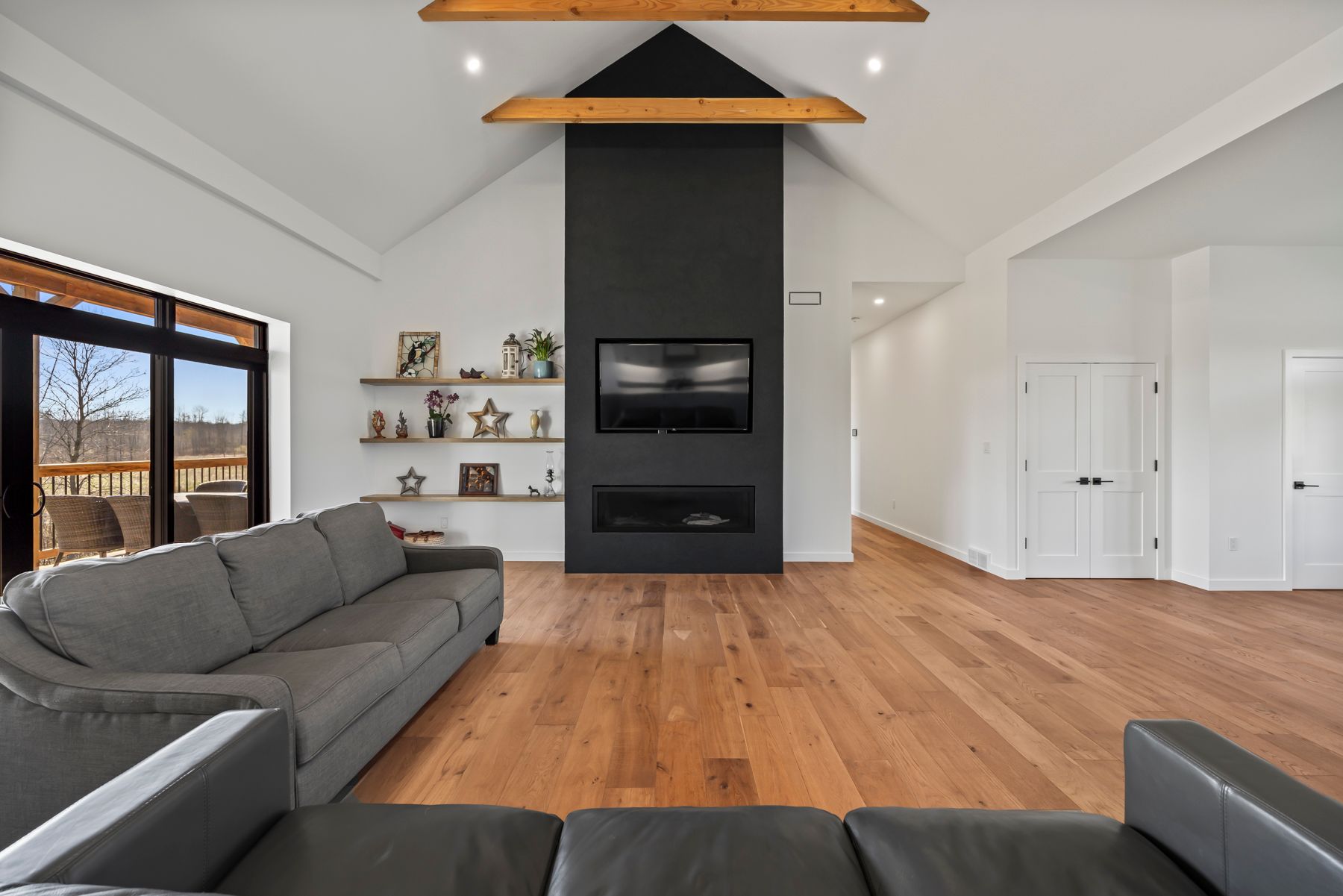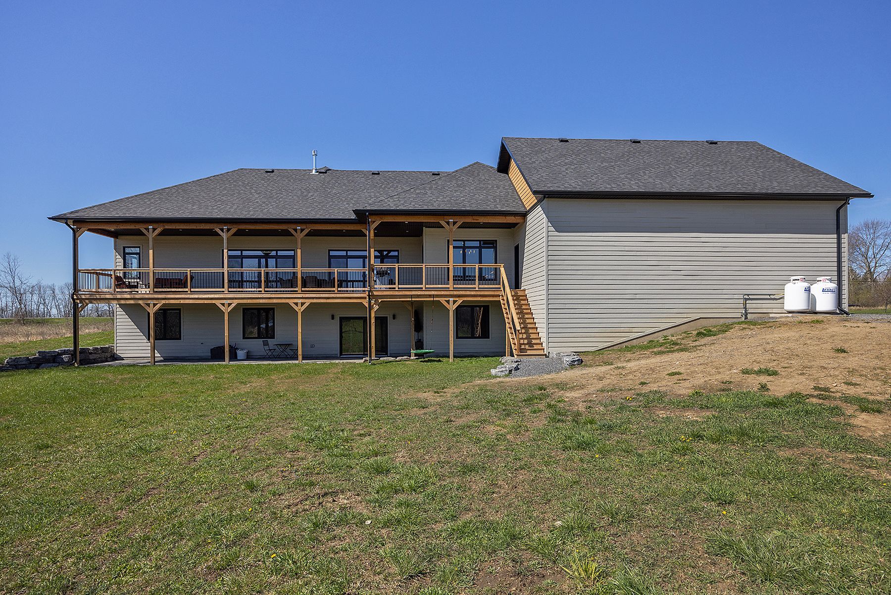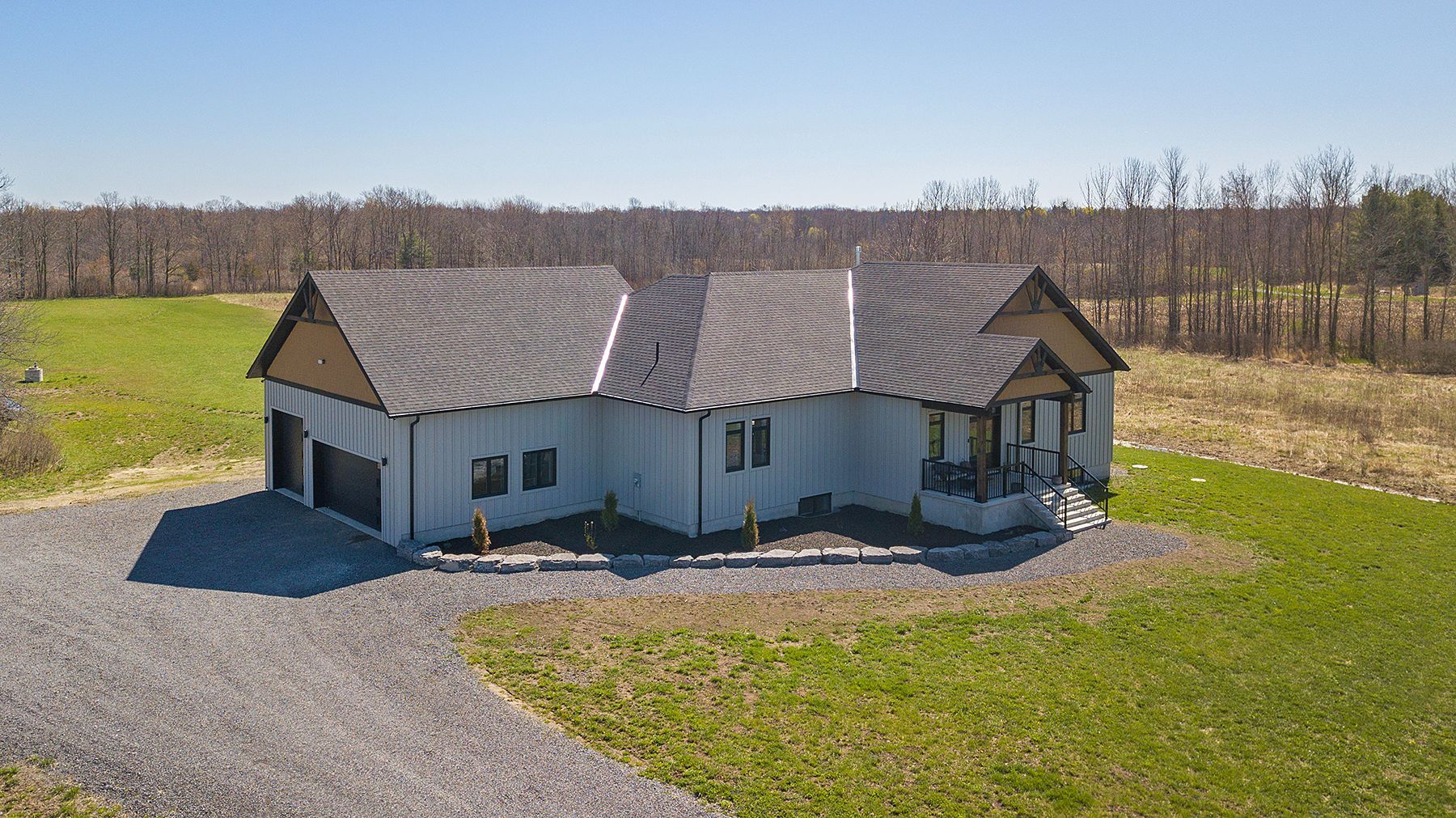 Designed to stand out and built to impress, this custom bungalow offers over 4,500 sq ft of beautifully finished living space, set on 4 scenic acres. Built by reno kings with quality craftsmanship throughout, this home features an icf foundation extending to the trusses and soaring 18-foot cathedral ceilings, creating a bright, airy feel from the moment you step inside. The open-concept main level is finished with engineered white oak hardwood flooring, blending warmth with modern design. The spacious living room centers on a sleek stucco fireplace and flows effortlessly to the expansive back deck through impressive 12-foot sliding patio doors, ideal for entertaining or simply enjoying the peaceful surroundings. With views overlooking the pond, the outdoor space offers a natural extension of the home. The kitchen is both functional and beautifully designed, complete with quartz countertops, a large island, soft-close cabinetry, and a custom coffee bar. The primary suite offers a private retreat, featuring dual walk-in closets and a spa-inspired 5-piece ensuite with a soaker tub, double vanity, and glass shower. Also on the main level, you'll find a second bedroom, a full 4-piece bathroom, and a stylish powder room. A spacious mudroom with built-in storage and a convenient laundry area provides direct access to the impressive 1,200+ sq ft garage, ideal for vehicles, storage, and all the extras. The fully finished lower level offers a large rec room, two additional bedrooms, a home office, gym space, and a modern 3-piece bathroom. Perfectly positioned just outside bath, this home offers the ideal balance of privacy and convenience, with easy access to local favourites, including mackinnon brothers brewing company, a nearby golf course, waterfront access, a boat launch, and everyday amenities. Finished with exceptional attention to detail throughout, this home offers a rare opportunity to enjoy elevated country living in a beautifully designed space.