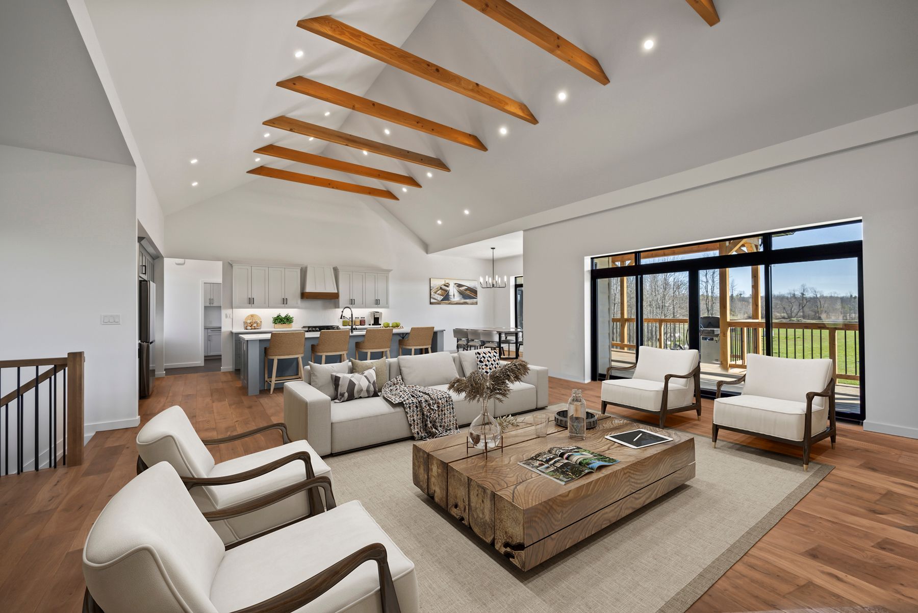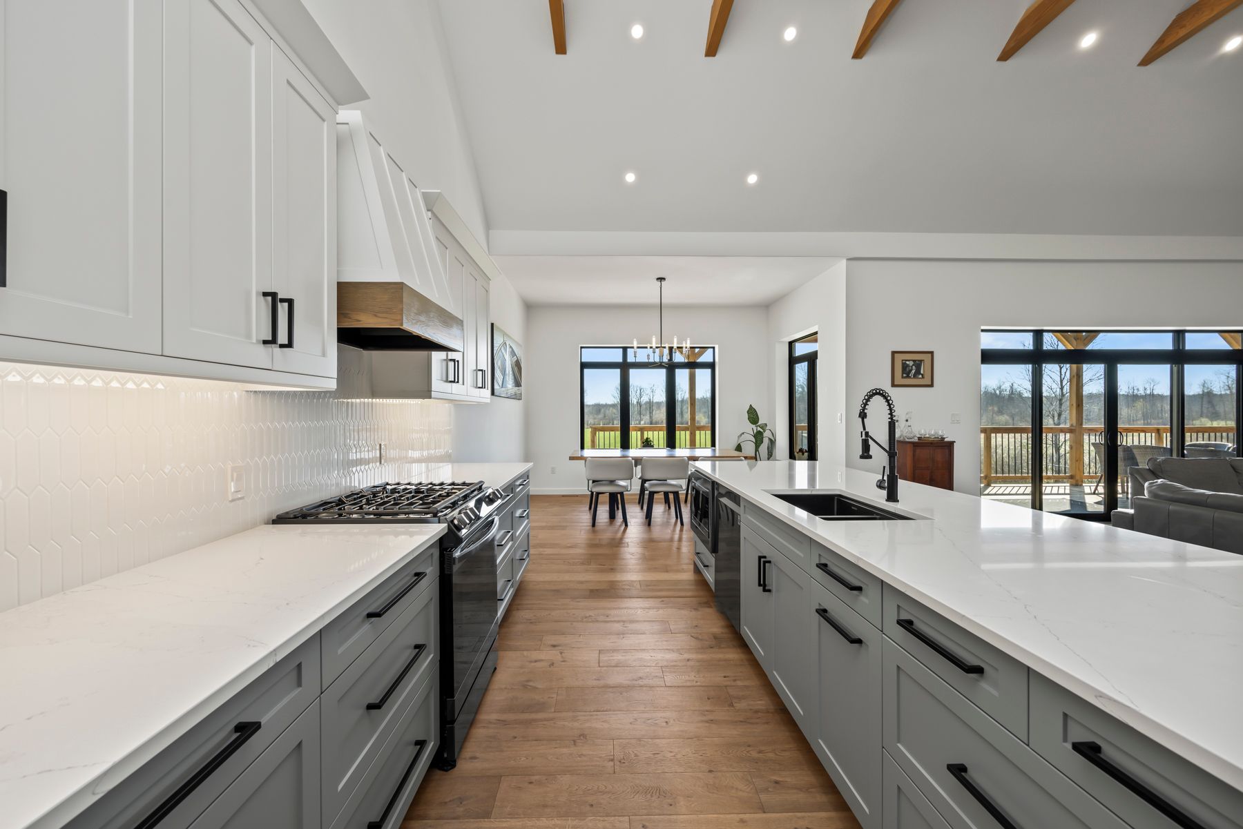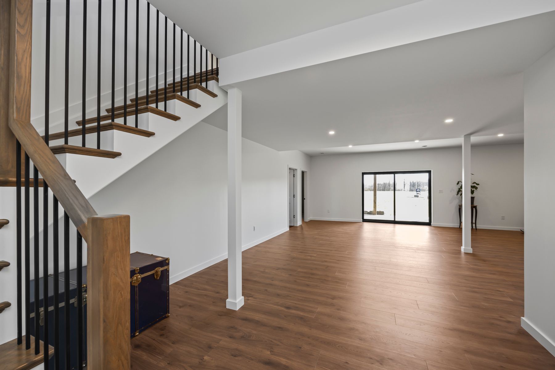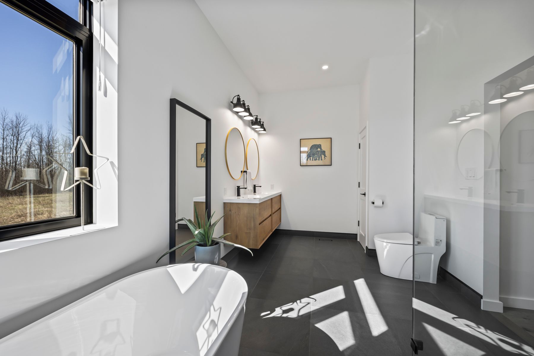 Designed to stand out and built to impress, this custom bungalow offers over 4,500 sq ft of beautifully finished living space, set on 4 scenic acres. Built by reno kings with quality craftsmanship throughout, this home features an icf foundation extending to the trusses and soaring 18-foot cathedral ceilings, creating a bright, airy feel from the moment you step inside. The open-concept main level is finished with engineered white oak hardwood flooring, blending warmth with modern design. The spacious living room centers on a sleek stucco fireplace and flows effortlessly to the expansive back deck through impressive 12-foot sliding patio doors, ideal for entertaining or simply enjoying the peaceful surroundings. With views overlooking the pond, the outdoor space offers a natural extension of the home. The kitchen is both functional and beautifully designed, complete with quartz countertops, a large island, soft-close cabinetry, and a custom coffee bar. The primary suite offers a private retreat, featuring dual walk-in closets and a spa-inspired 5-piece ensuite with a soaker tub, double vanity, and glass shower. Also on the main level, you'll find a second bedroom, a full 4-piece bathroom, and a stylish powder room. A spacious mudroom with built-in storage and a convenient laundry area provides direct access to the impressive 1,200+ sq ft garage, ideal for vehicles, storage, and all the extras. The fully finished lower level offers a large rec room, two additional bedrooms, a home office, gym space, and a modern 3-piece bathroom. Perfectly positioned just outside bath, this home offers the ideal balance of privacy and convenience, with easy access to local favourites, including mackinnon brothers brewing company, a nearby golf course, waterfront access, a boat launch, and everyday amenities. Finished with exceptional attention to detail throughout, this home offers a rare opportunity to enjoy elevated country living in a beautifully designed space.