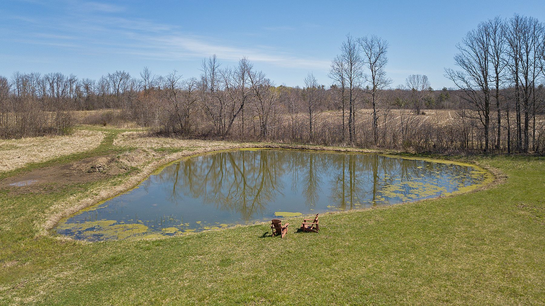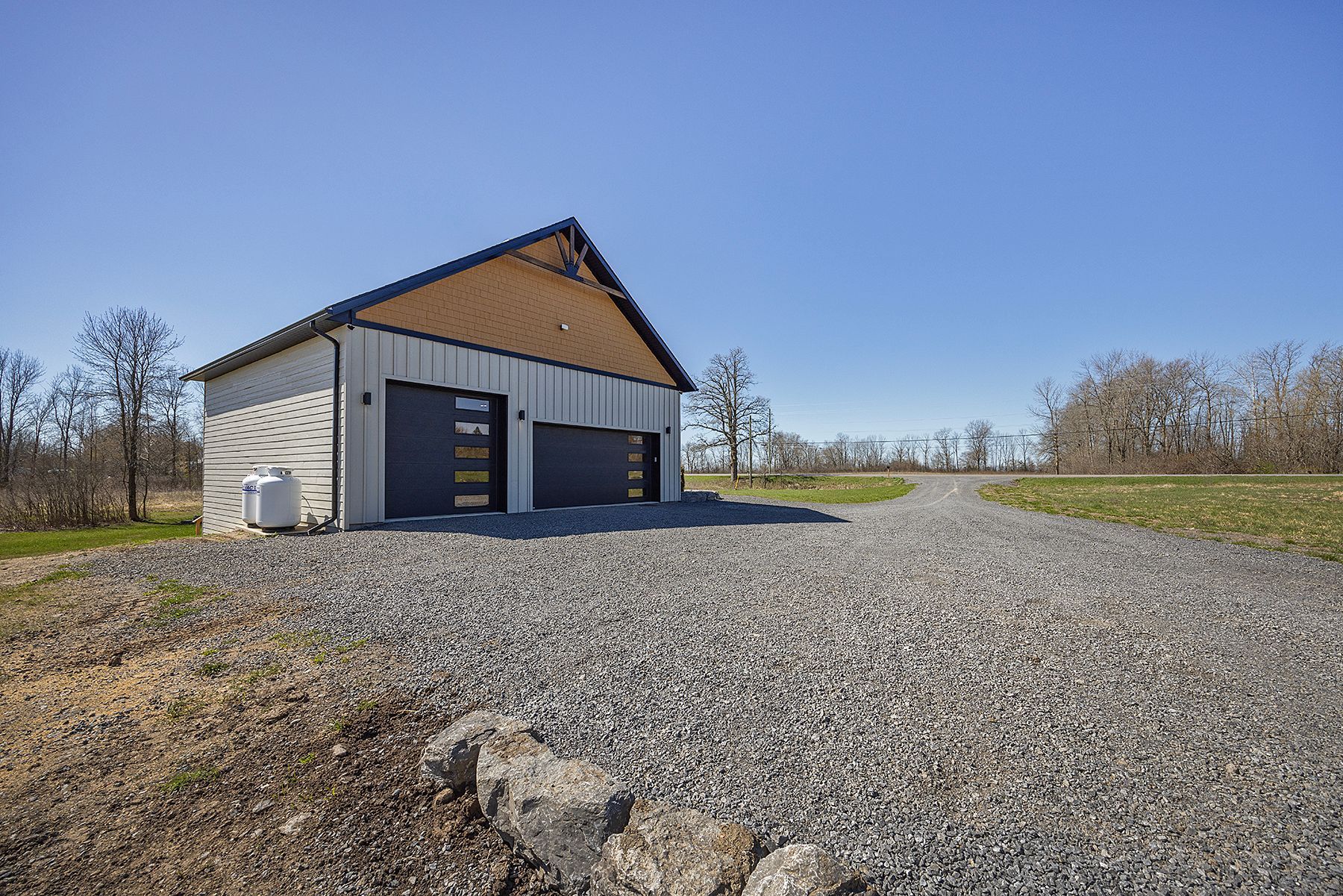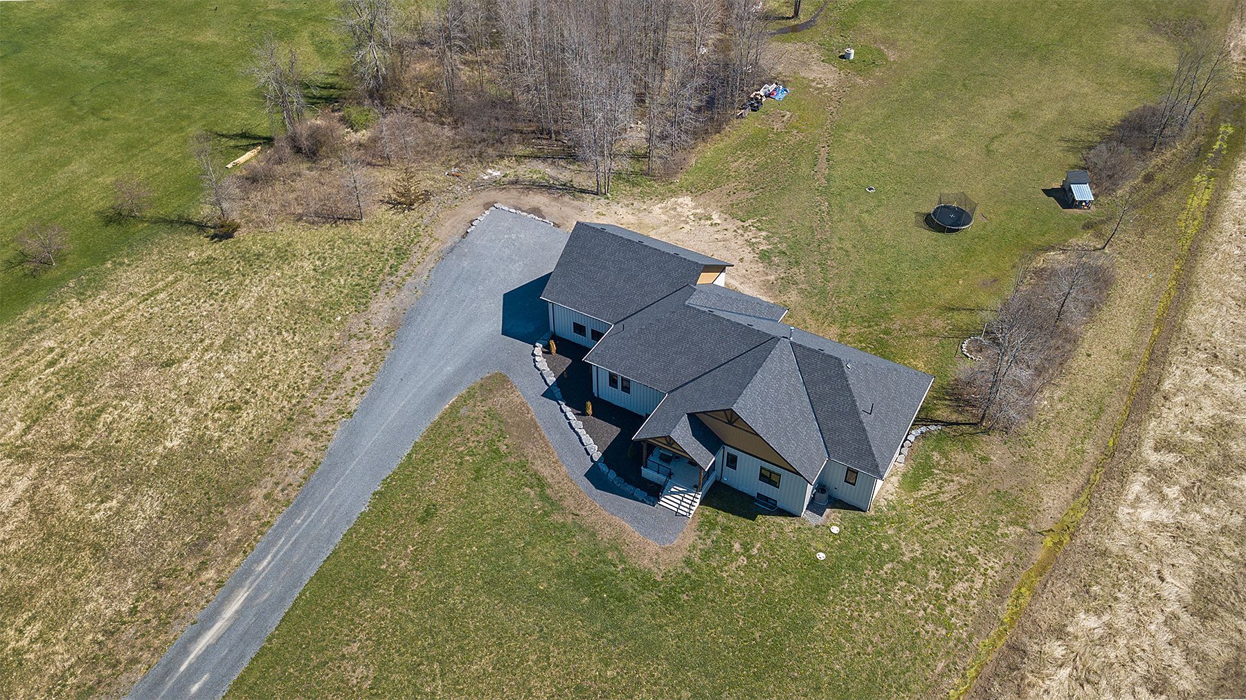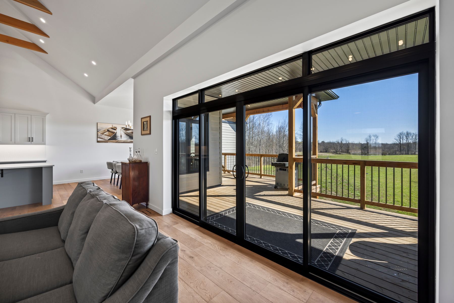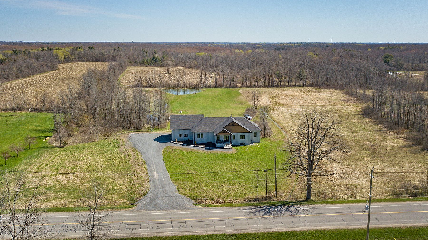 Discover luxury country living at its finest with this breathtaking custom-built bungalow by reno kings, offering over 4,500 sq ft of exceptional design on over 4 serene acres. With an icf foundation extending right up to the trusses and 18-foot cathedral ceilings, this home blends quality craftsmanship with timeless elegance. Step inside to a bright open-concept layout featuring engineered white oak hardwood floors throughout the main level. The spacious living room, centered around a sleek stucco fireplace, effortlessly flows onto a large deck through impressive 12-foot sliding patio doors, ideal for entertaining or unwinding in the fresh country air. Overlooking the peaceful pond, the deck offers the perfect spot to relax and take in the beauty of nature. The chef's kitchen is a dream come true, boasting quartz countertops, a generous island, soft-close cabinetry, and a custom coffee bar. Retreat to the primary bedroom, complete with his-and-hers walk-in closets and a luxurious 5-piece ensuite featuring a soaker tub, double sinks, and a custom glass shower, providing a spa-like experience you'll never want to leave. Also on the main level, youll find a second bedroom, an elegant 4-piece bath, and a chic powder room. A large mudroom with built-in storage and a convenient laundry room offers easy access to the expansive 1,213 sq ft garage, providing ample space for vehicles, storage, and all your toys. The fully finished lower level offers a large rec room, two additional bedrooms, a home office, a gym, and a modern 3-piece bathroom. This home offers high-end finishes, meticulous attention to detail, and country living you've been dreaming of. Don't miss out on this exquisite property and book your showing today!
