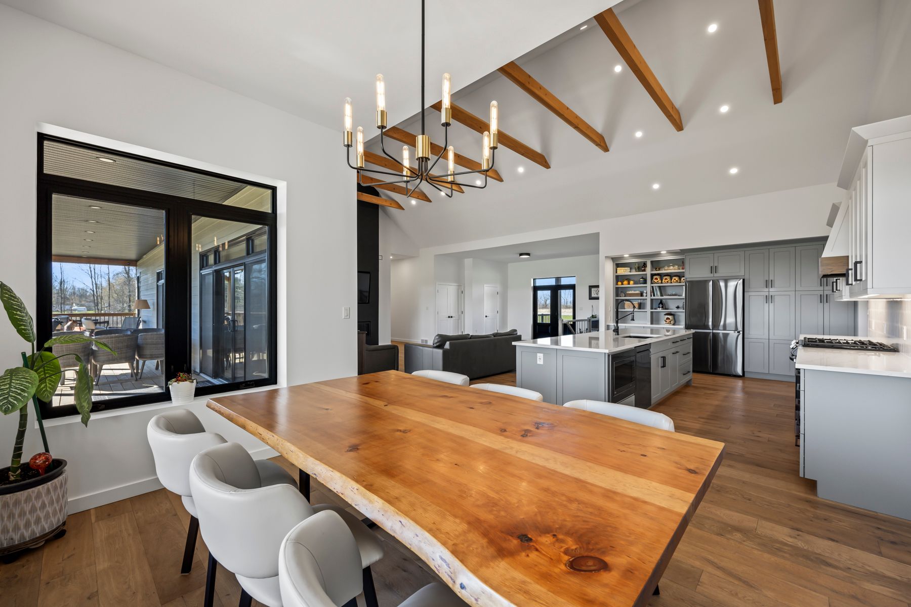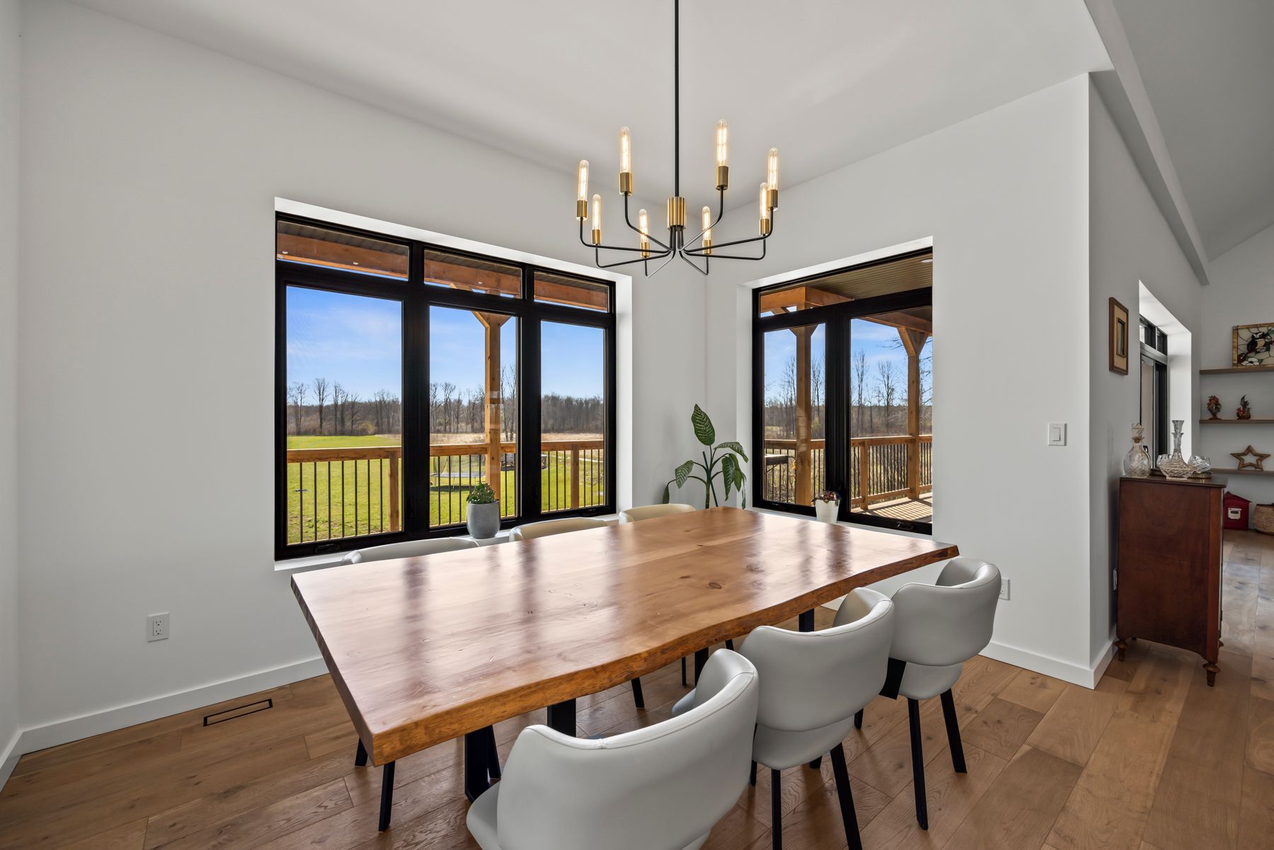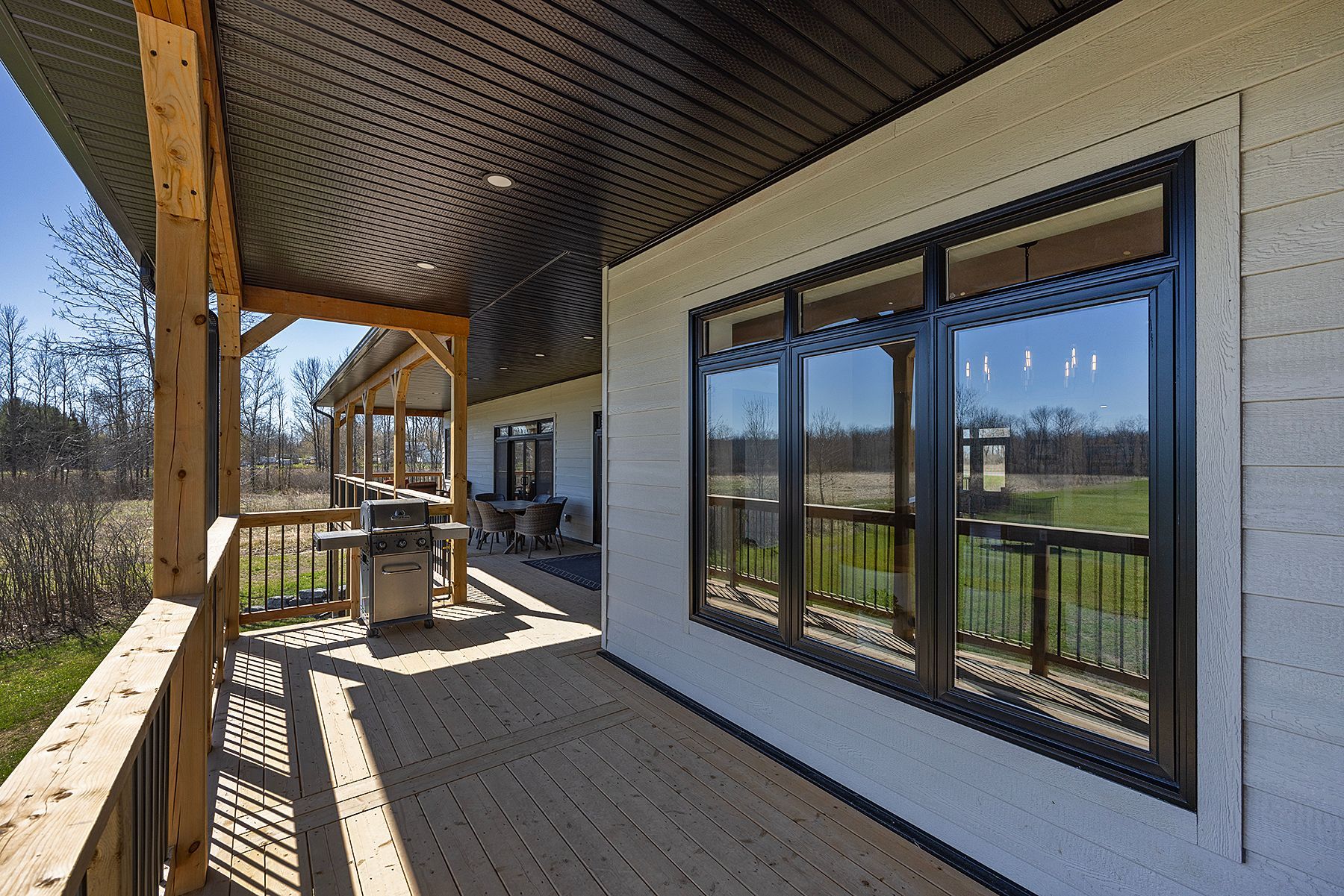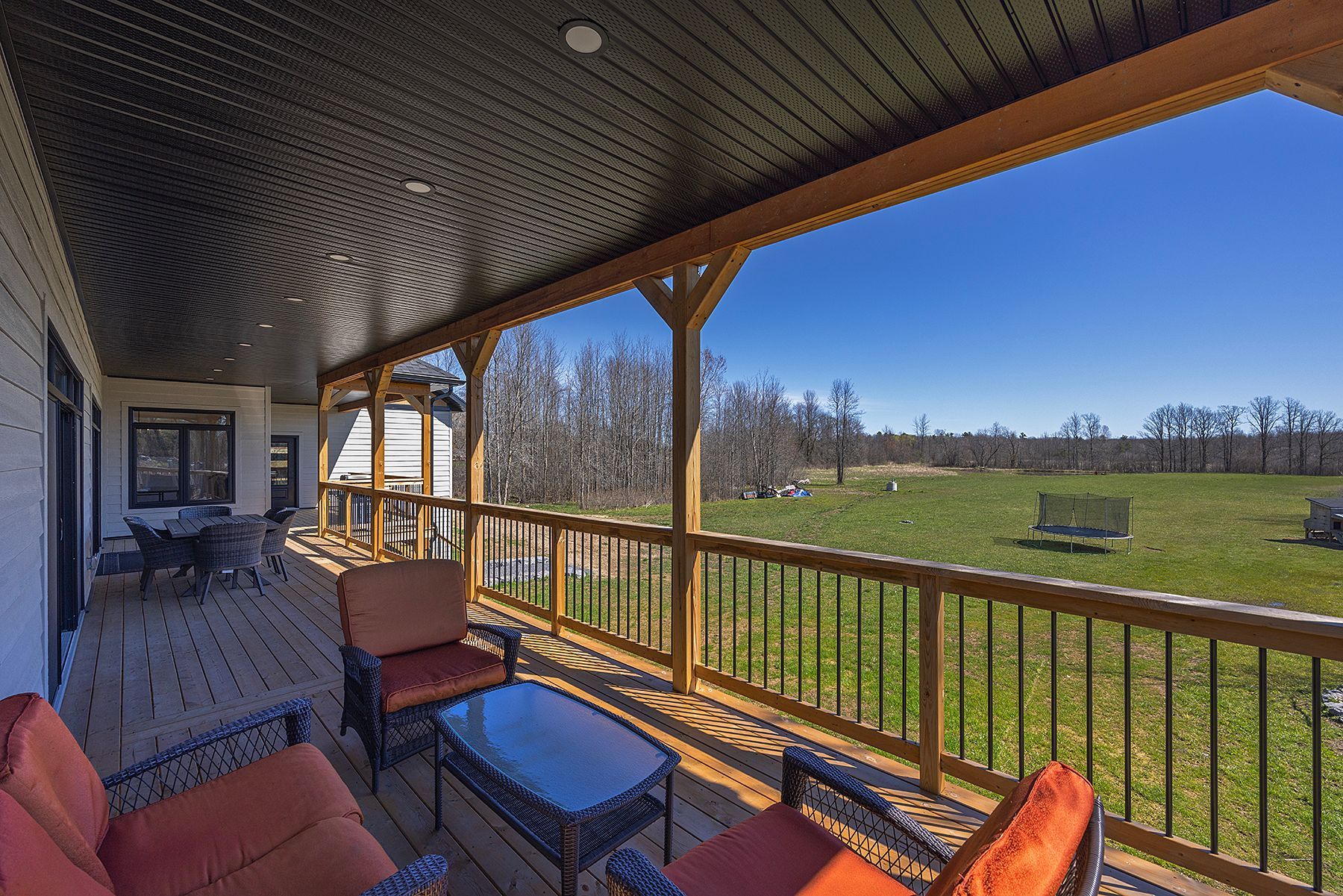 Discover luxury country living at its finest with this breathtaking custom-built bungalow by reno kings, offering over 4,500 sq ft of exceptional design on over 4 serene acres. With an icf foundation extending right up to the trusses and 18-foot cathedral ceilings, this home blends quality craftsmanship with timeless elegance. Step inside to a bright open-concept layout featuring engineered white oak hardwood floors throughout the main level. The spacious living room, centered around a sleek stucco fireplace, effortlessly flows onto a large deck through impressive 12-foot sliding patio doors, ideal for entertaining or unwinding in the fresh country air. Overlooking the peaceful pond, the deck offers the perfect spot to relax and take in the beauty of nature. The chef's kitchen is a dream come true, boasting quartz countertops, a generous island, soft-close cabinetry, and a custom coffee bar. Retreat to the primary bedroom, complete with his-and-hers walk-in closets and a luxurious 5-piece ensuite featuring a soaker tub, double sinks, and a custom glass shower, providing a spa-like experience you'll never want to leave. Also on the main level, youll find a second bedroom, an elegant 4-piece bath, and a chic powder room. A large mudroom with built-in storage and a convenient laundry room offers easy access to the expansive 1,213 sq ft garage, providing ample space for vehicles, storage, and all your toys. The fully finished lower level offers a large rec room, two additional bedrooms, a home office, a gym, and a modern 3-piece bathroom. This home offers high-end finishes, meticulous attention to detail, and country living you've been dreaming of. Don't miss out on this exquisite property and book your showing today!