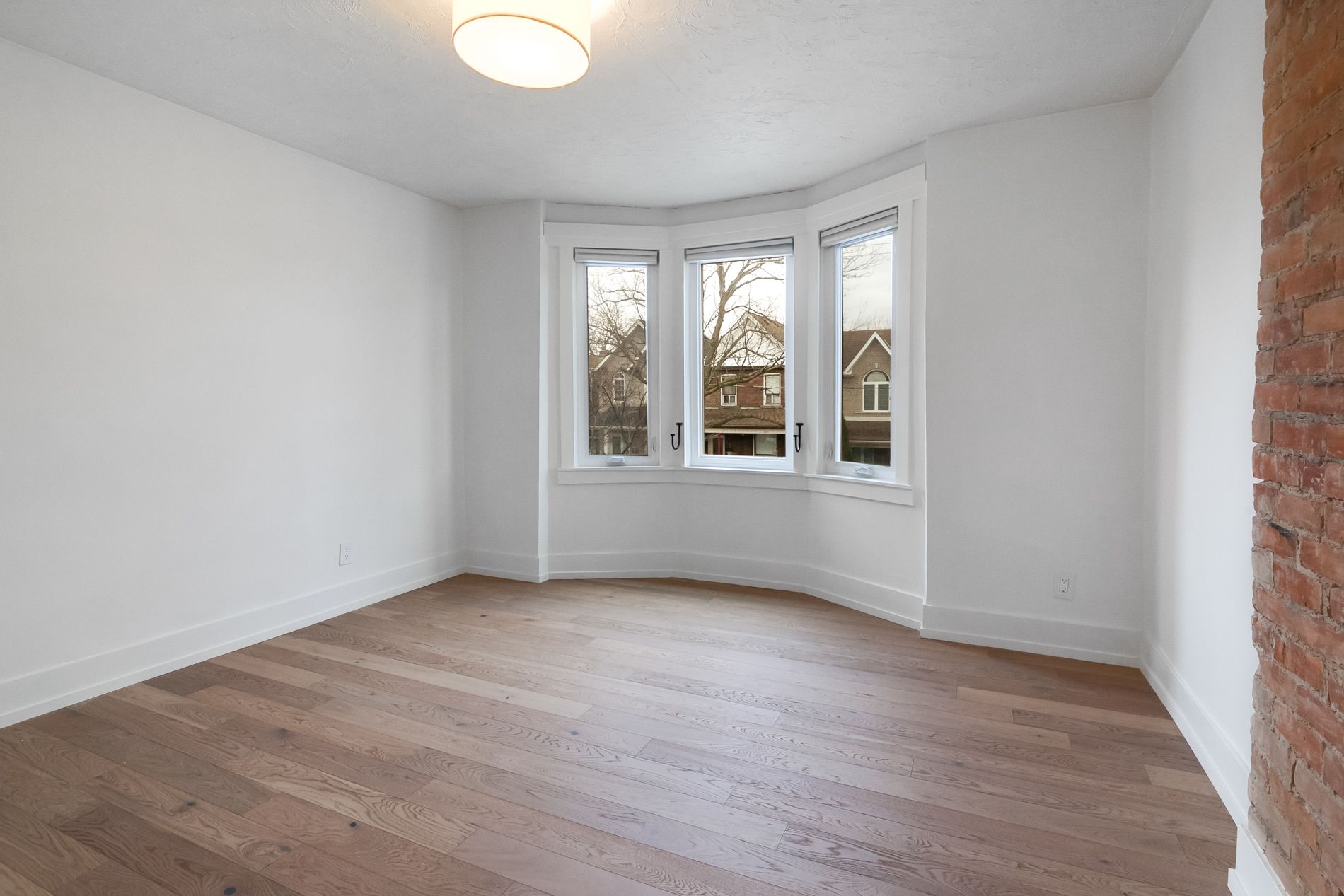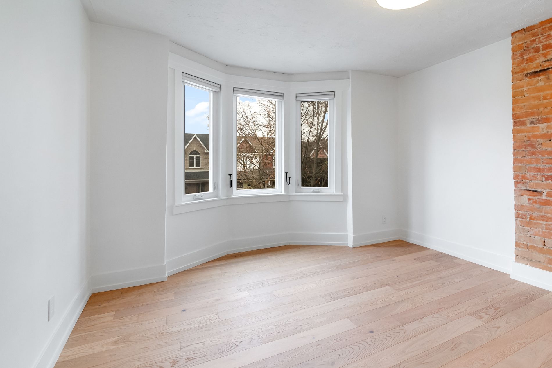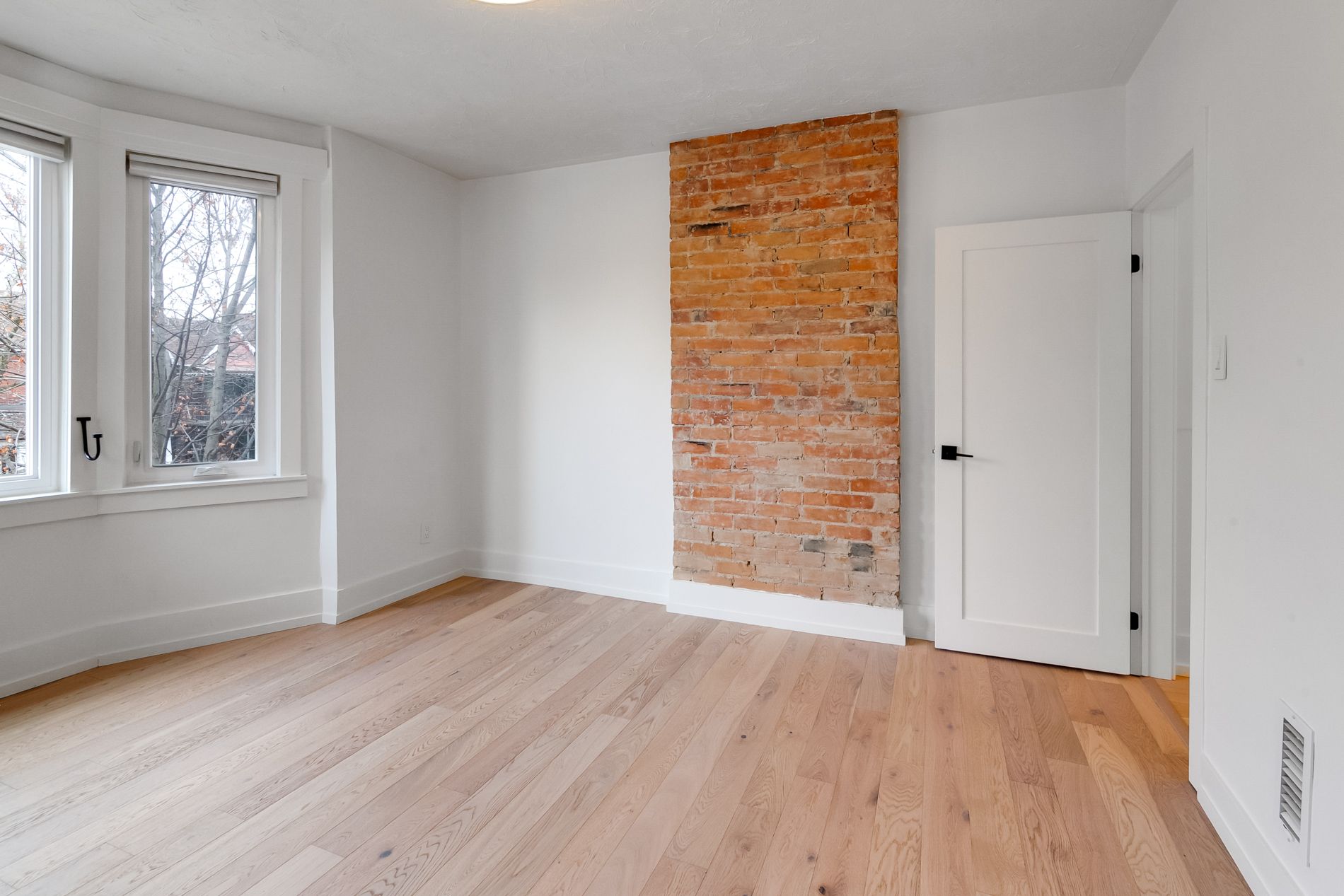 • Spacious primary bedroom with exposed brick, bay window, and large closet.