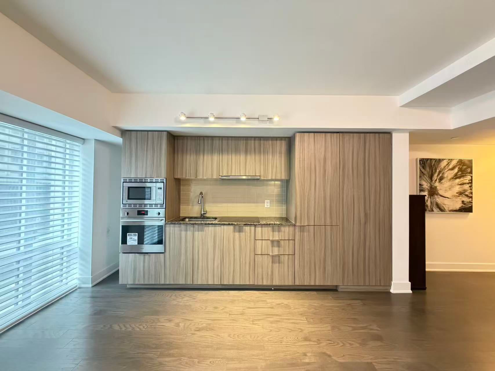 • Modern kitchen with integrated appliances and in-suite laundry for convenience.