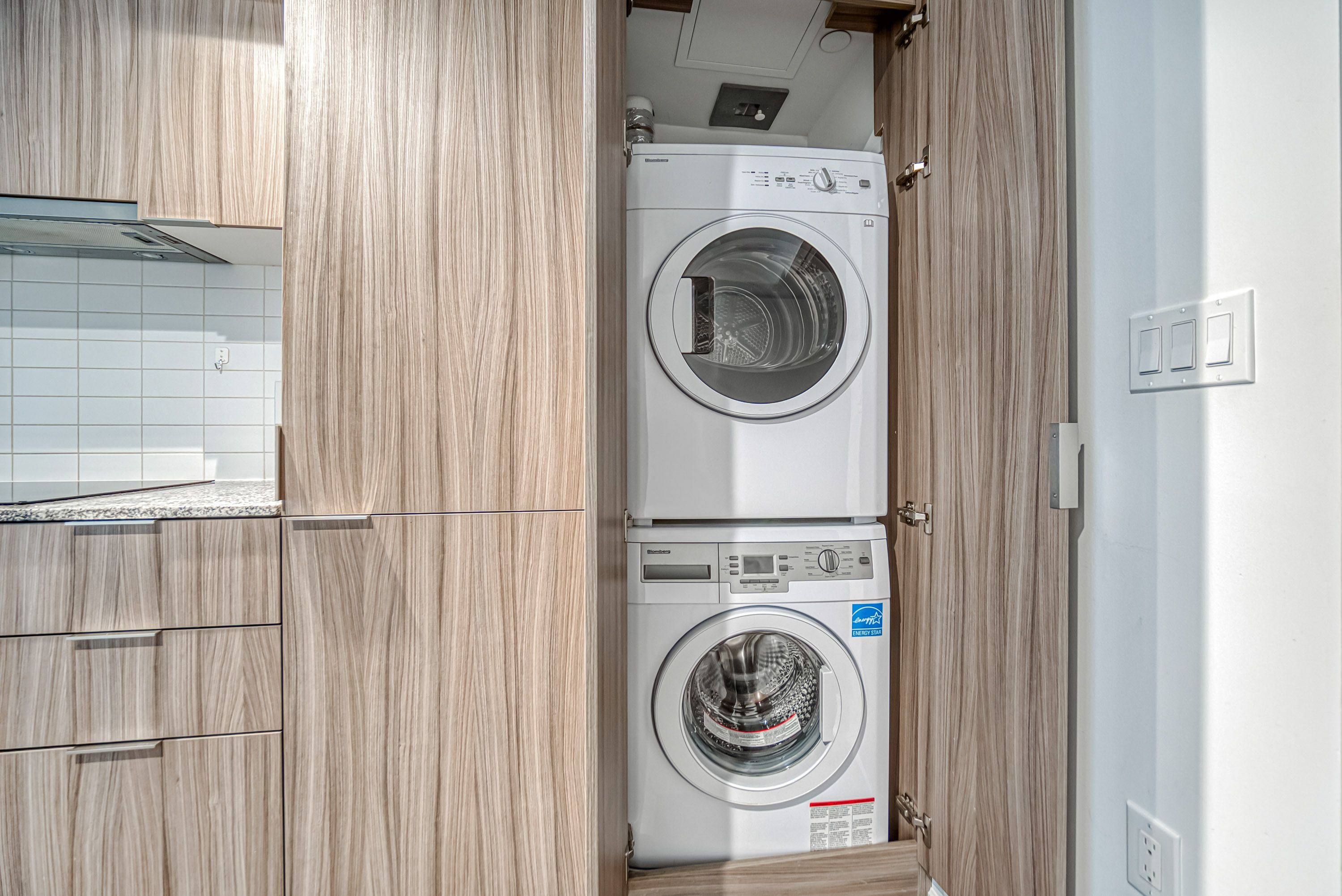 • Modern kitchen features built-in appliances and quartz countertops.
