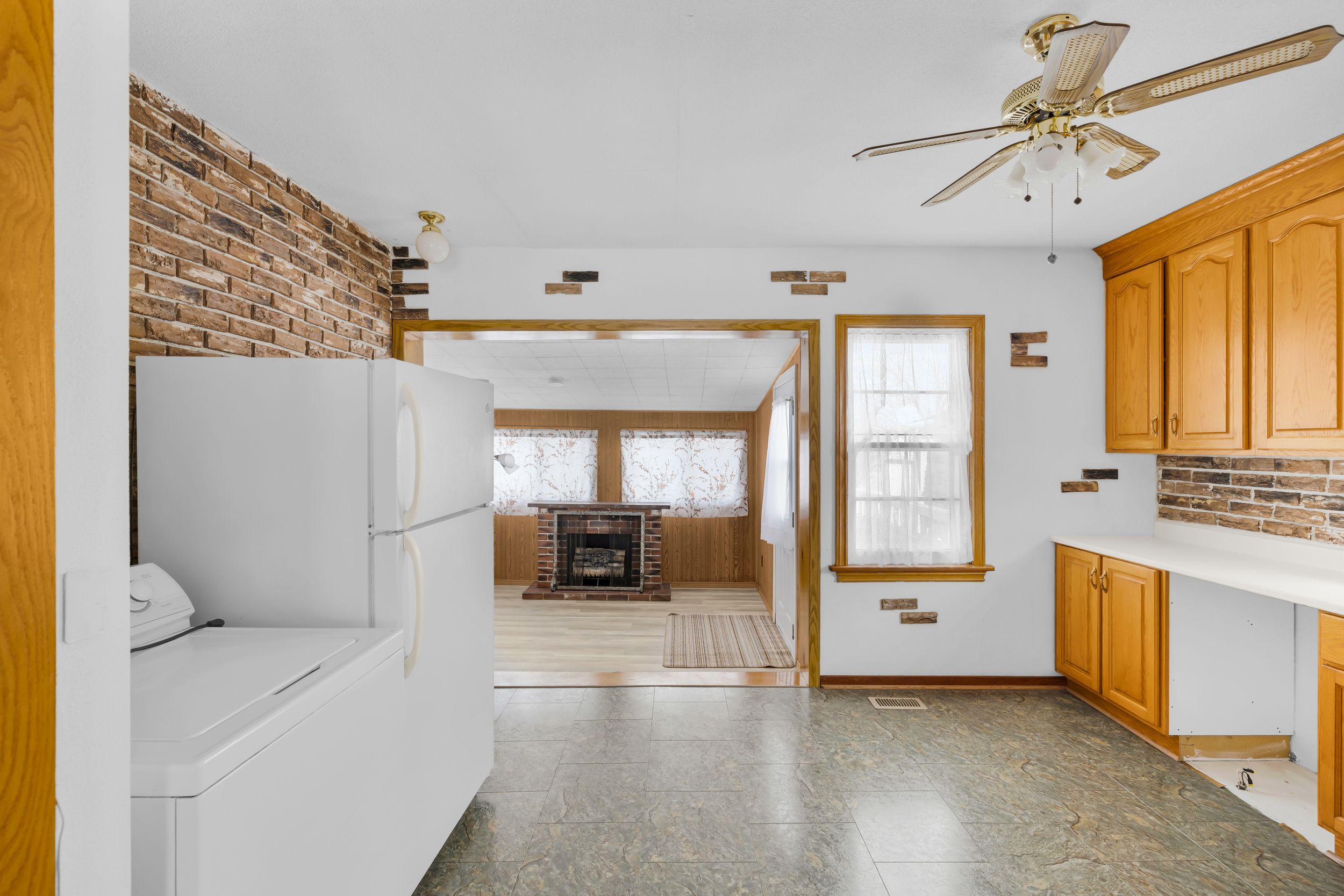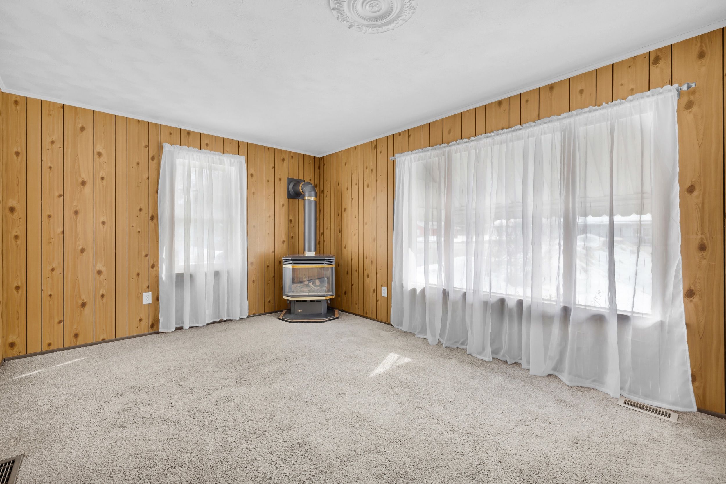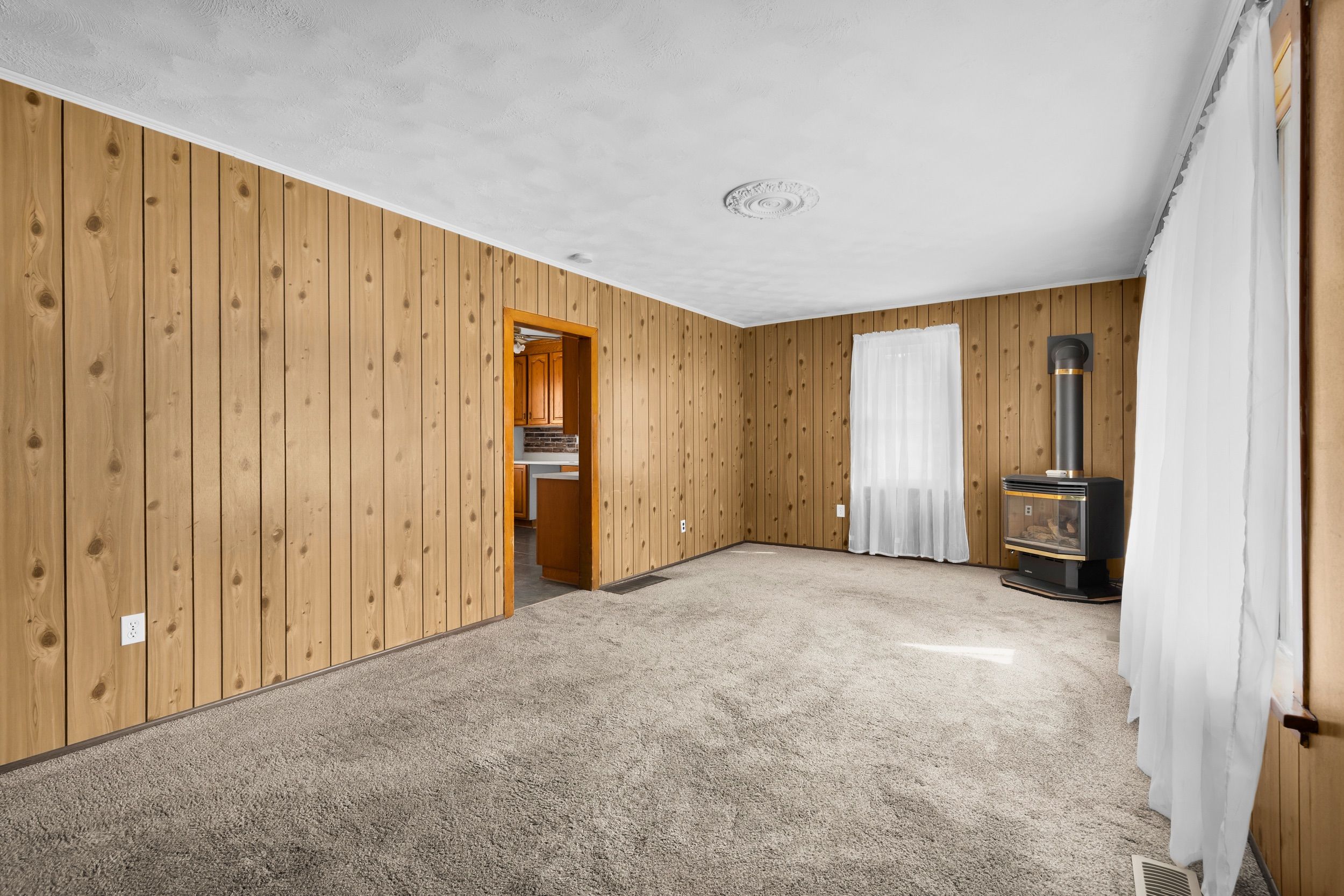 • Spacious living room with natural light and a cozy gas fireplace.