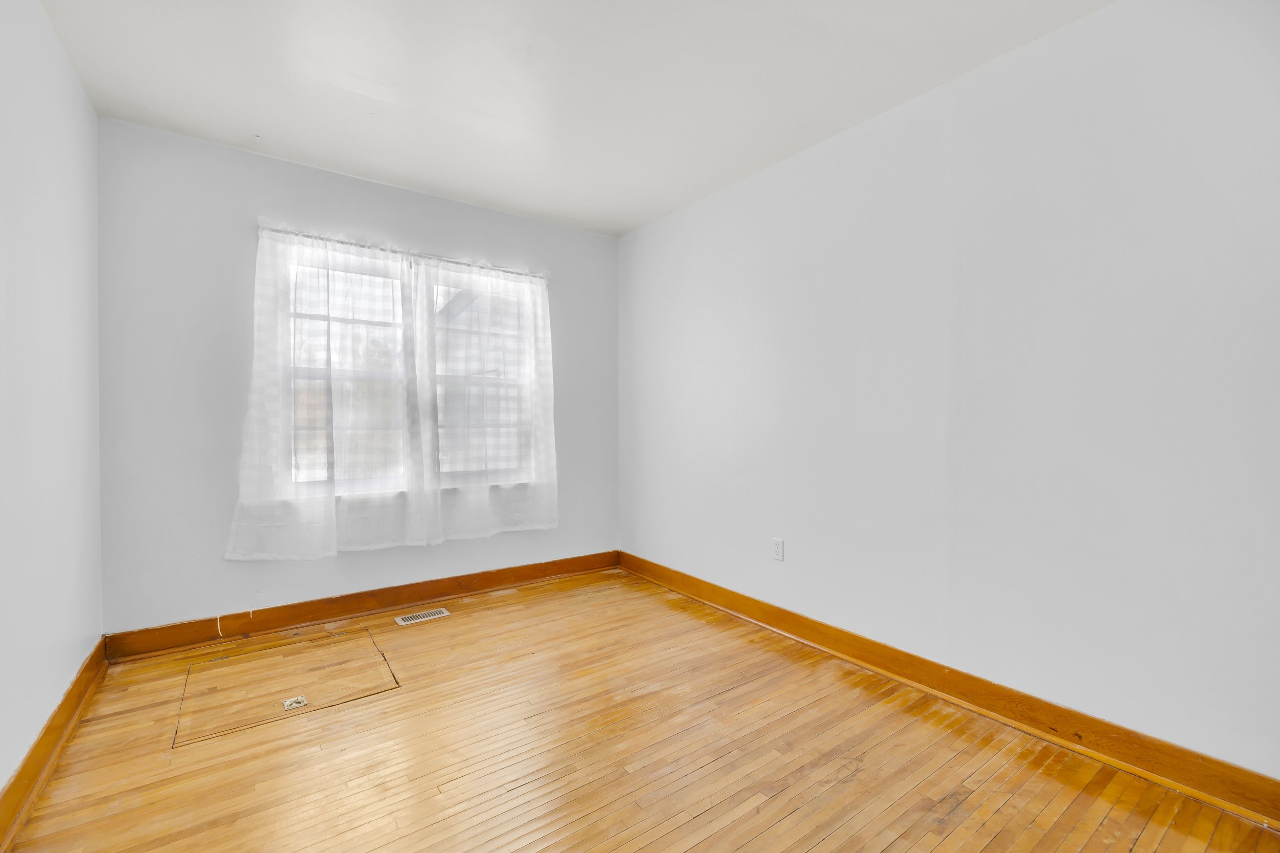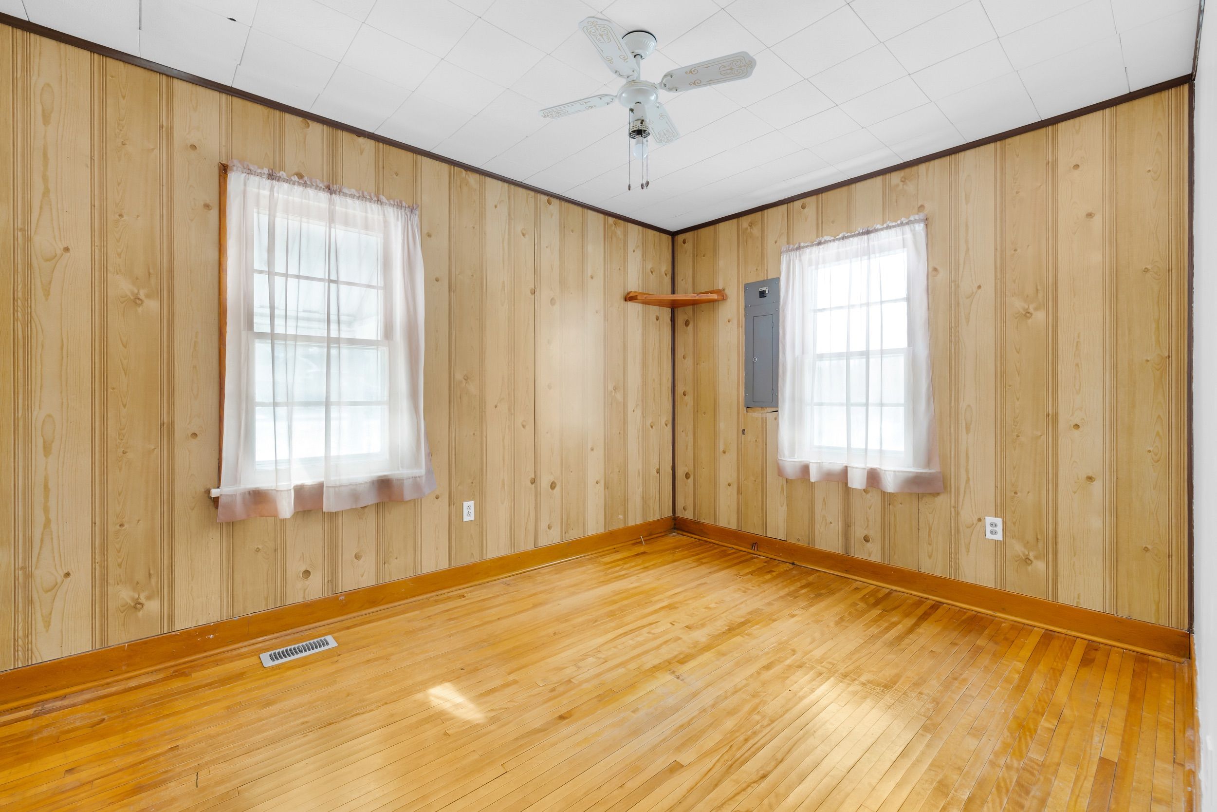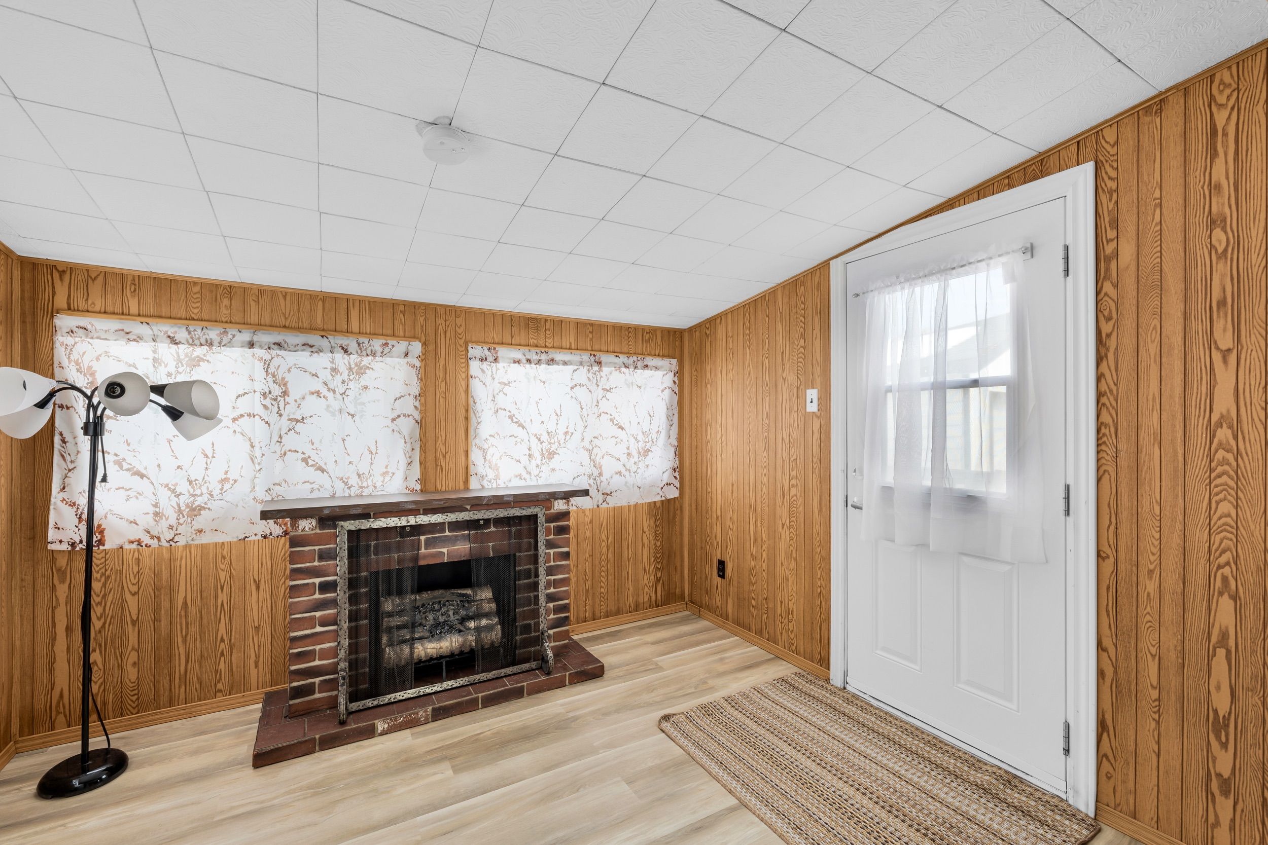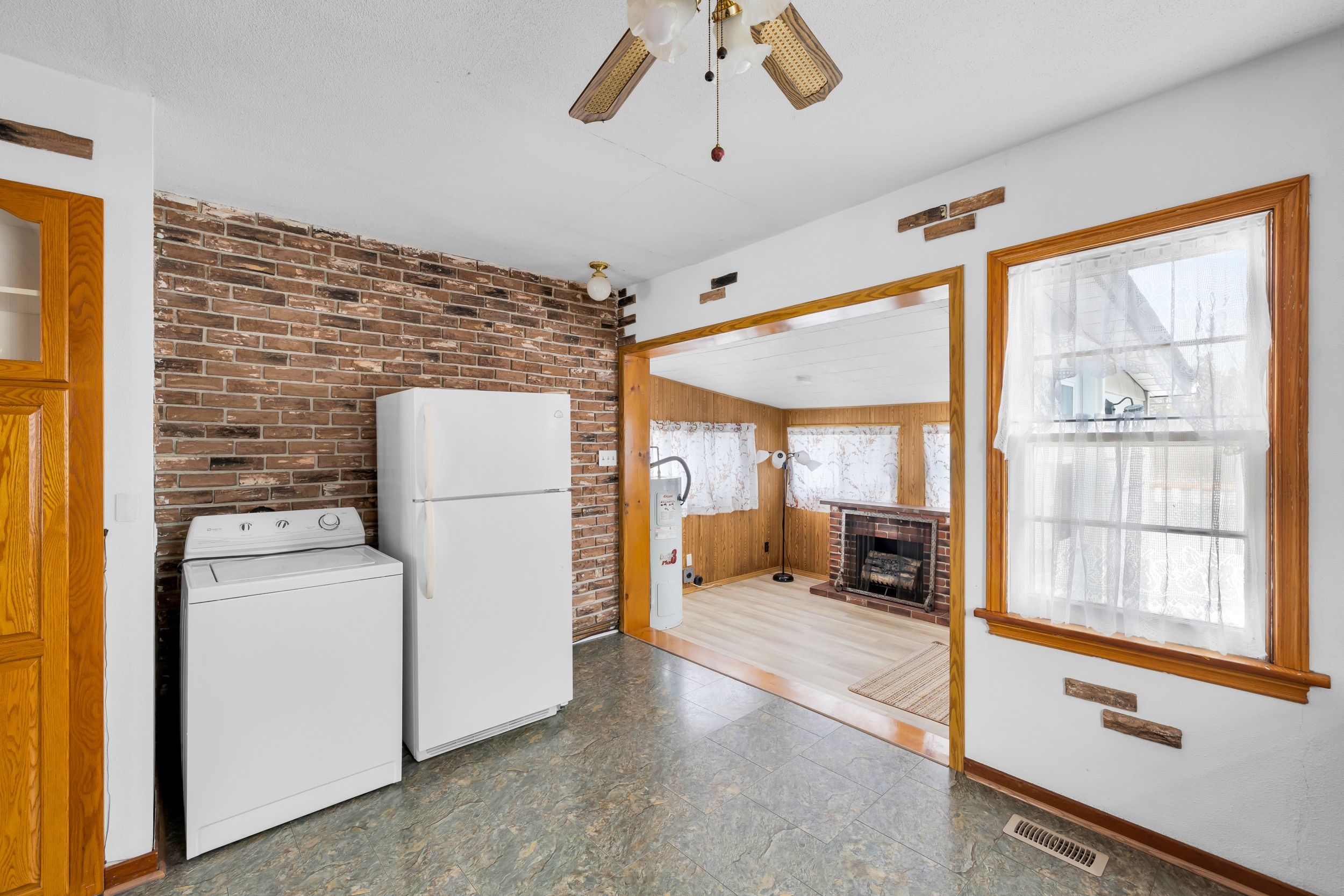 • Spacious living room with natural light and a cozy gas fireplace.