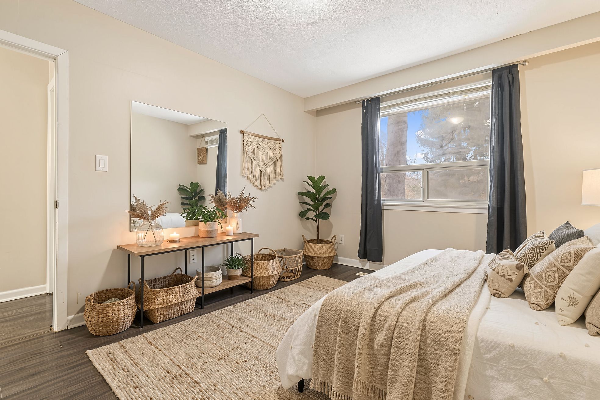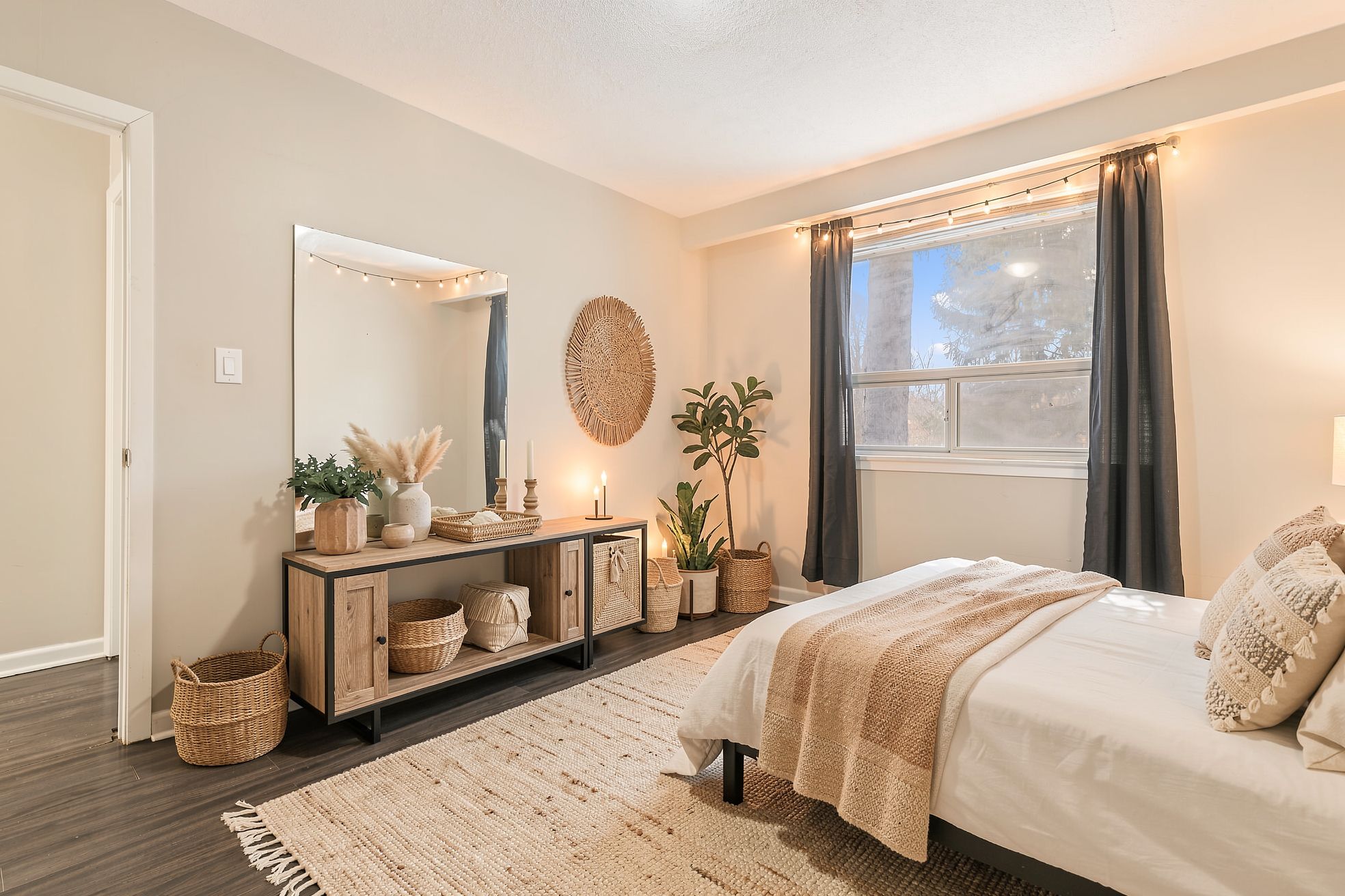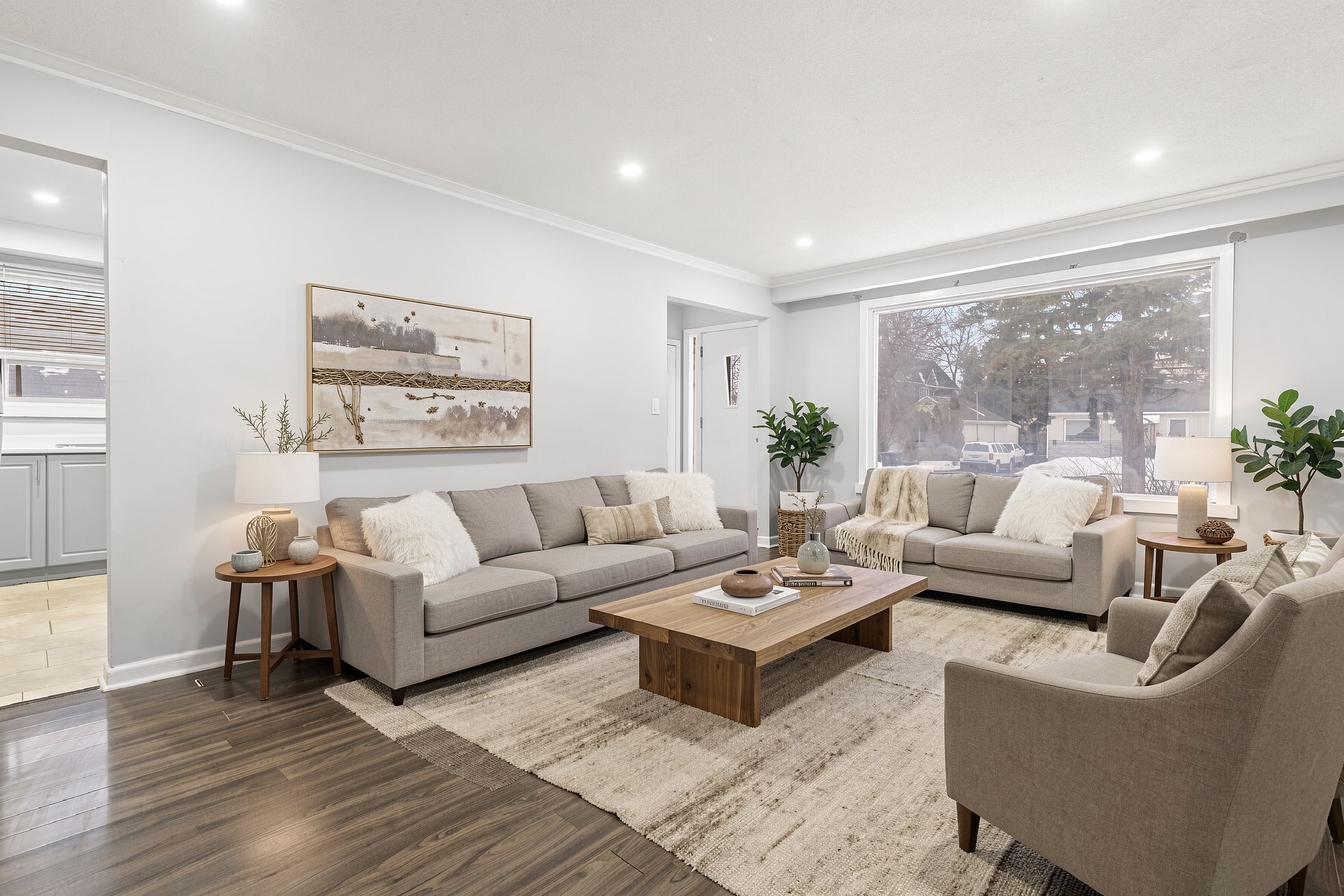 • Bright living space with natural light and laminate flooring.
