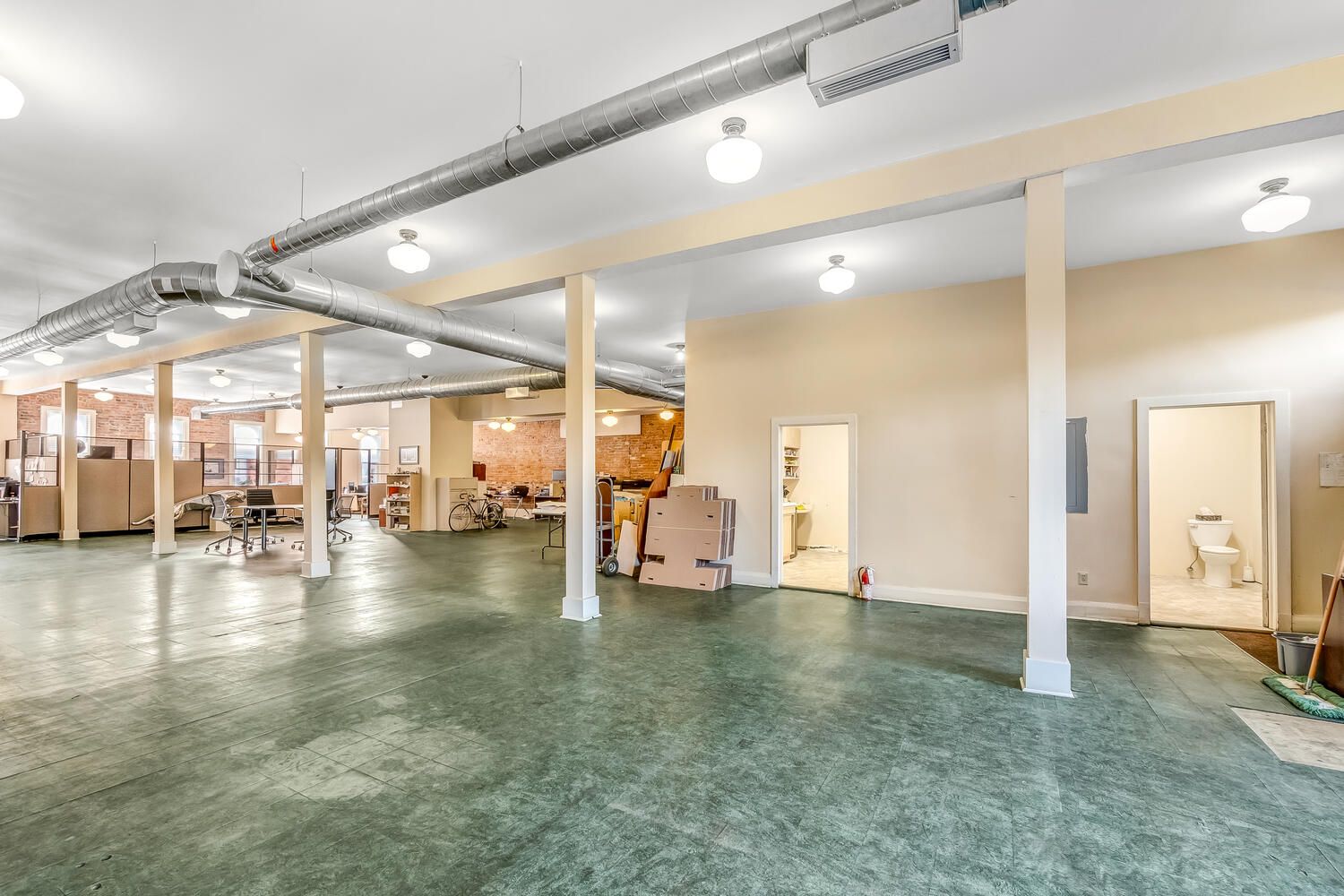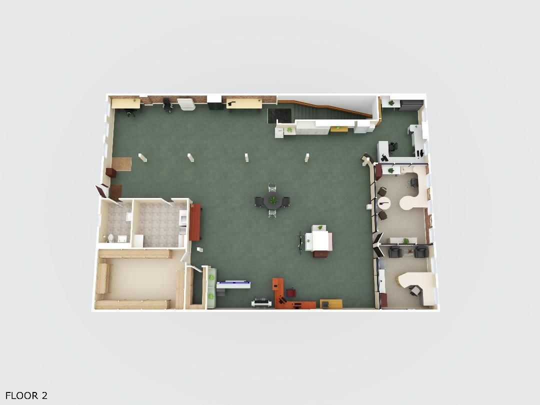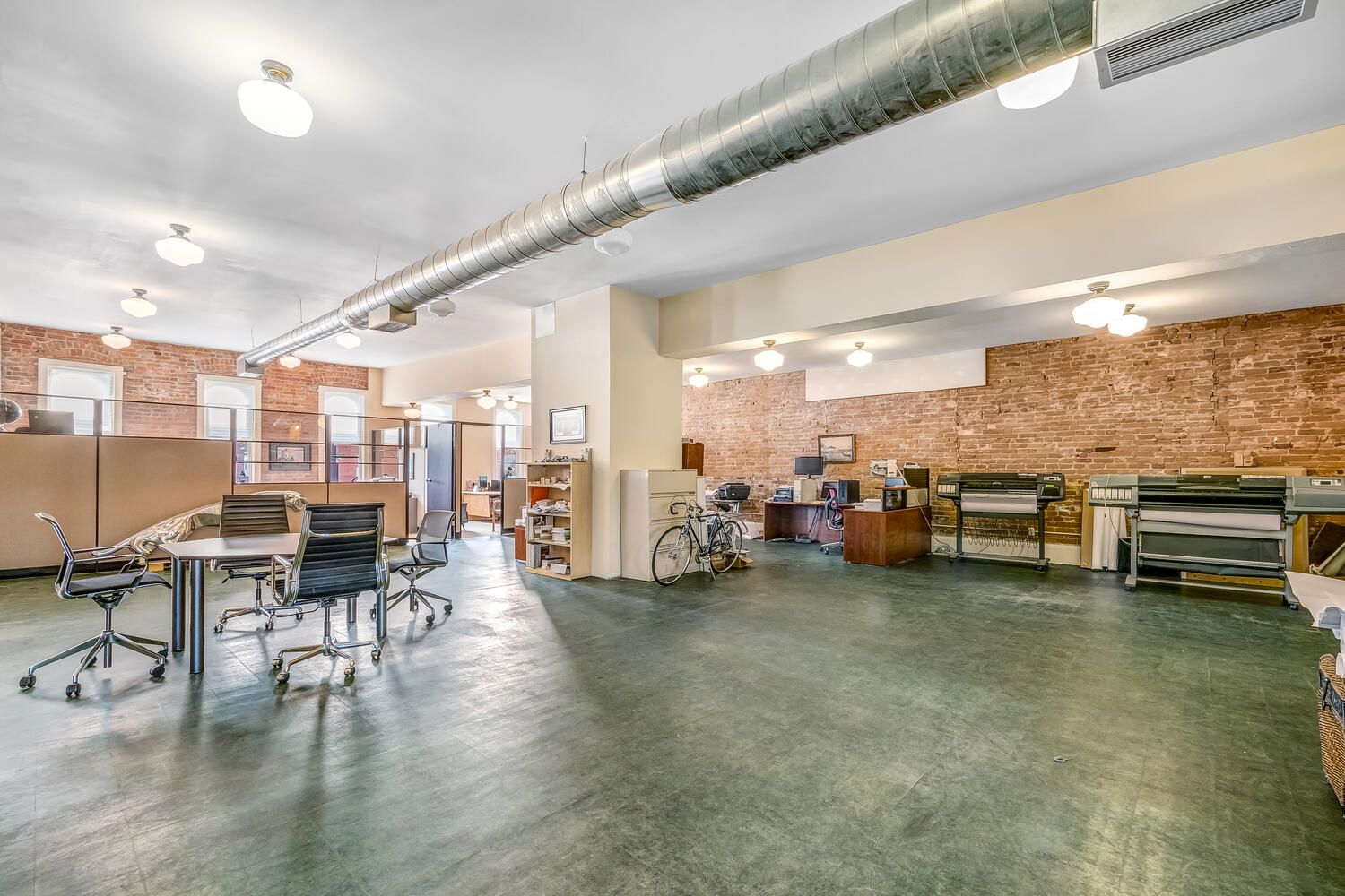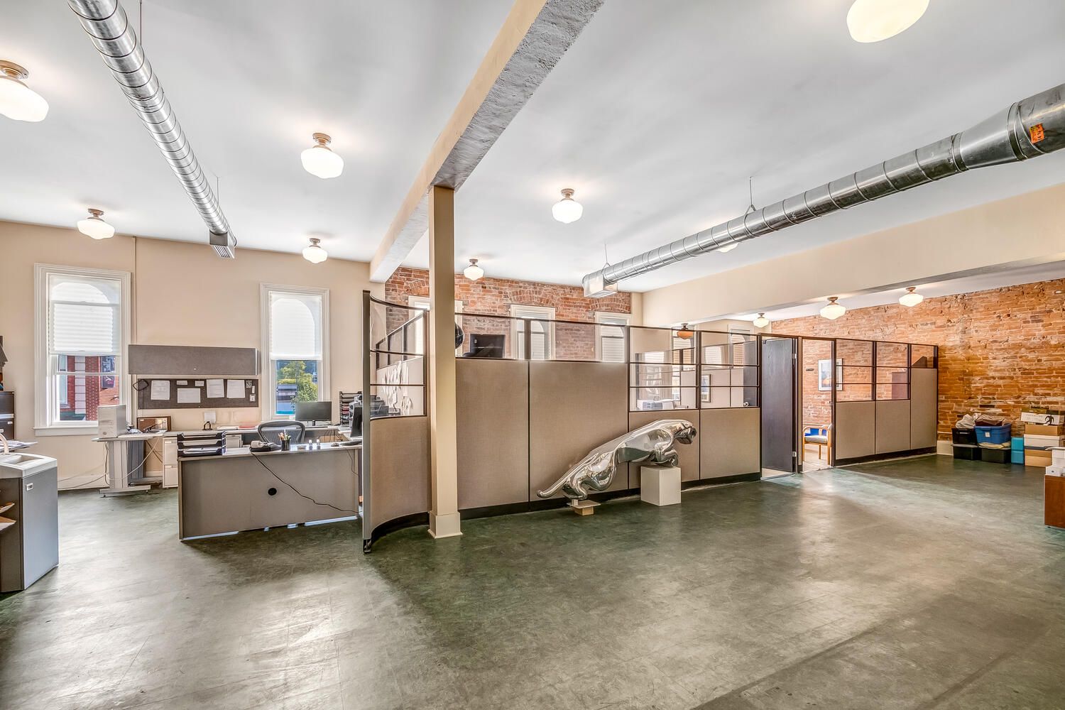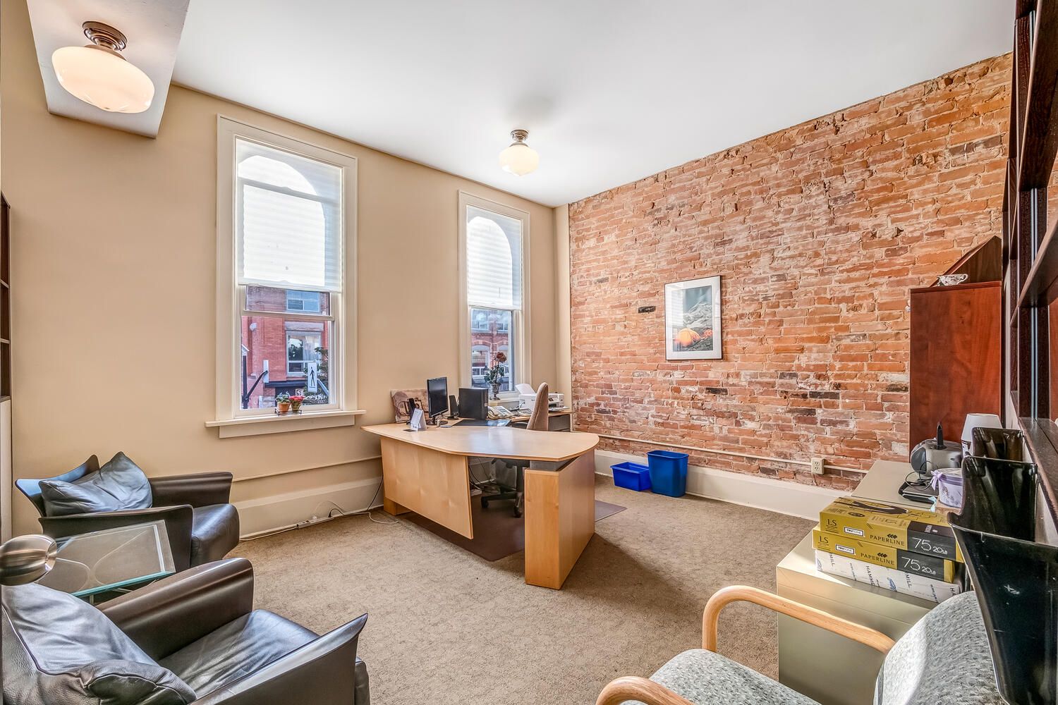 • Private second floor with large windows and flexible office setup.