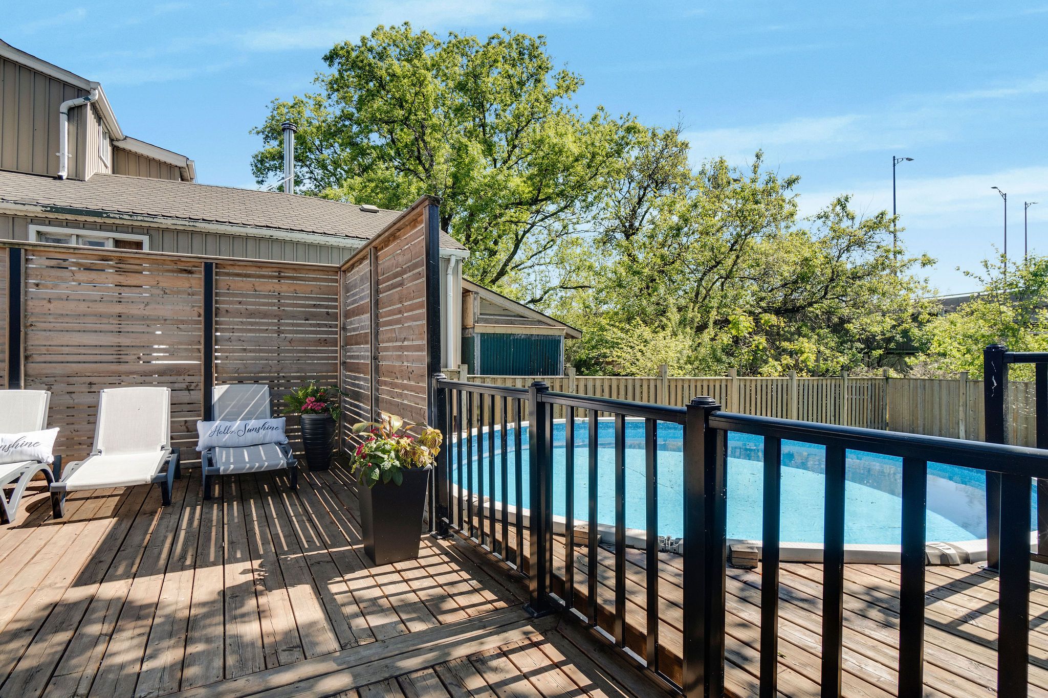 • Massive fenced backyard with a deck and cabana for outdoor enjoyment.