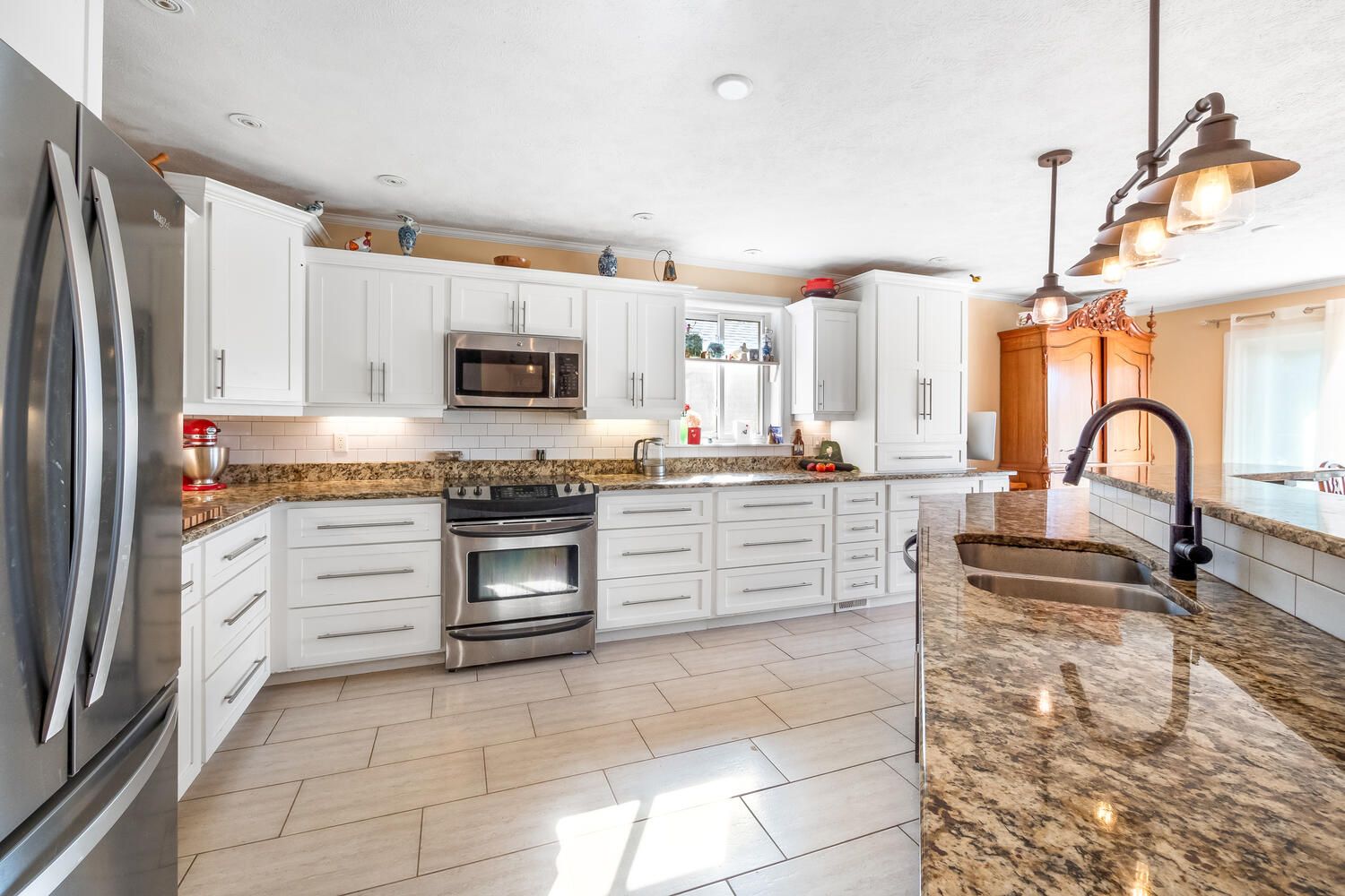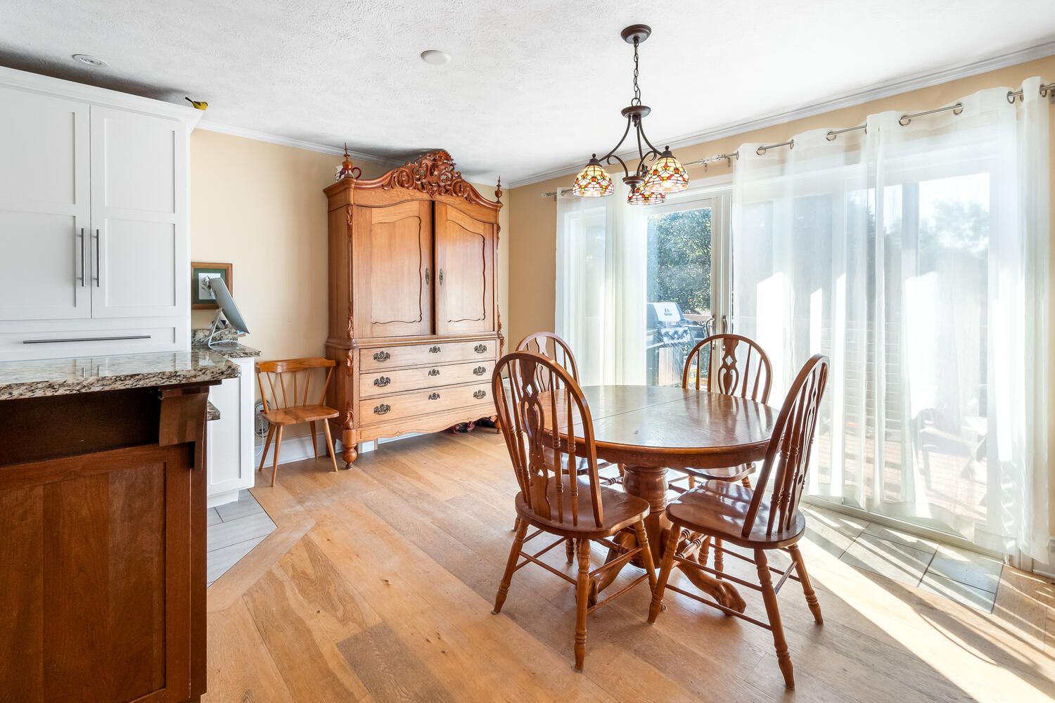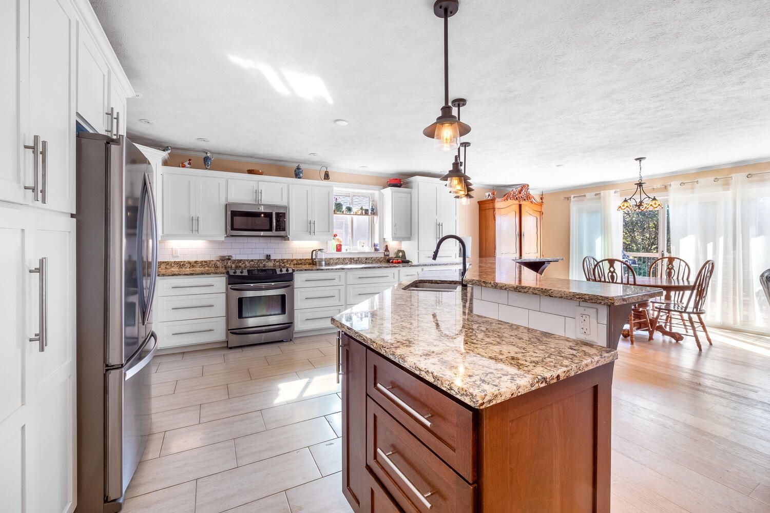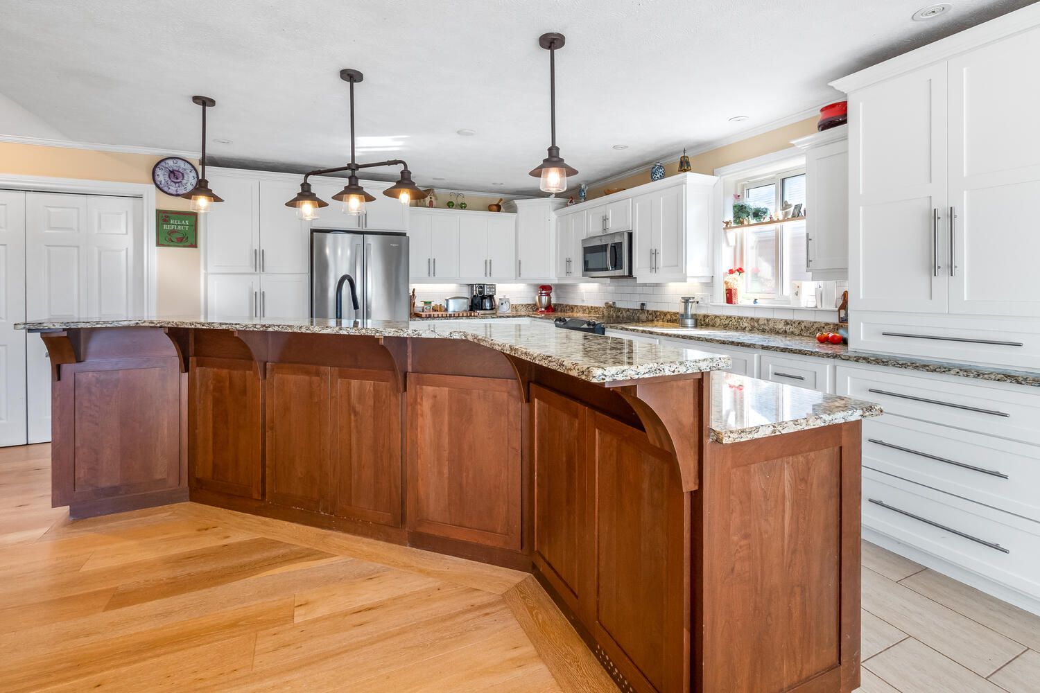 • Beautiful cherry and maple kitchen cabinets enhance the dining experience.