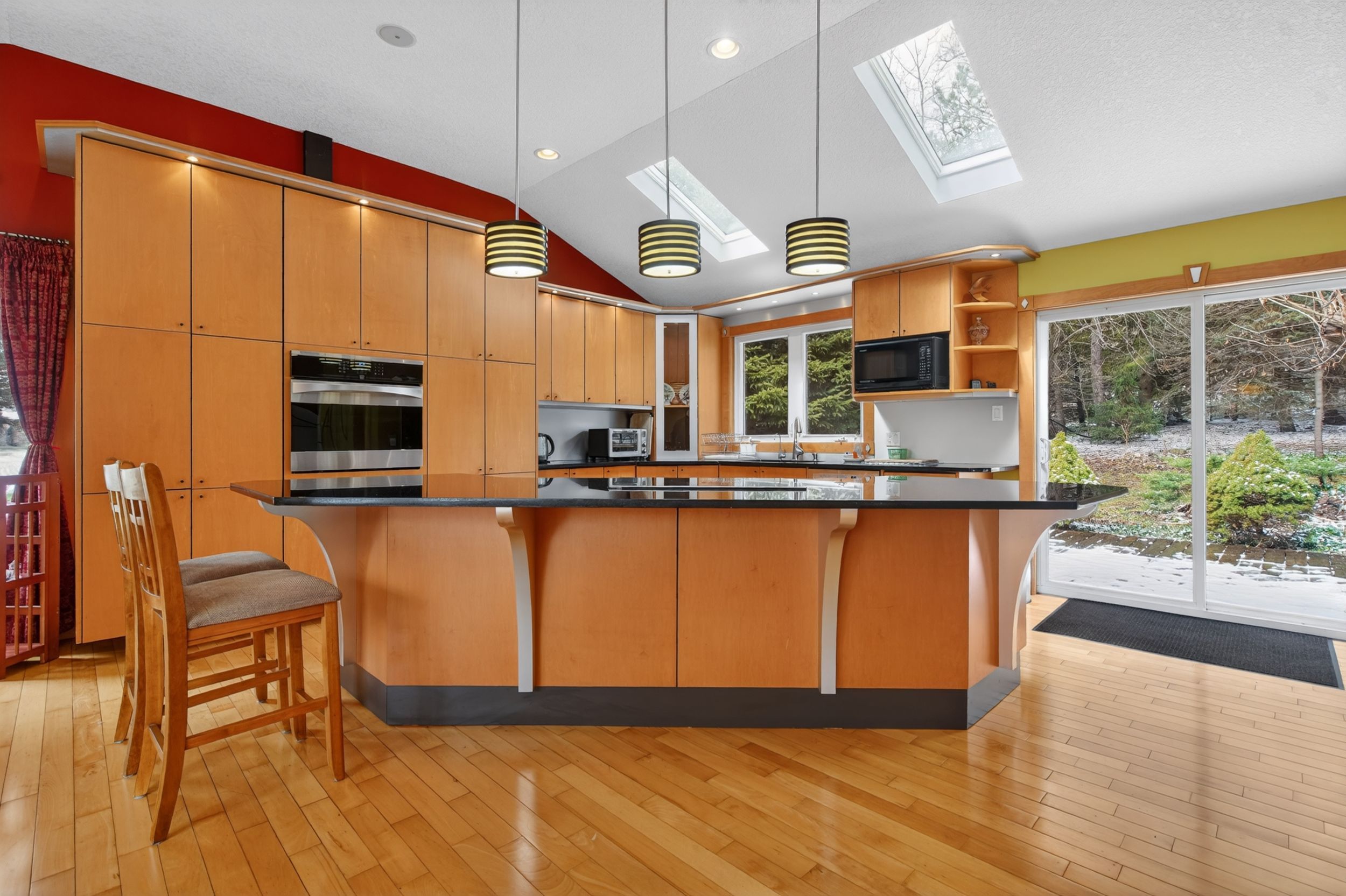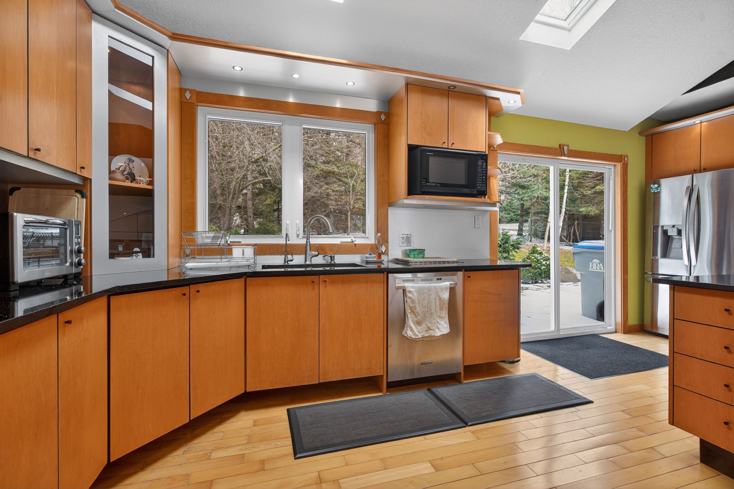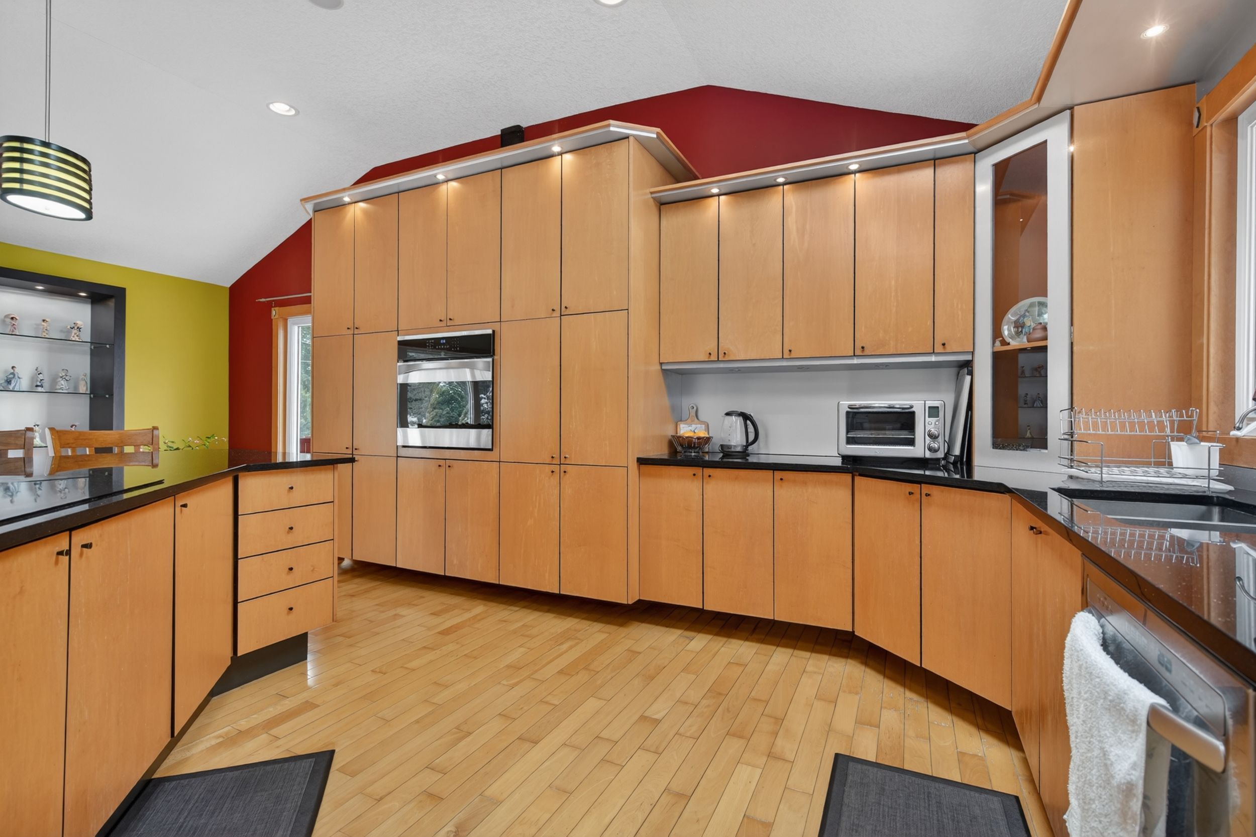• Large open concept kitchen with granite countertops and built-in appliances.