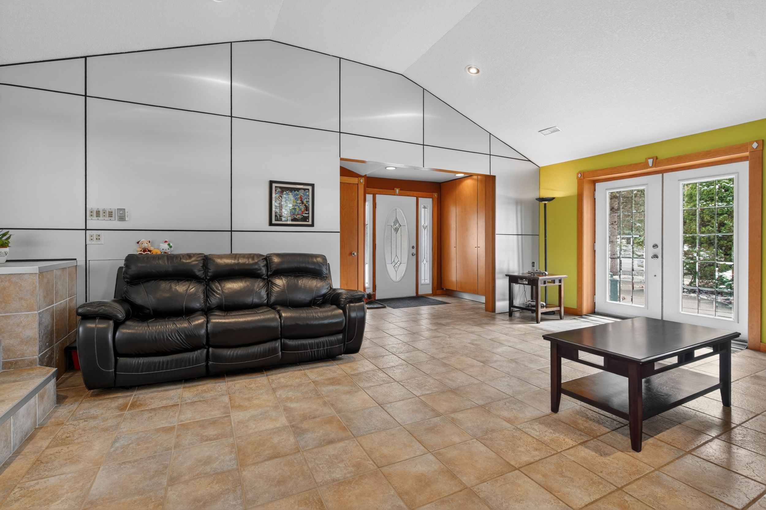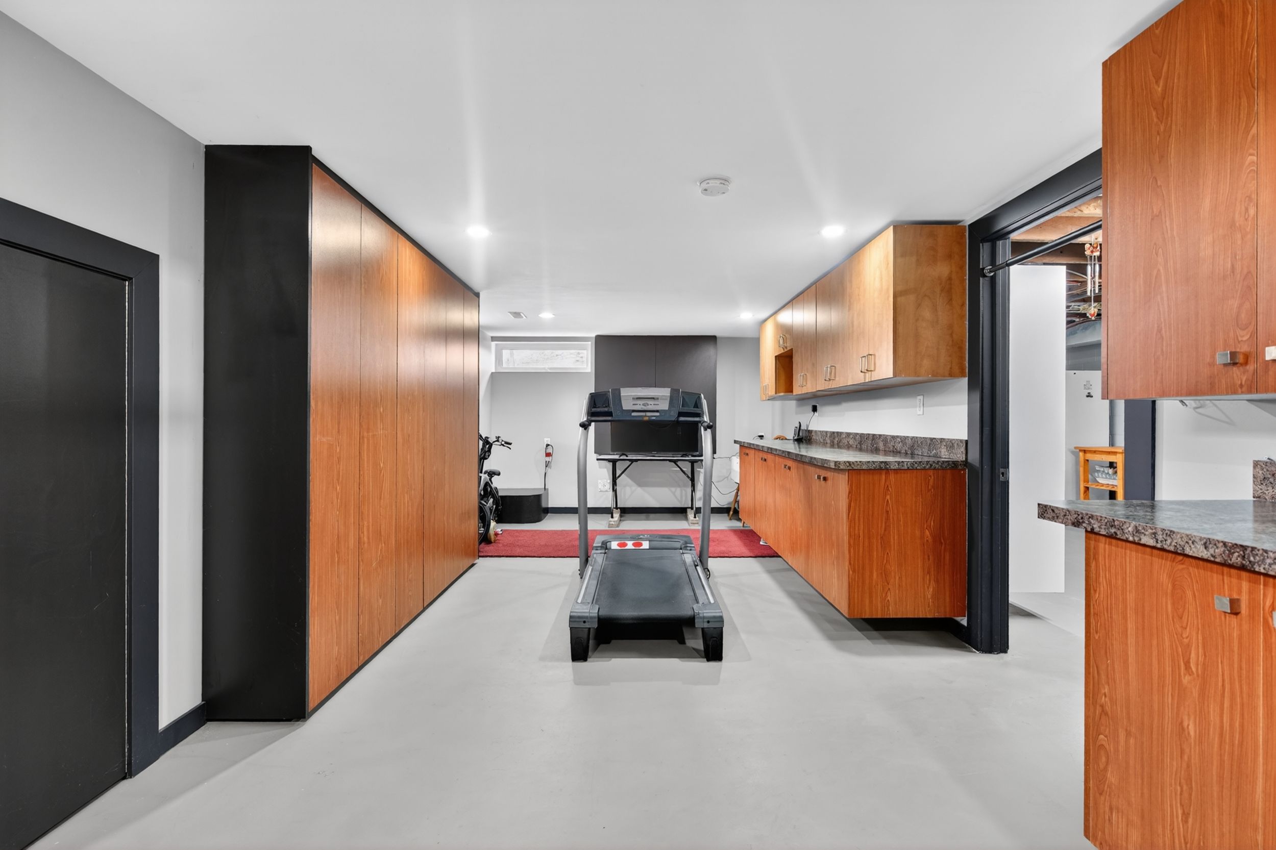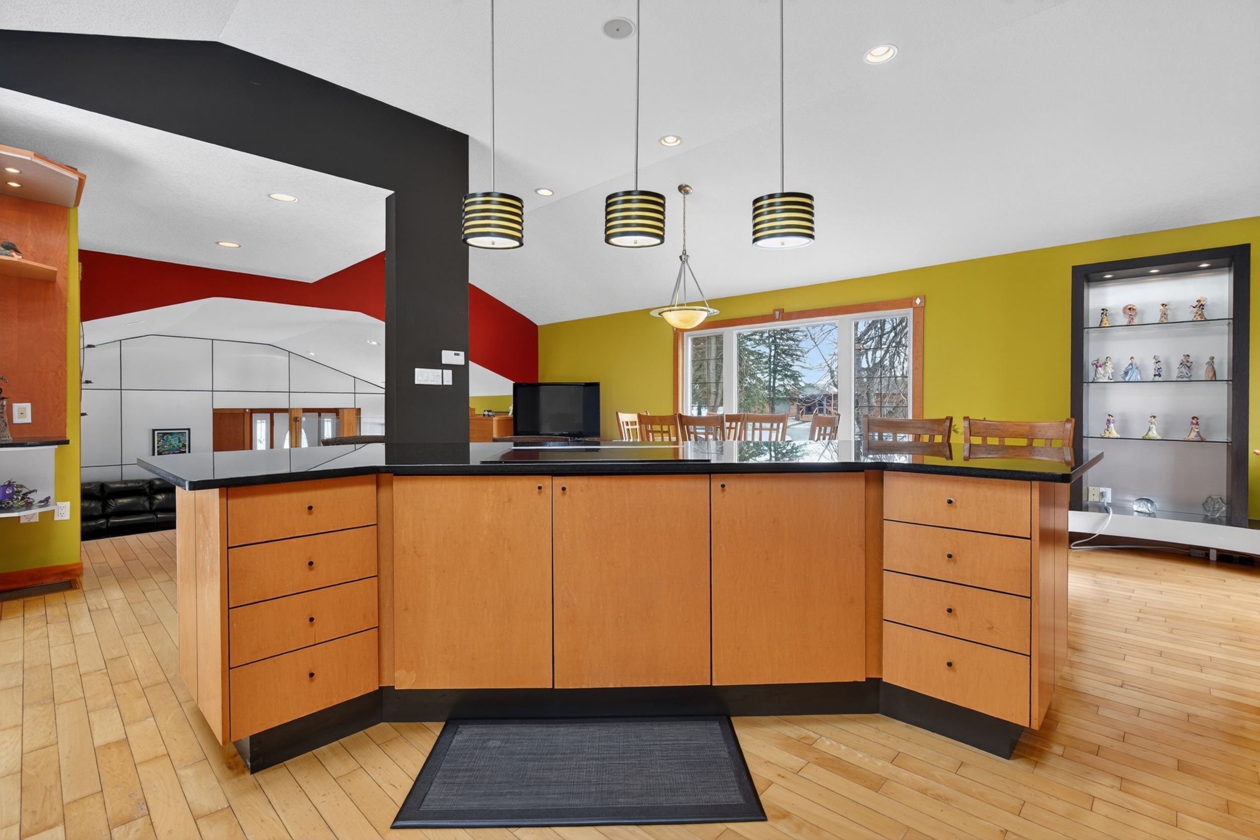 • Large open concept kitchen with granite countertops and built-in appliances.