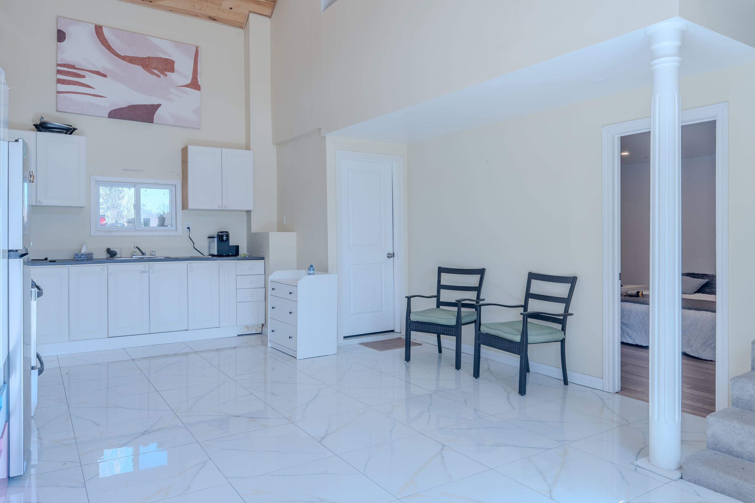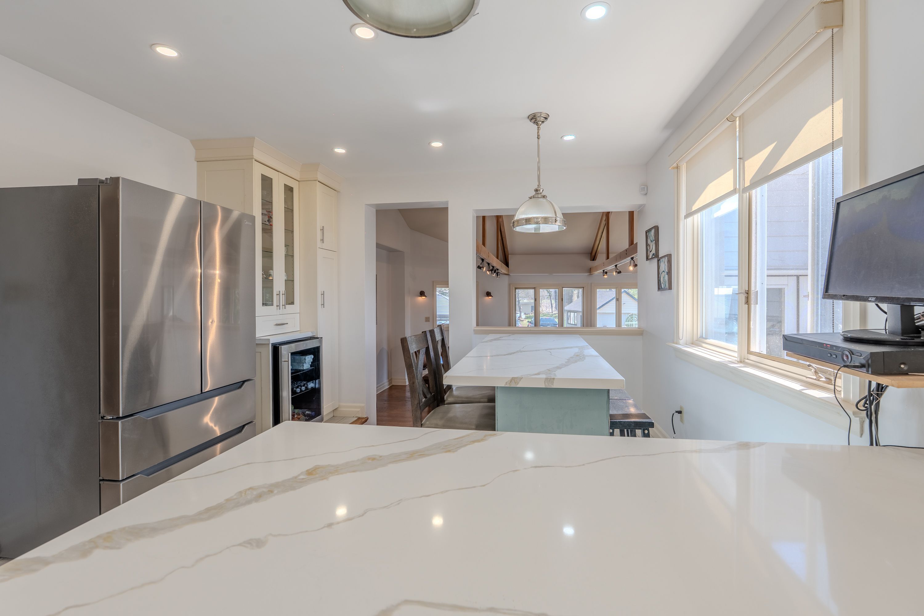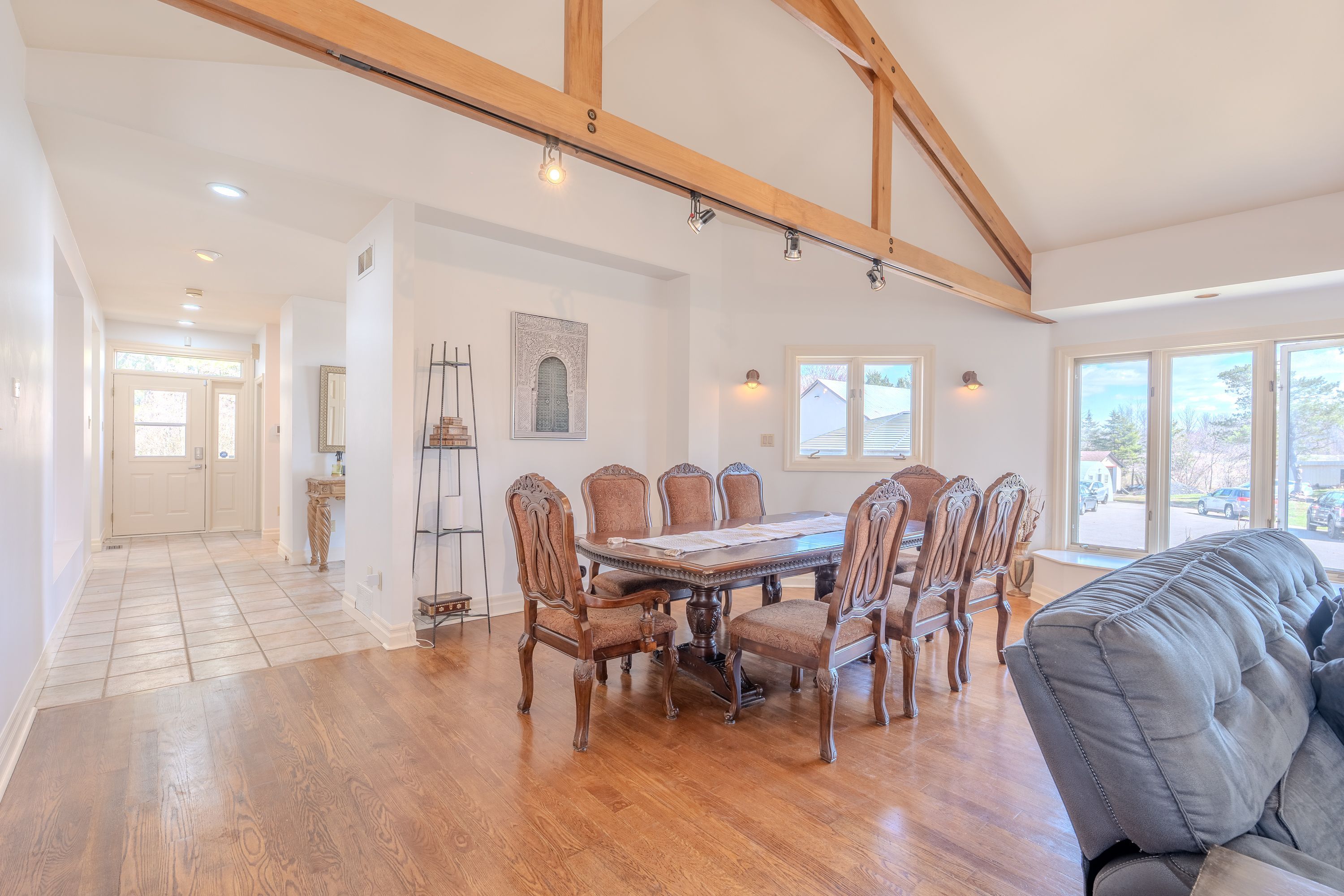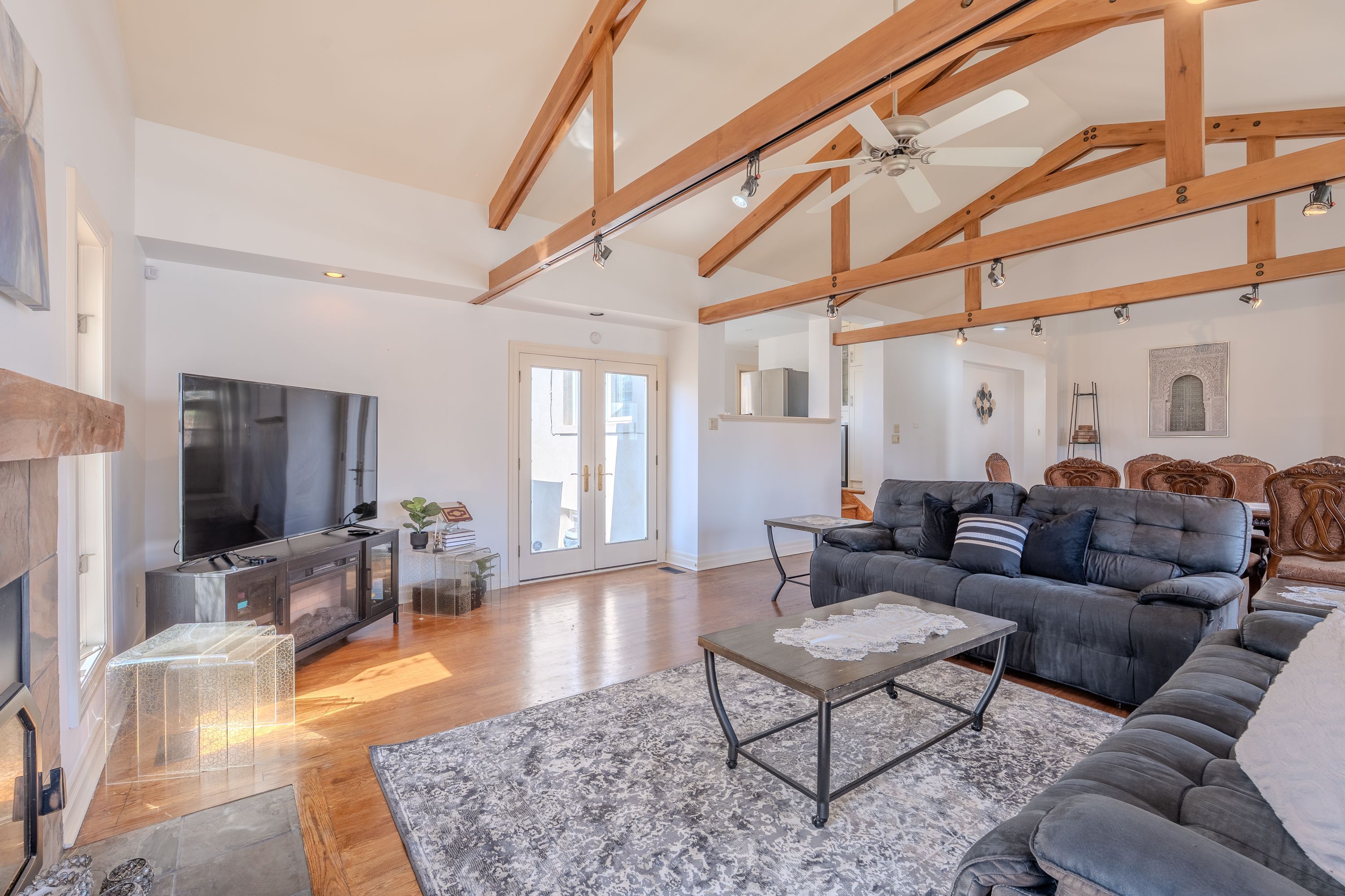 • Bright home with exposed wood rafters and large windows for natural light.