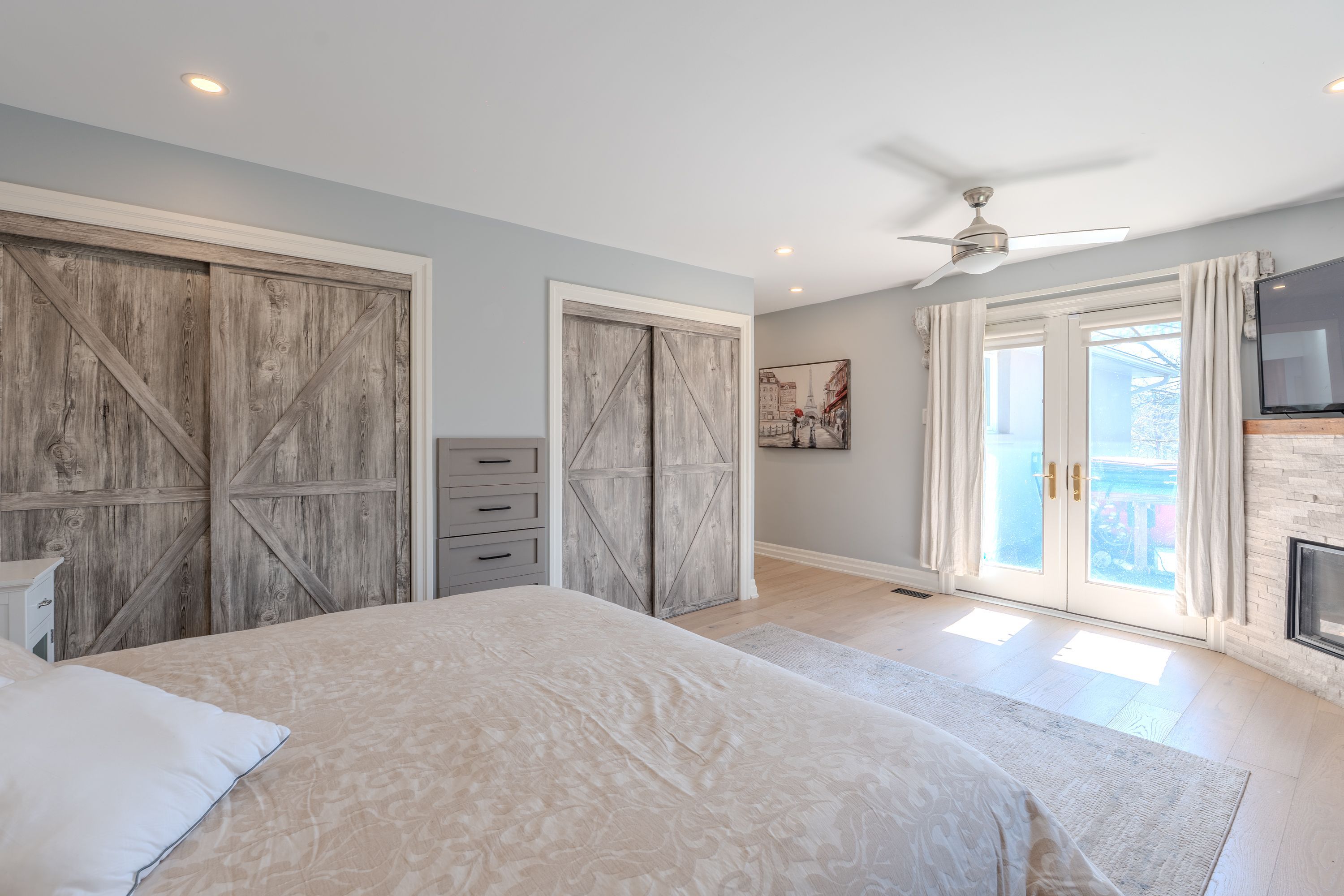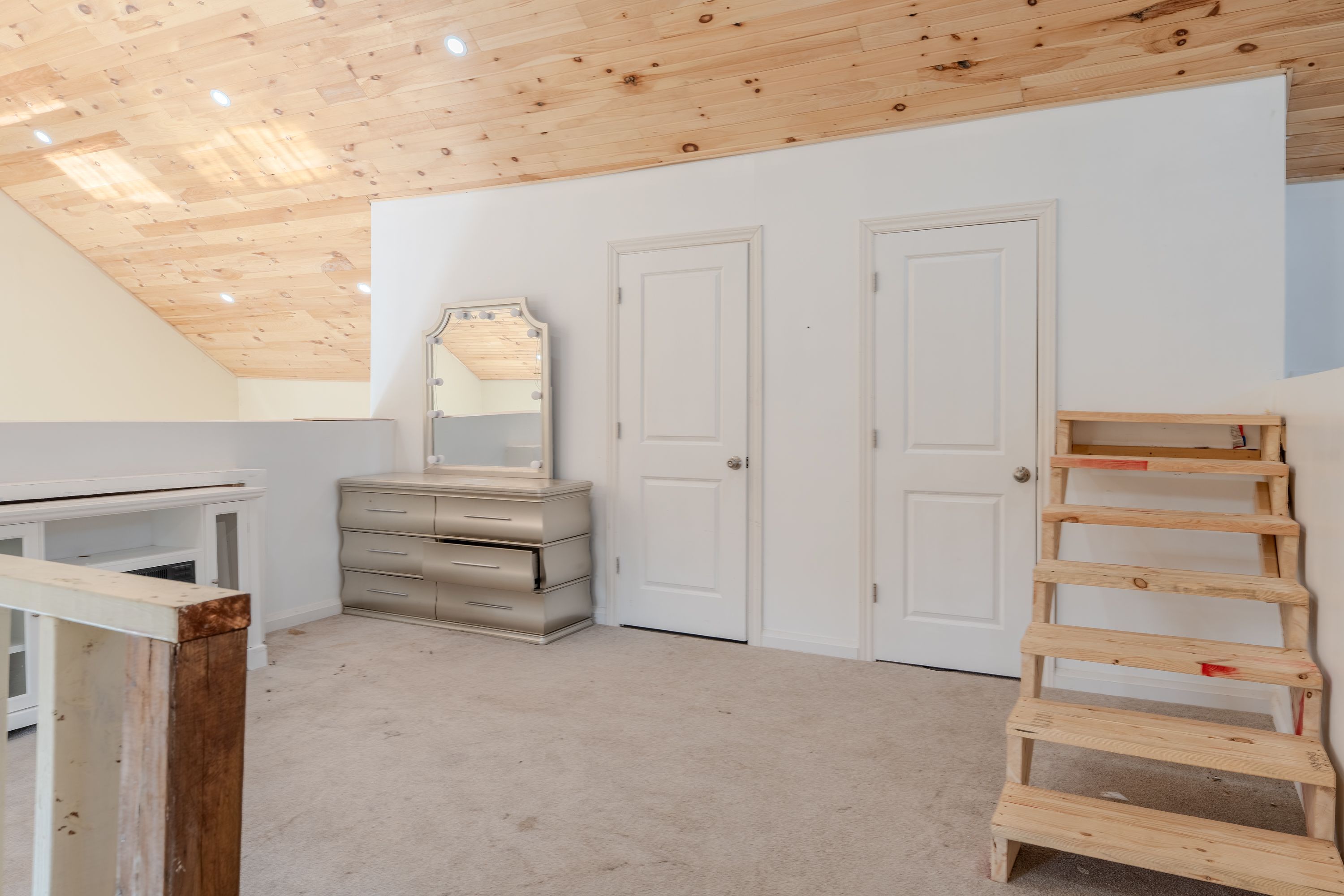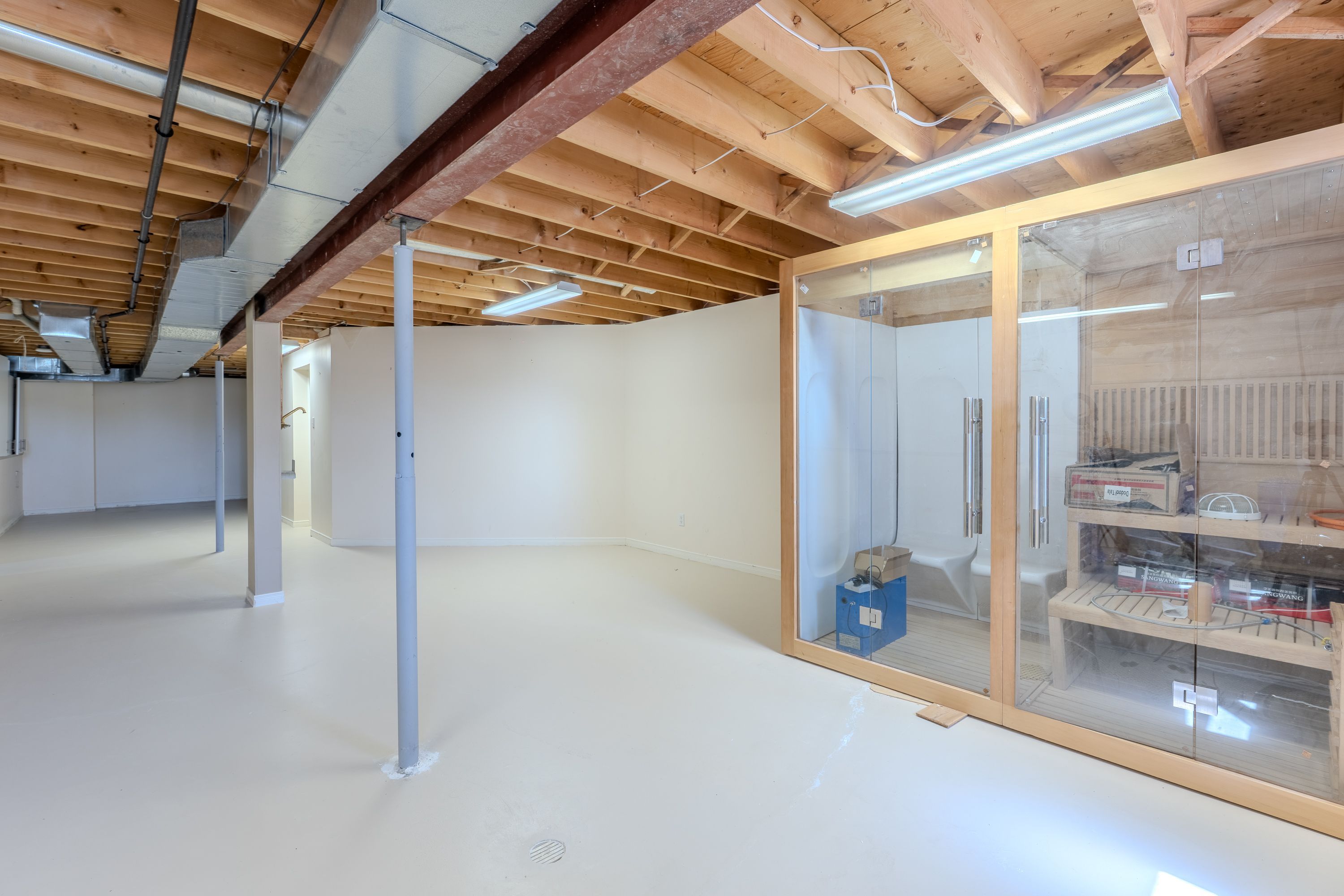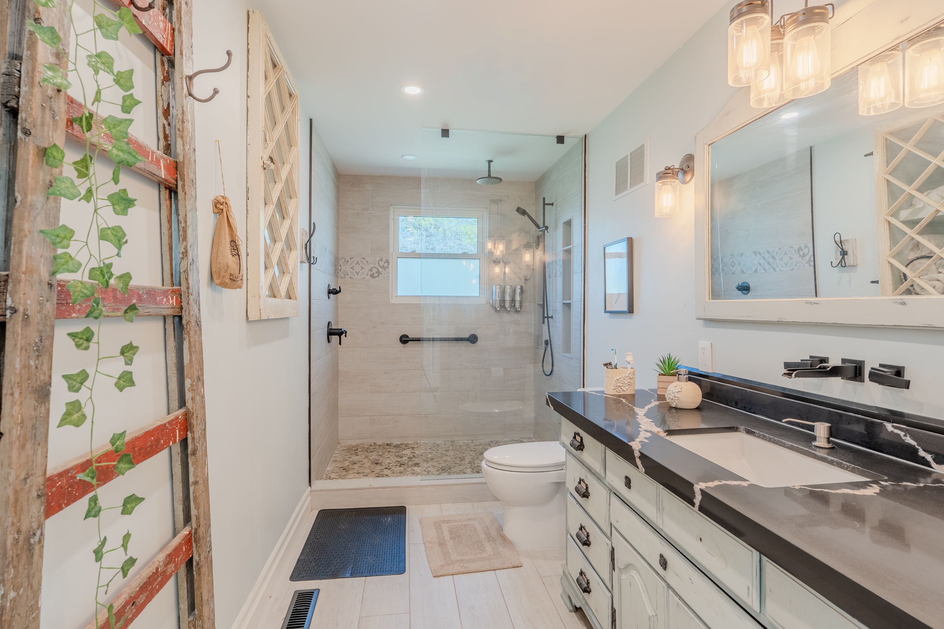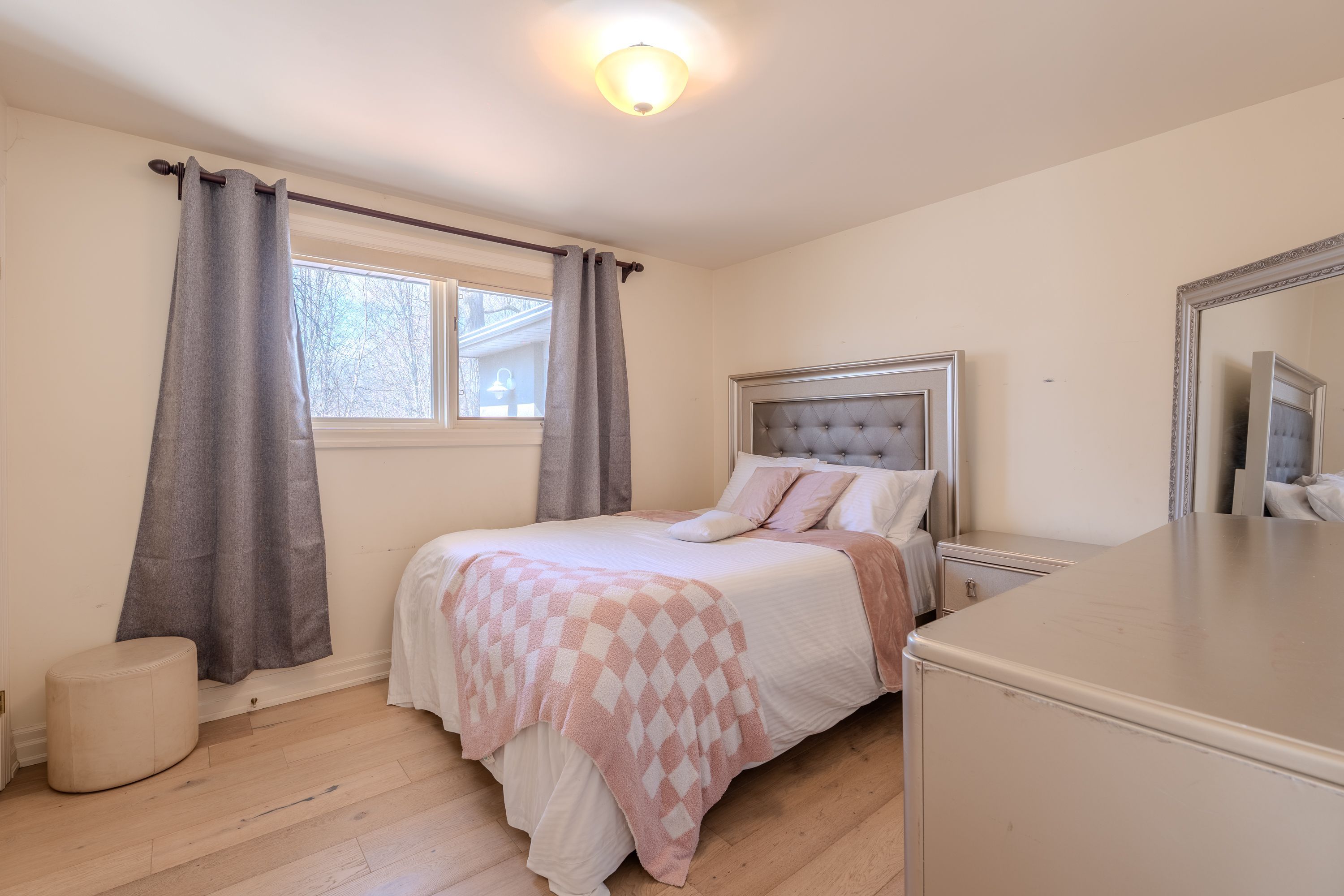 • Bright home with exposed wood rafters and large windows for natural light.
