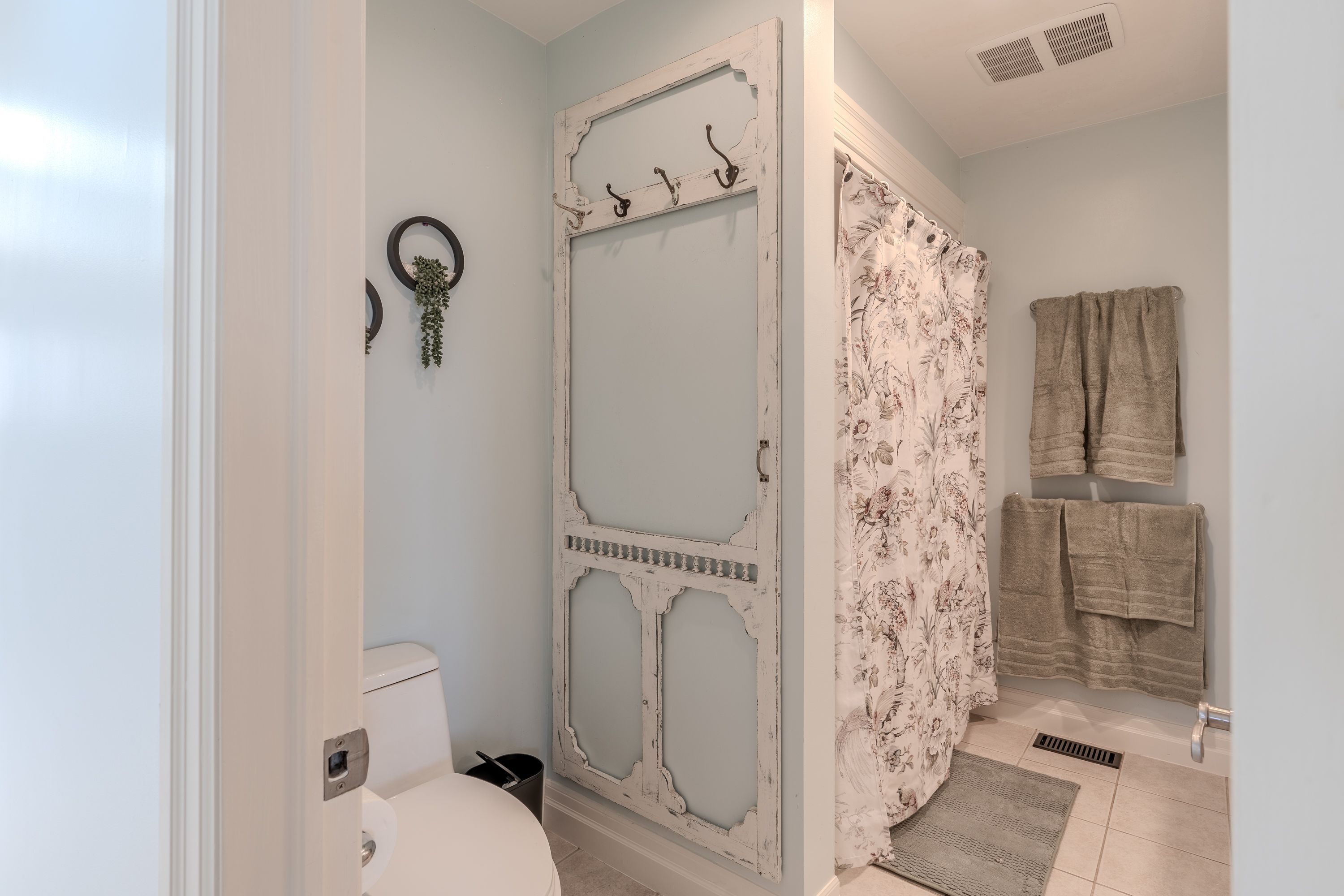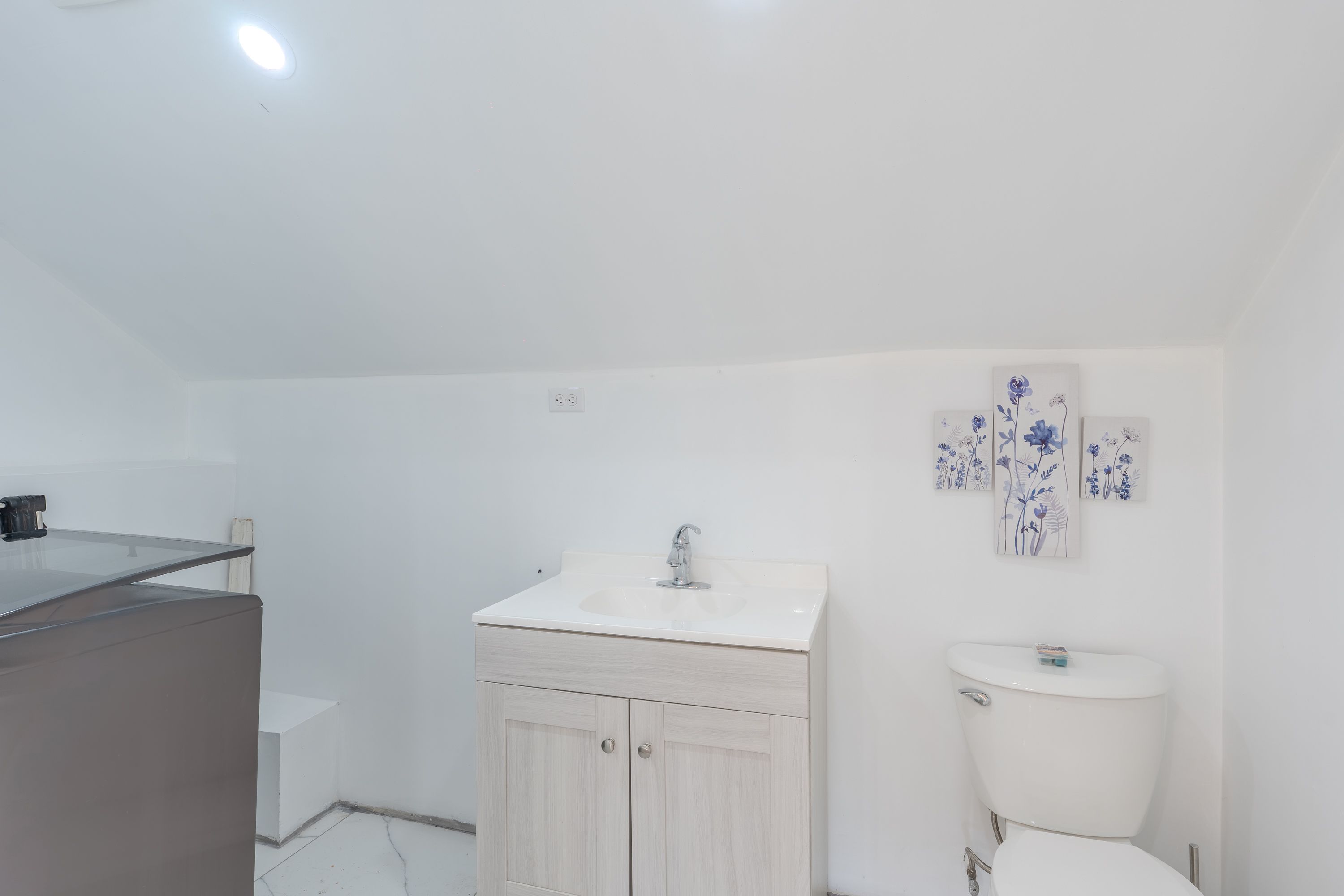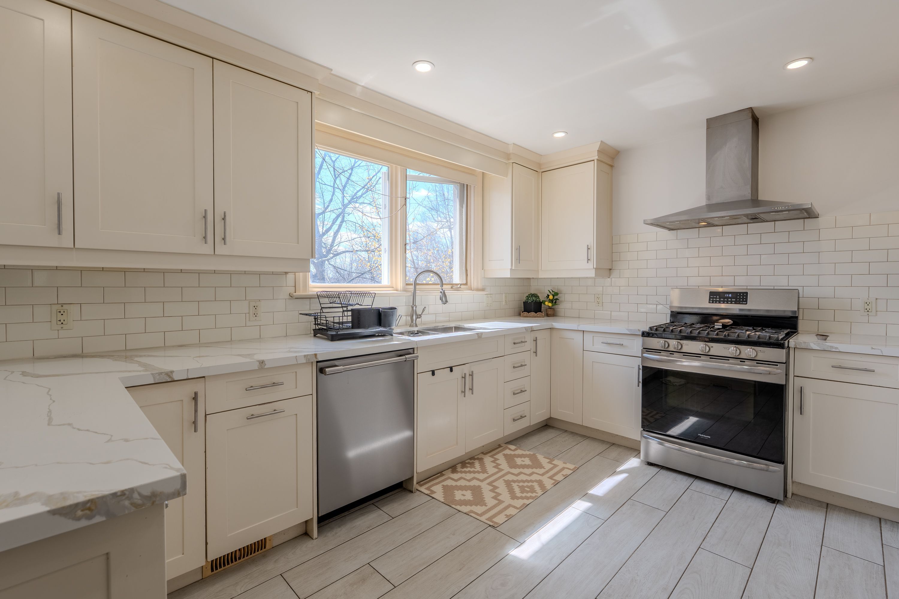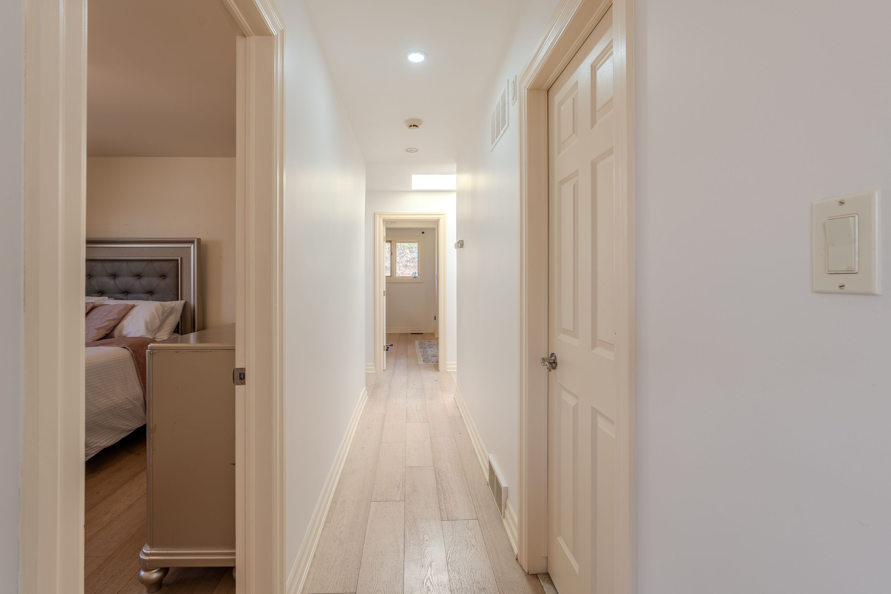 • Bright home with exposed wood rafters and large windows for natural light.