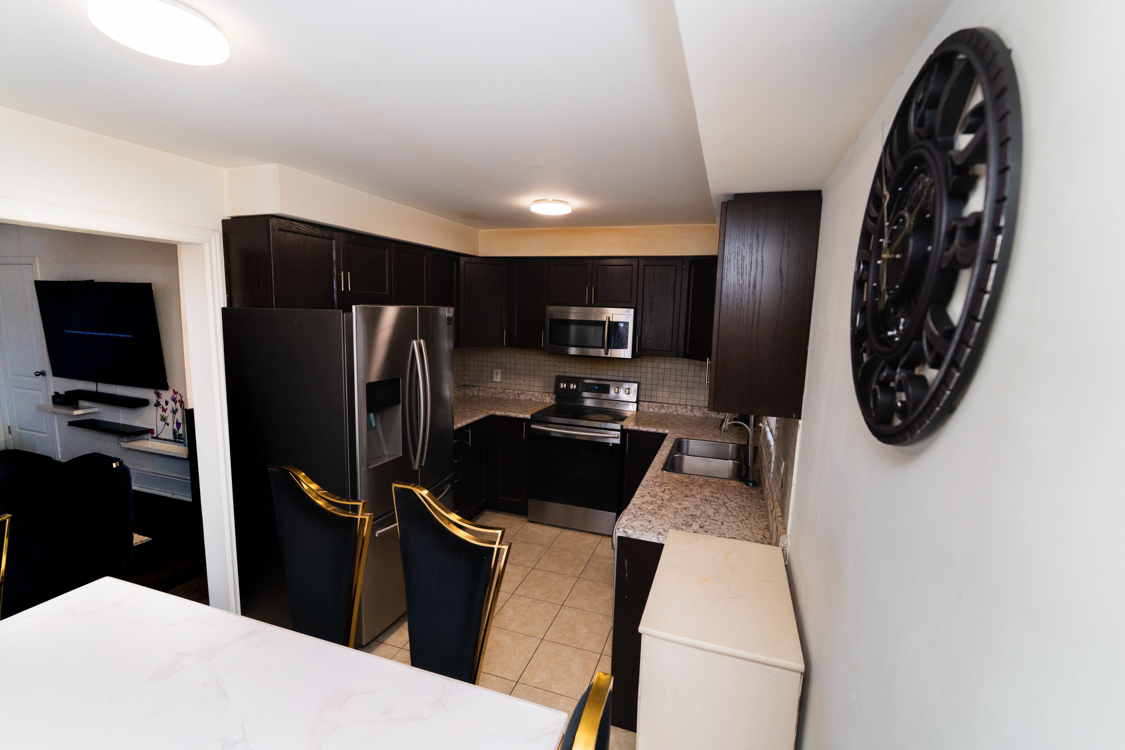 • Carpet-free main floor with a custom kitchen and stainless steel appliances.