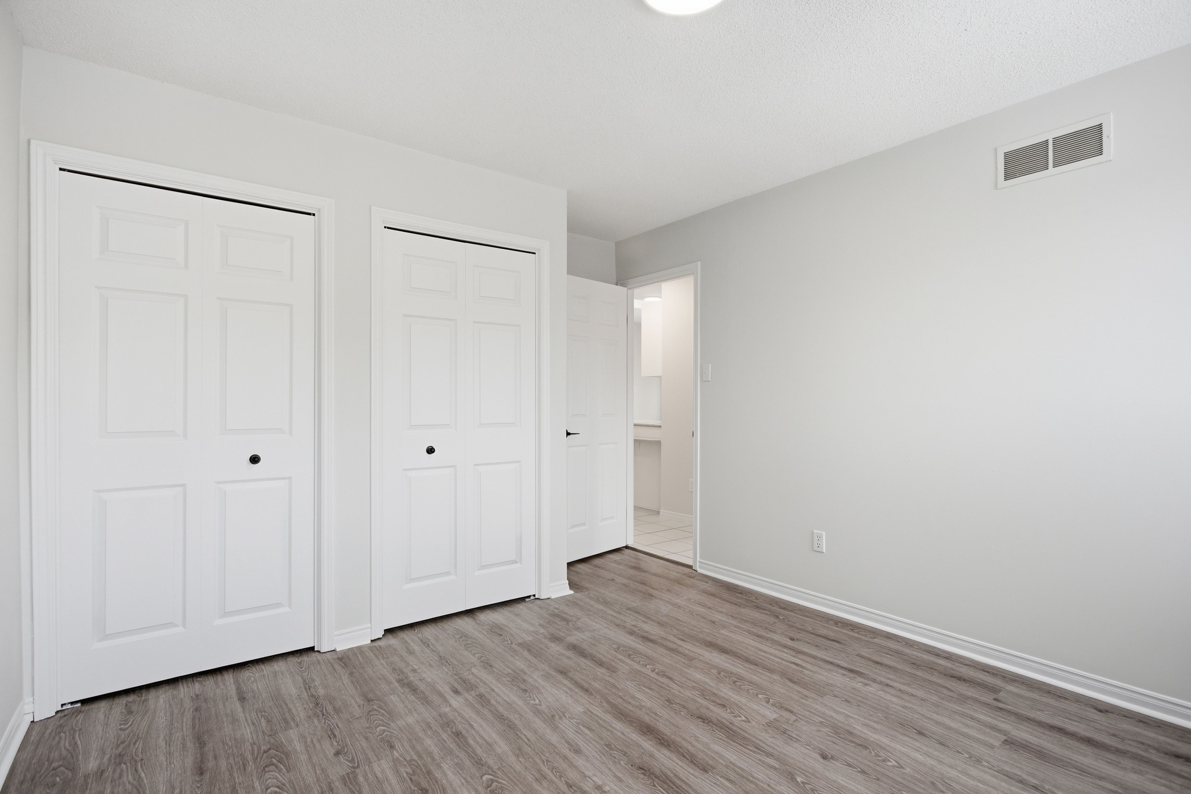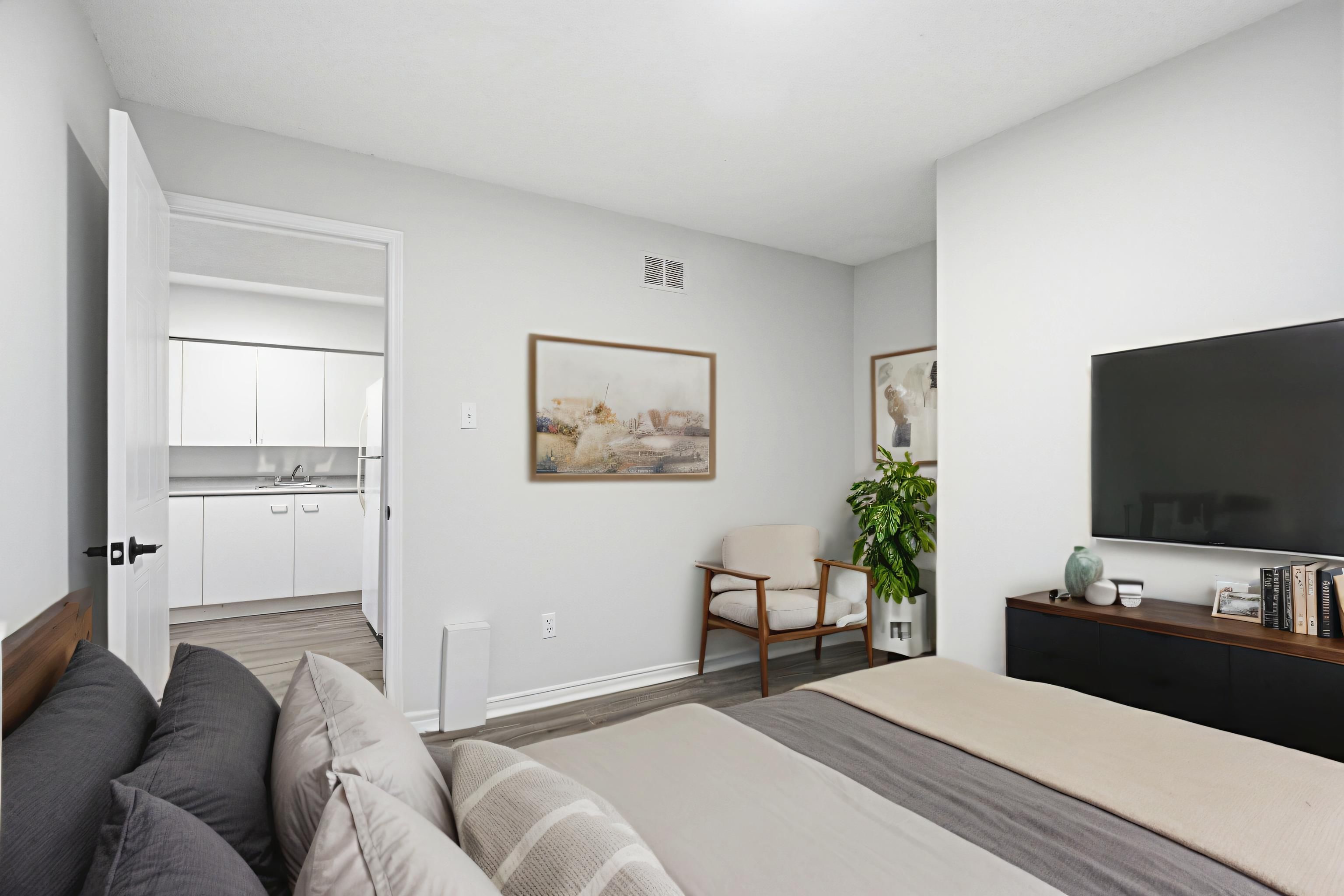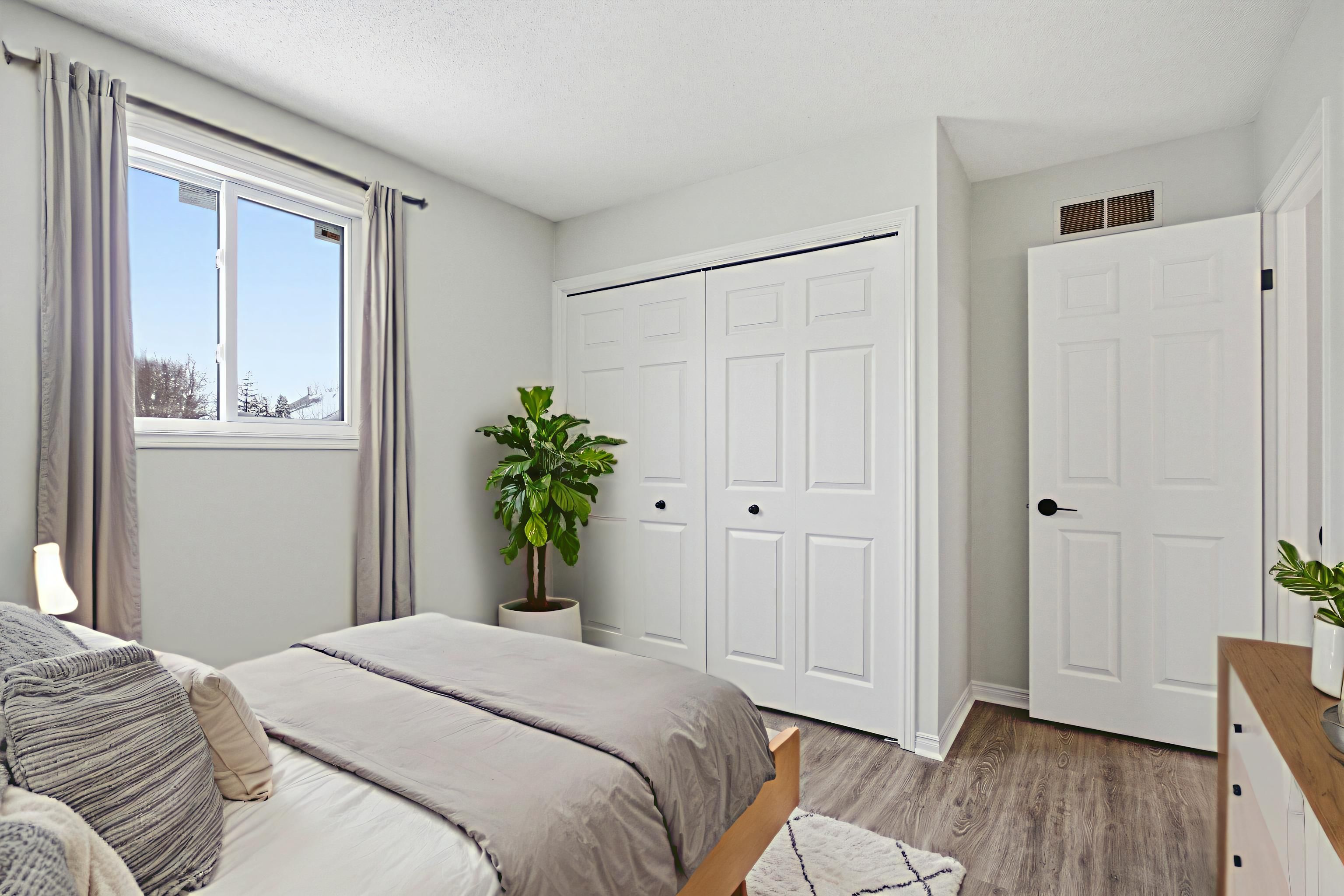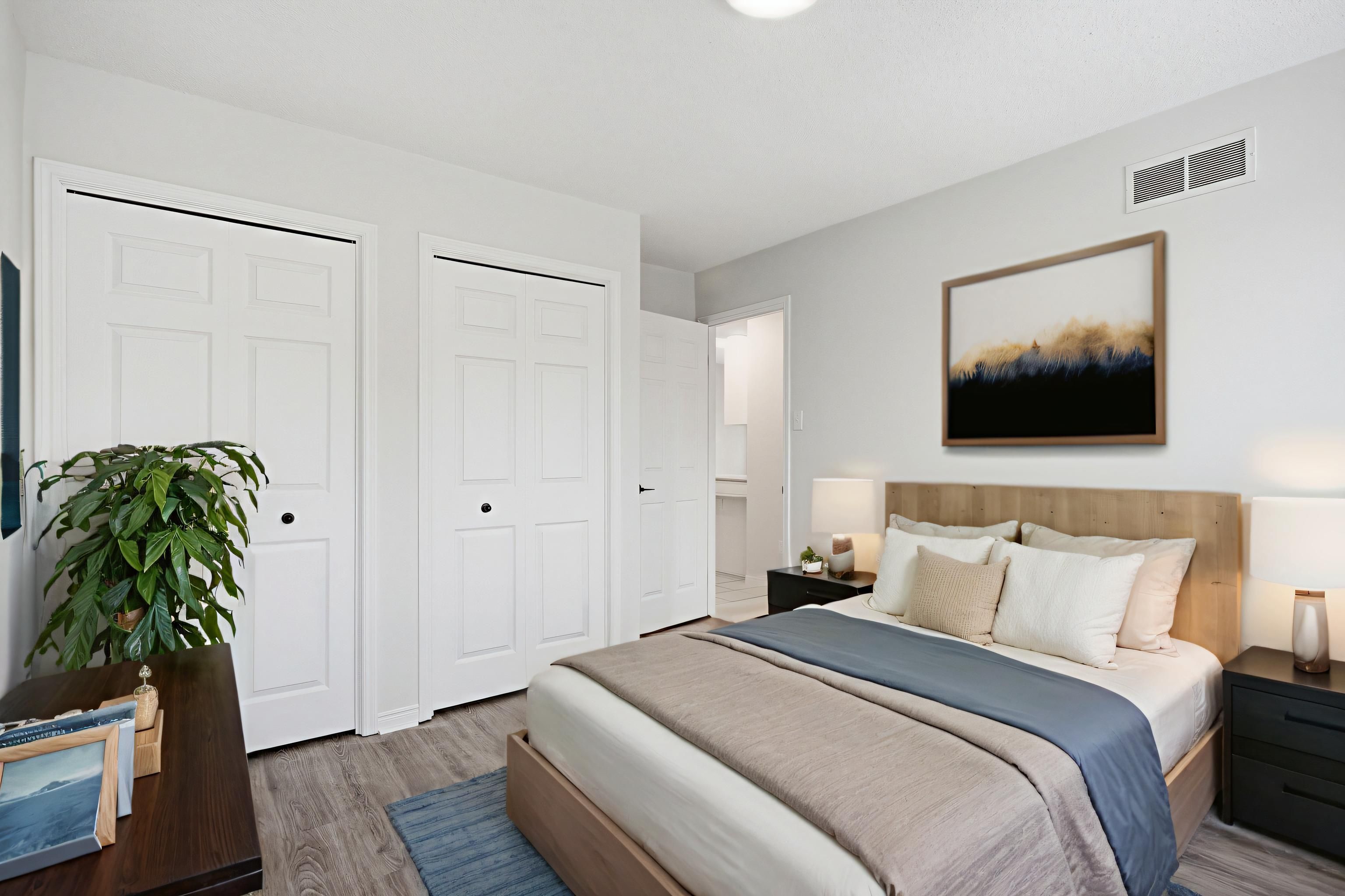 • Primary bedroom includes a private balcony and ample closet space.