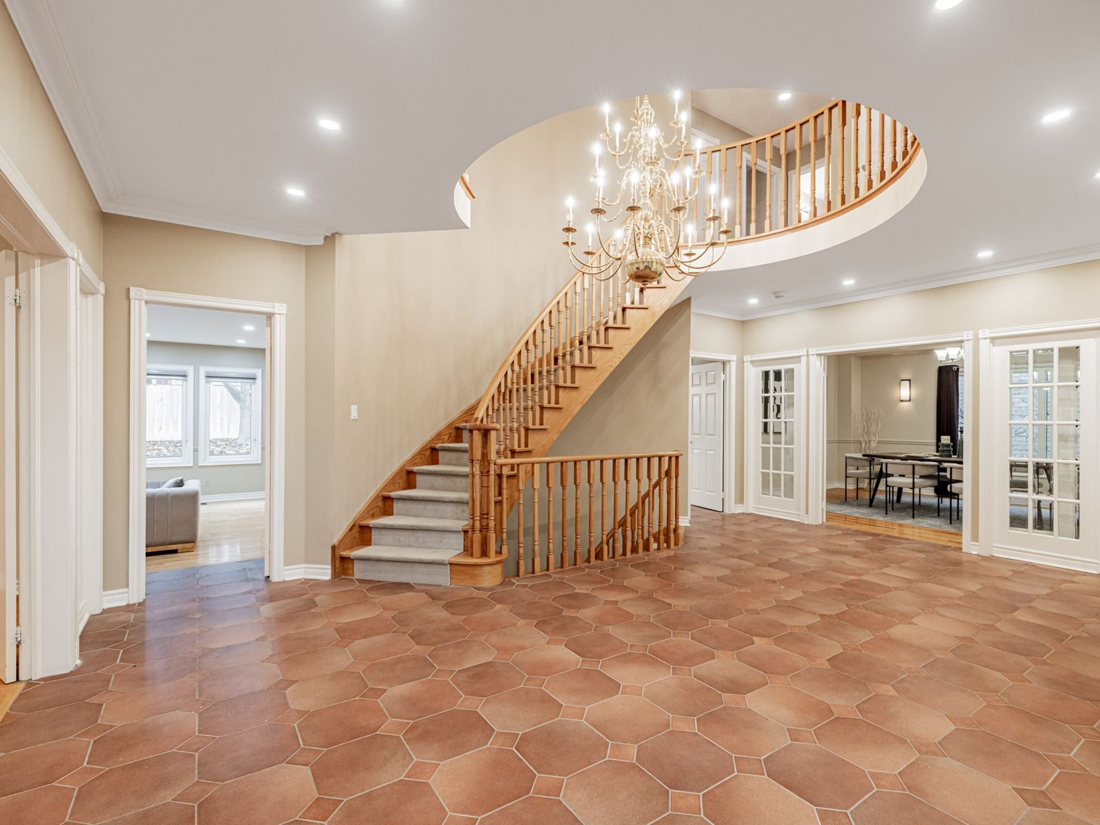 • Elegant entry with a grand staircase and hardwood flooring throughout.