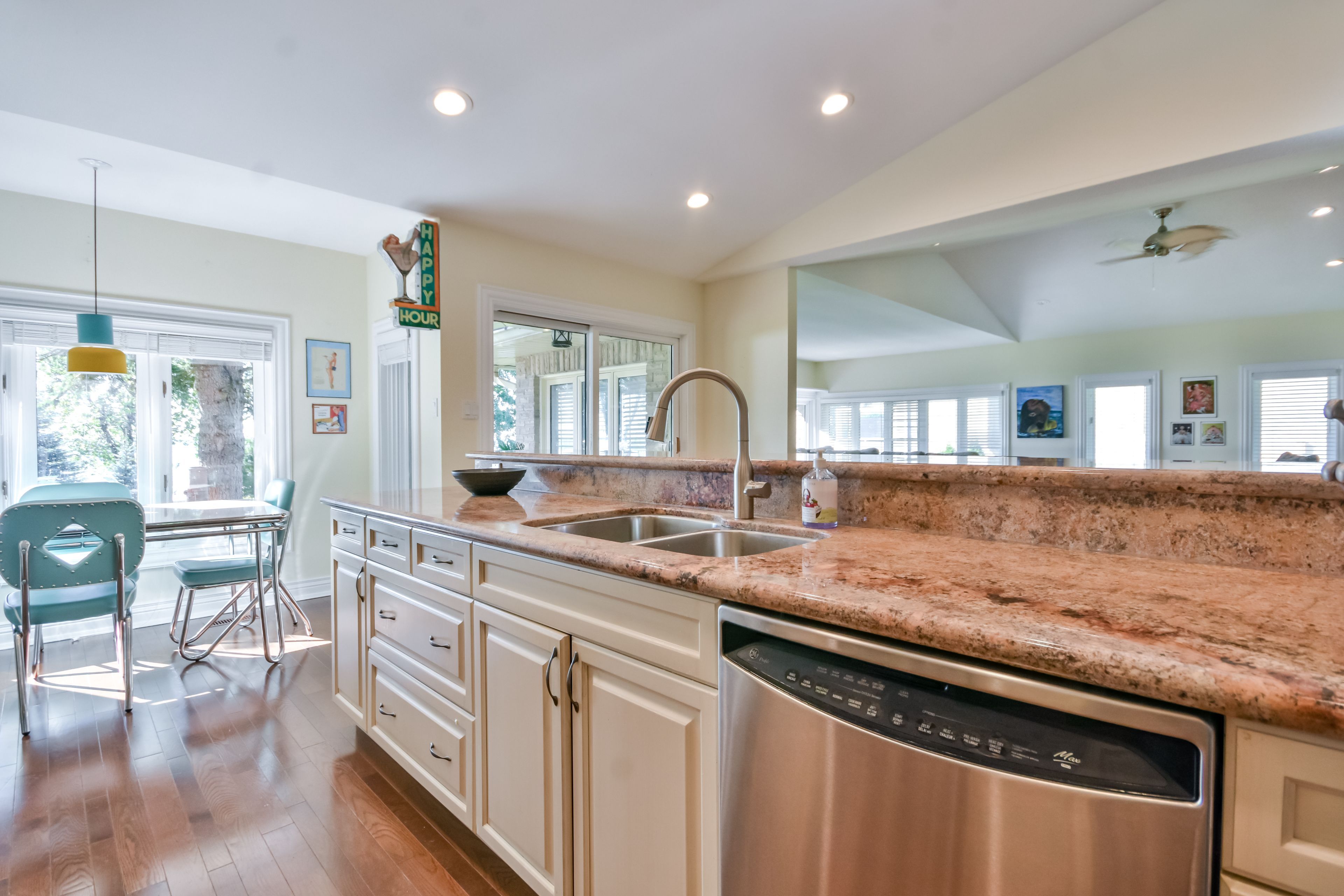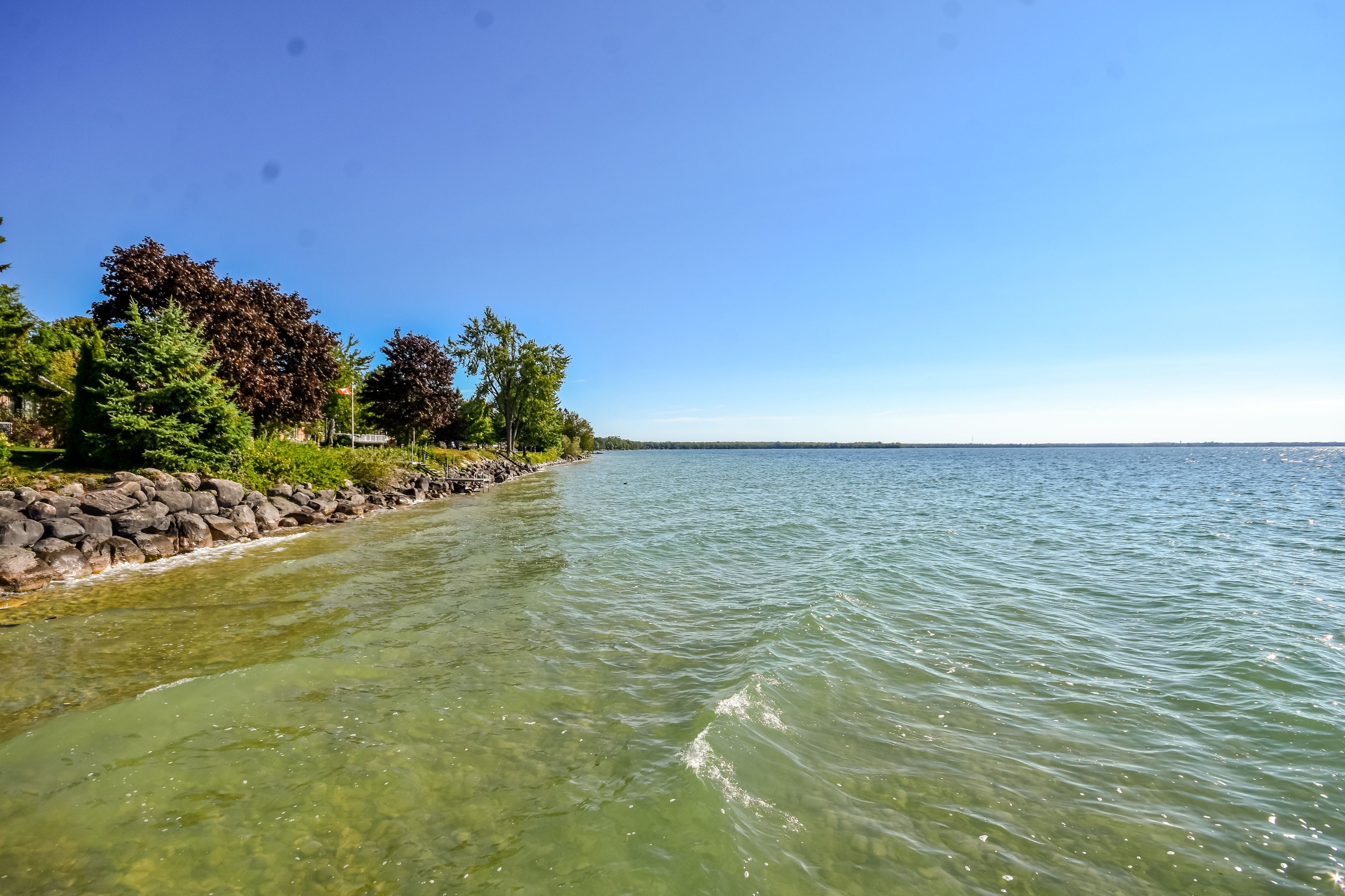 Lake simcoe 5,000 sq. Ft. Waterfront bungalow with breathtaking southern views. Welcome to this stunning waterfront bungalow on the shores of lake simcoe, offering 100 feet of clean, clear shoreline. This beautifully maintained home features cathedral ceilings and an open-concept layout that seamlessly blends the gourmet kitchen, dining, and living areas perfect for both relaxed family living and stylish entertaining. The kitchen is a chef's dream, complete with granite countertops and a walkout to a spacious stone patio, ideal for family gatherings. The main floor includes 2 generously sized bedrooms, 3 bathrooms, convenient main floor laundry, and inside access from the attached garage. The fully finished lower level offers a spacious rec room with walkout access to the backyard. This level also includes a large bedroom, a 3-piece bathroom, ample storage, and a versatile bonus room that can serve as a media room, games room, or an additional bedroom for extended guests. Curb appeal abounds with manicured lawns, established low-maintenance gardens, and an inviting presence. Enjoy ultimate privacy, stunning sunsets, and a truly serene lakeside lifestyle. Don't miss this rare opportunity to own a piece of paradise on lake simcoe. Bayshore village is a unique waterfront community located on the eastern shores of lake simcoe. Membership includes access to amenities such as golf, saltwater pool, pickle ball and tennis courts, cards, socials and more. ($1,100/2025) bayshore village association & bell fibre member