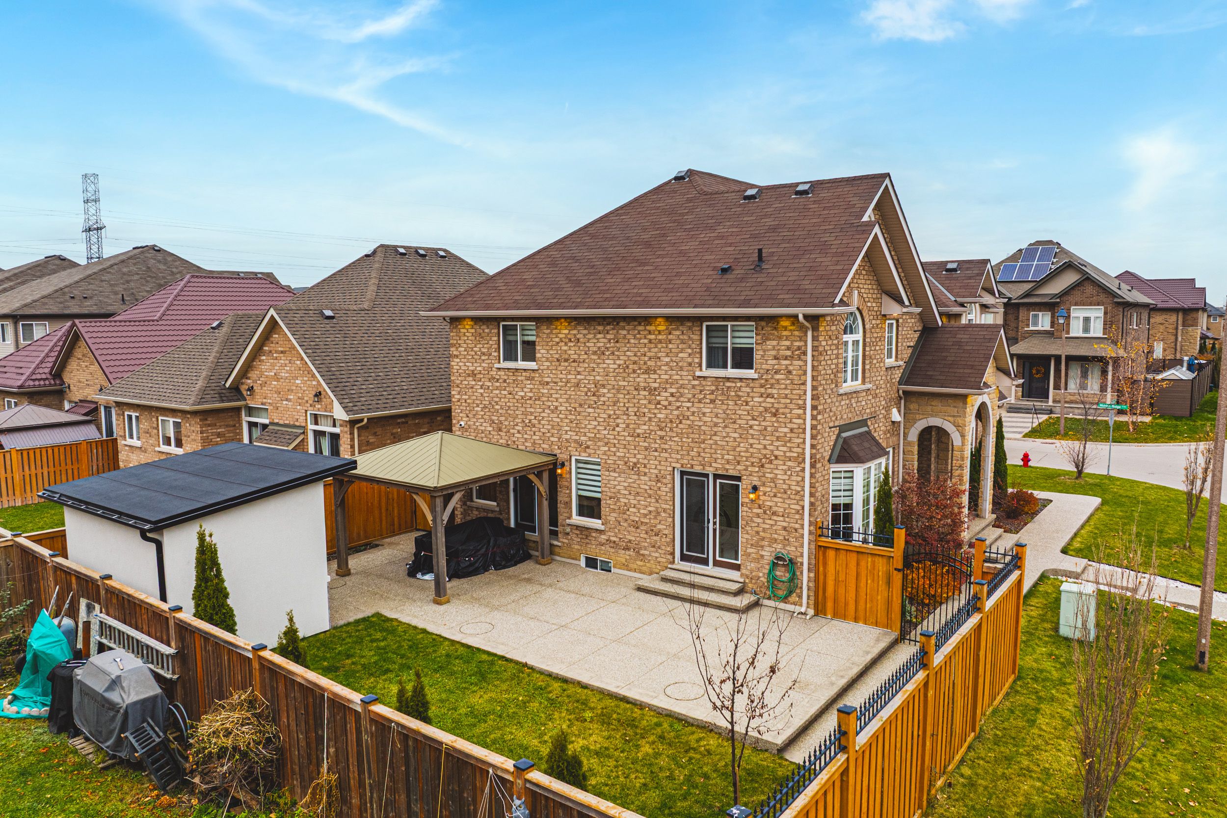 Welcome to 96 hidden ridge crescent - a beautifully upgraded 4-bed, 3-bath detached home offering over 2,500 sq ft of above-grade living in one of glanbrook's most desirable family neighbourhoods. Featuring soaring 9-ft ceilings on the main level, a bright open-concept layout, and a spacious kitchen with large island, this home is designed for comfortable everyday living and effortless entertaining. The living and dining areas flow seamlessly to the backyard, where extensive exterior upgrades including exposed concrete aggregate (2021), a newer shed (2020), and a fully fenced yard (2020) create a private outdoor retreat. Three 2-ft x 4-ft sonotube footings with rebar and concrete are already in place-perfect for a future awning or pergola. Upgrades continue inside with a water softener and reverse osmosis system (2022), security alarm system and cameras, and convenient main-floor laundry. Upstairs, the spacious primary suite includes a 4-piece ensuite, joined by three additional generously sized bedrooms. With parking for six, an attached double garage, and easy access to parks, schools, shopping, and major routes, this move-in-ready home offers incredible value and modern comfort in a sought-after community.