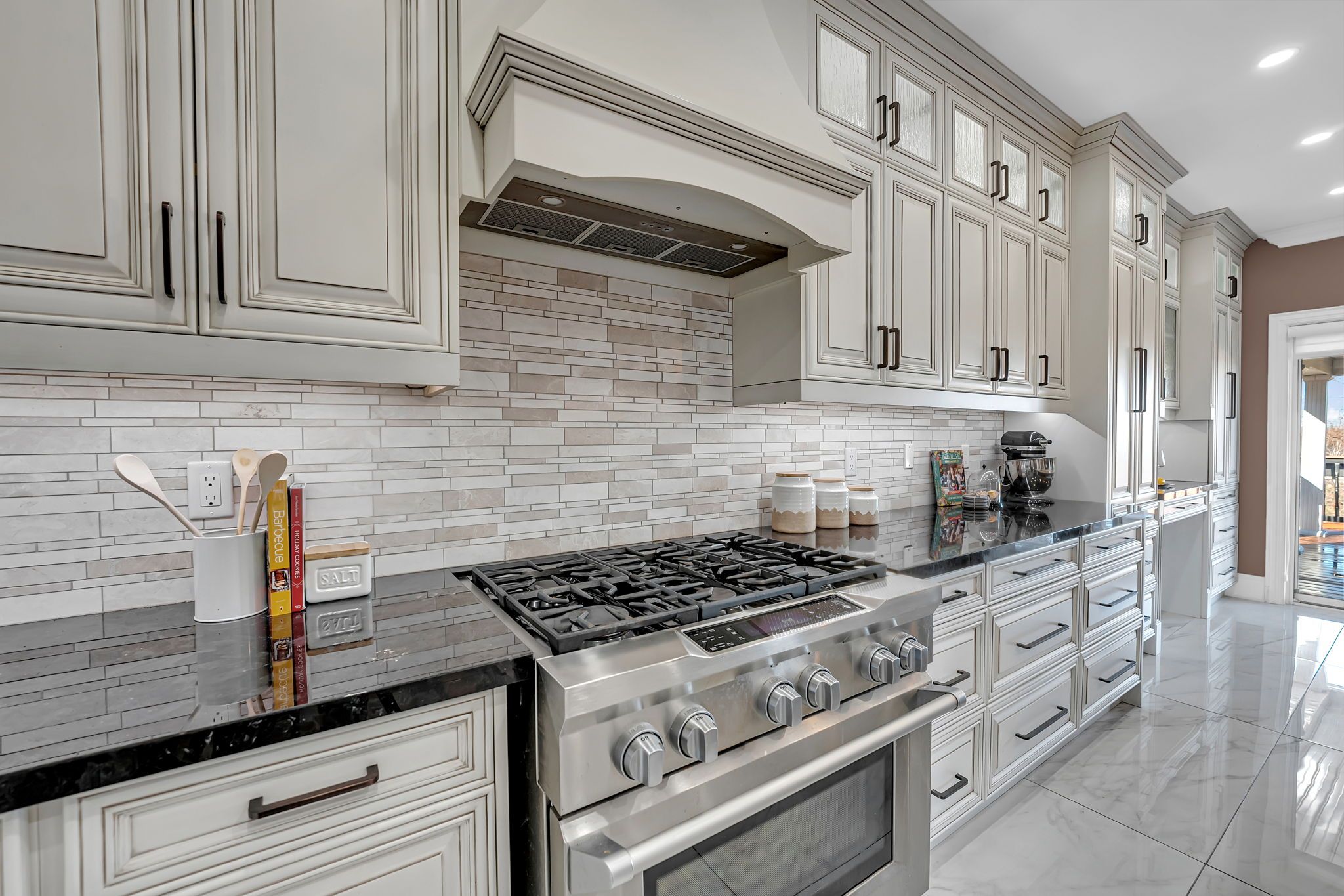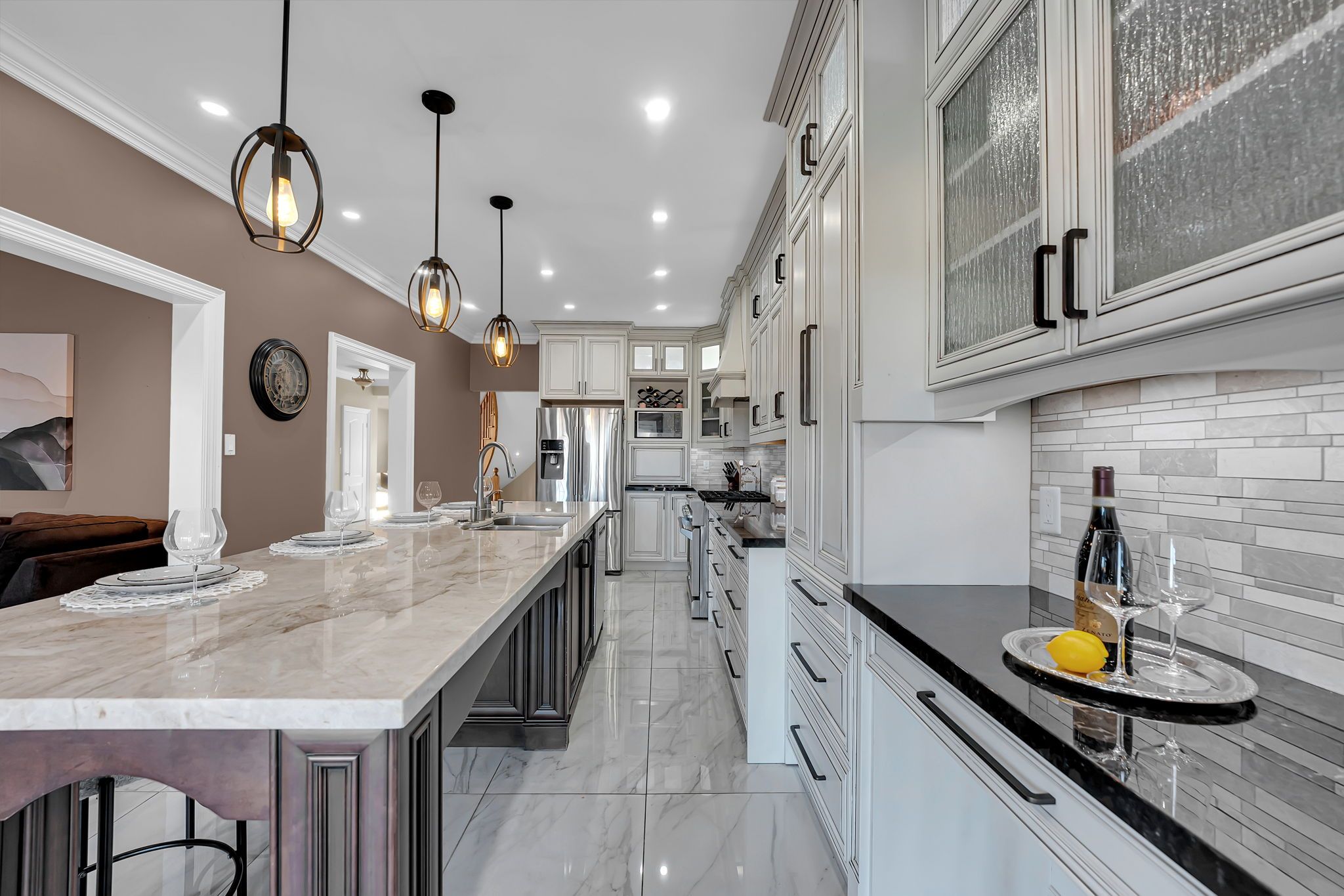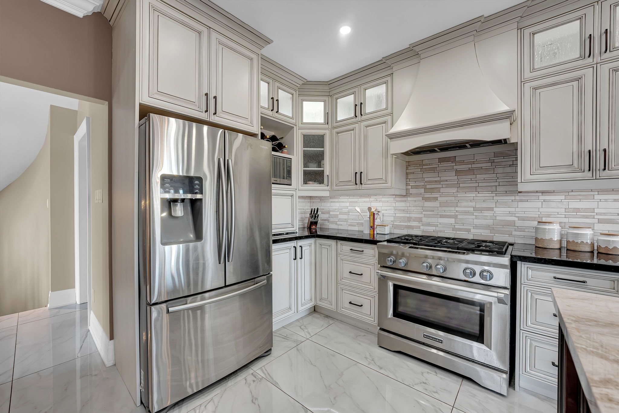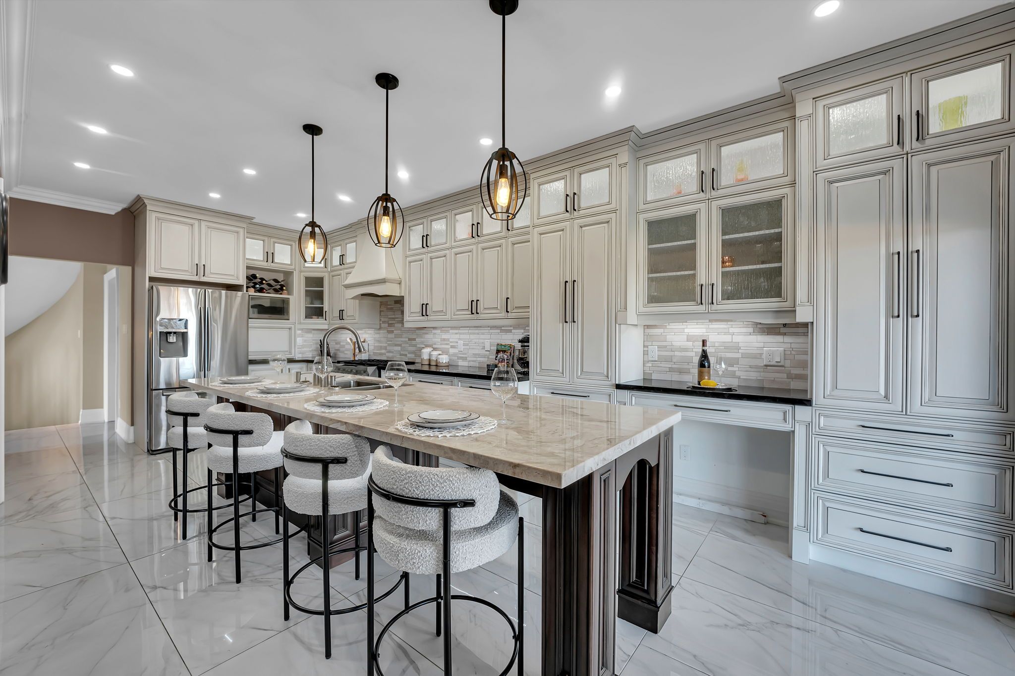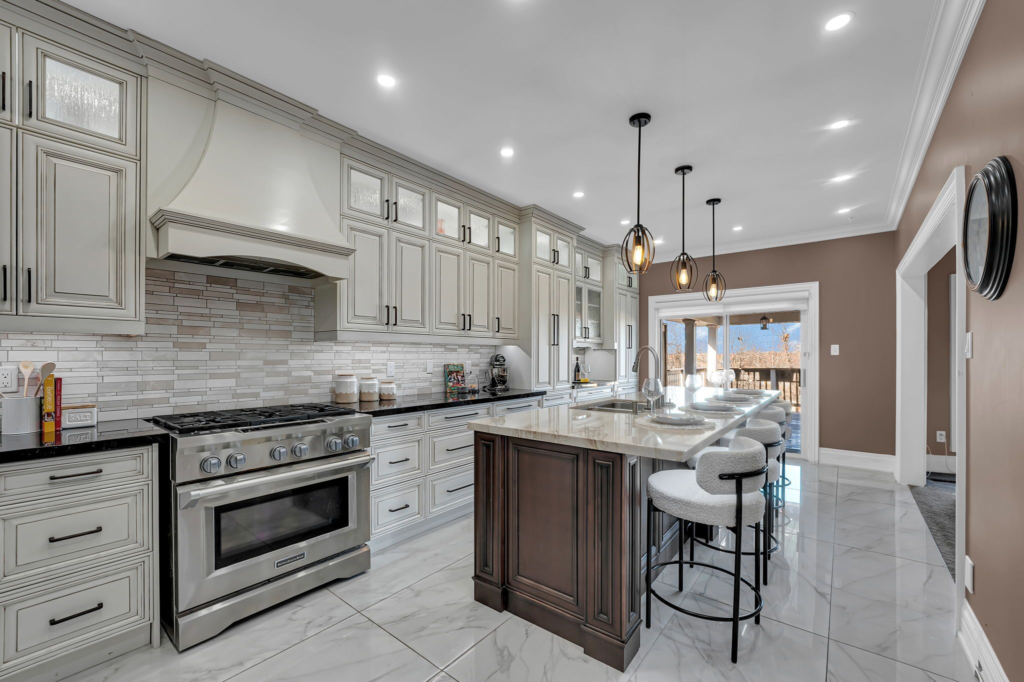 • Custom chef's kitchen featuring stainless steel appliances and a large island.