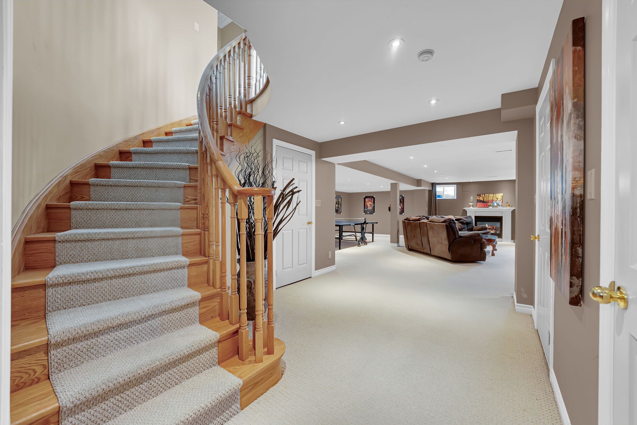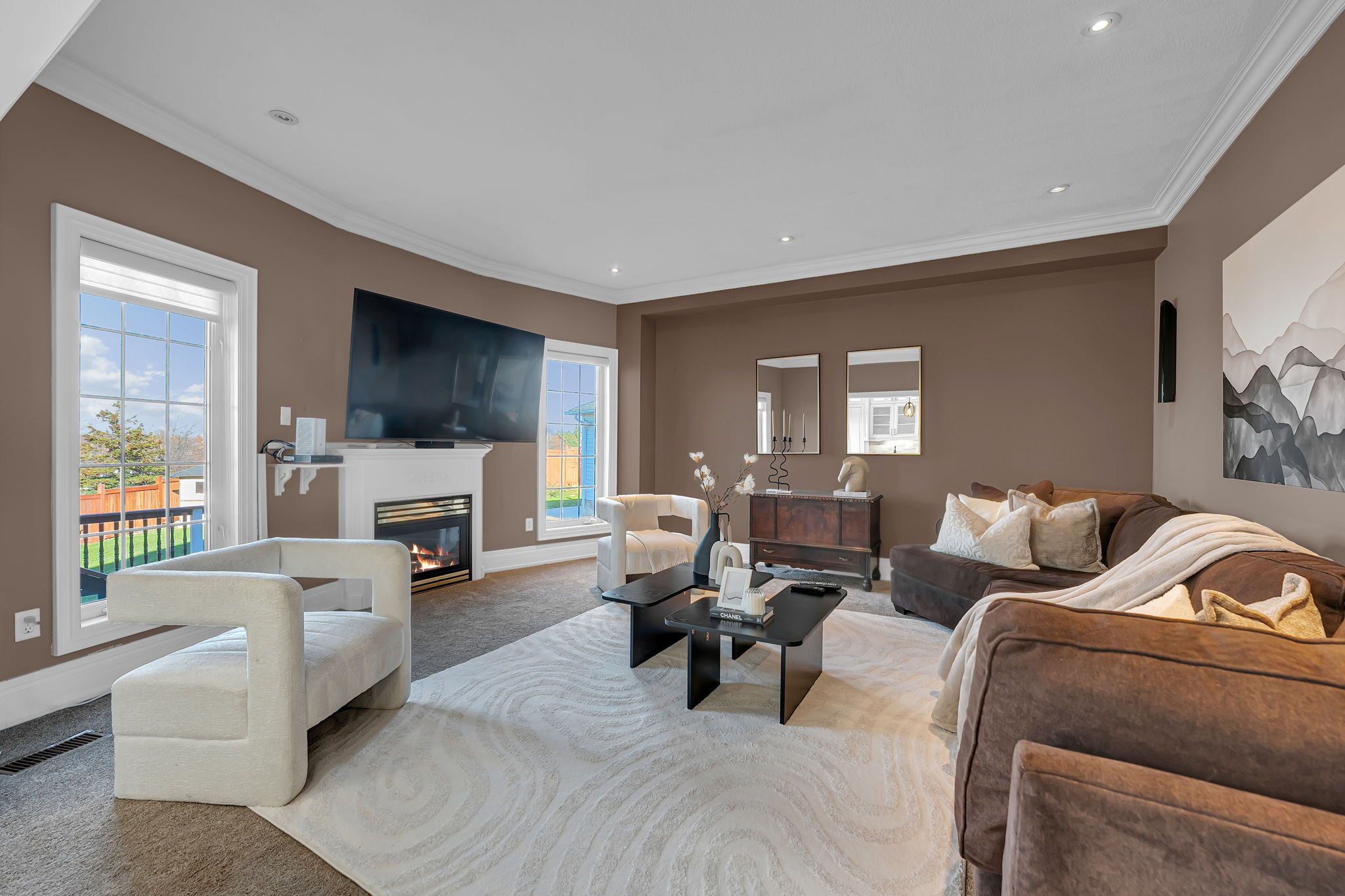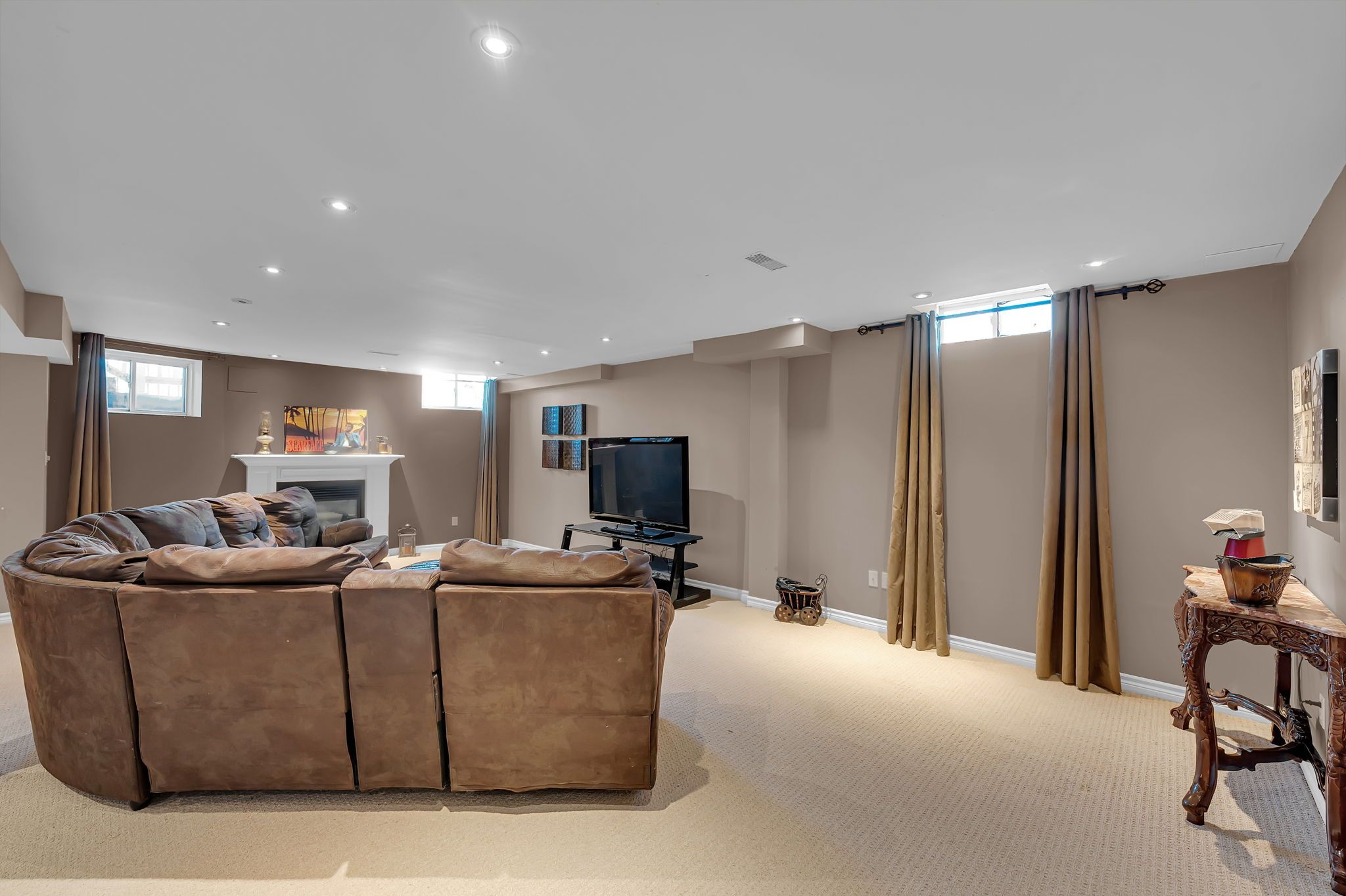 • Finished basement with large windows, fireplace, and extra bedroom for guests.
