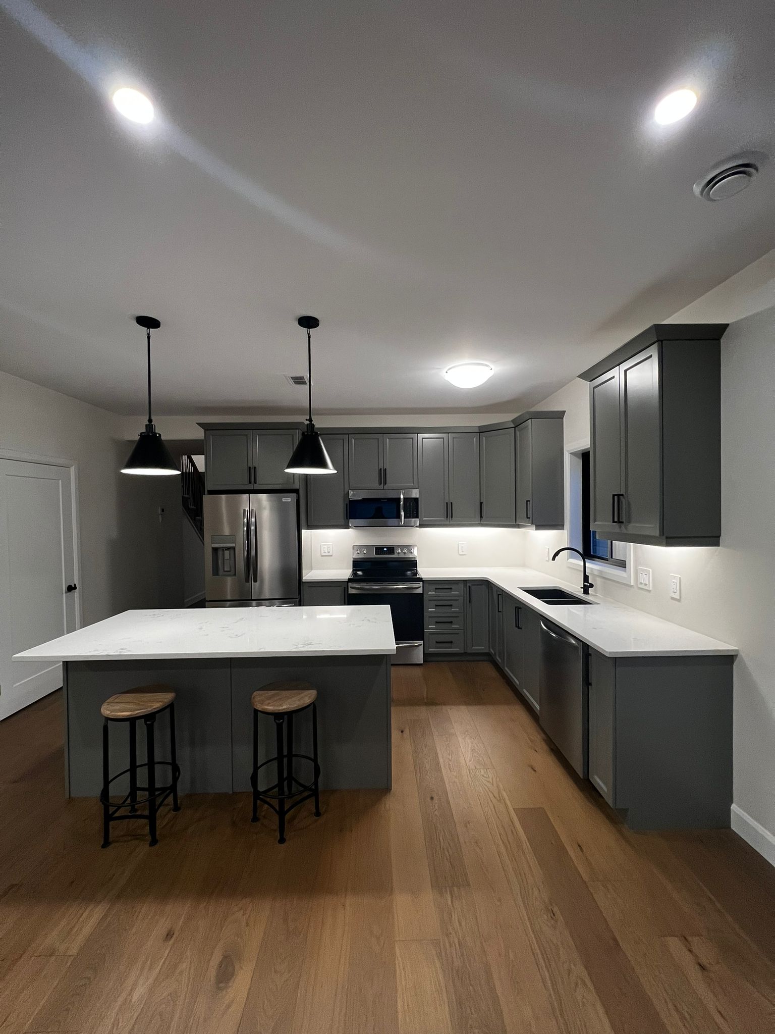 • Modern kitchen with quartz countertops and stainless steel appliances.