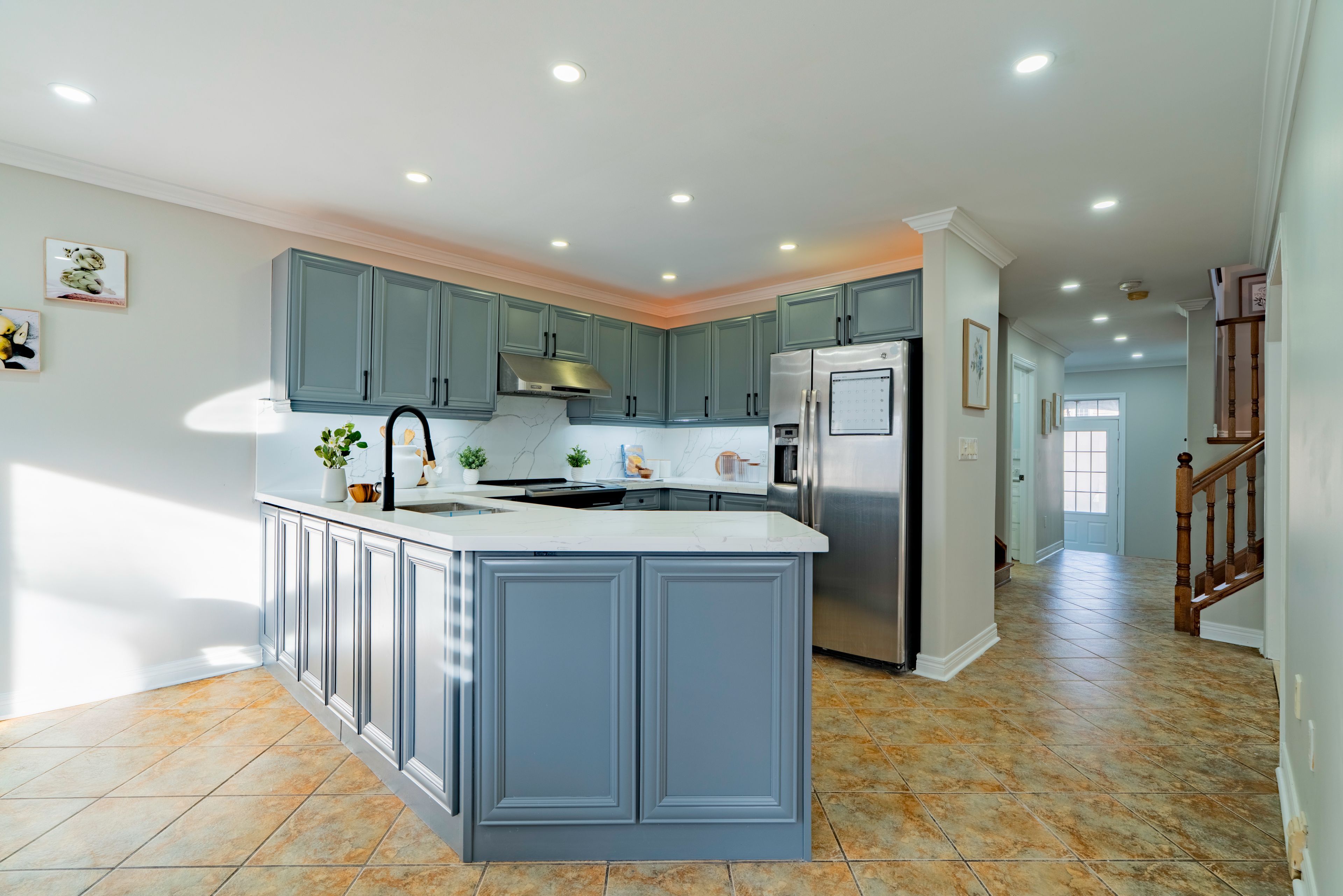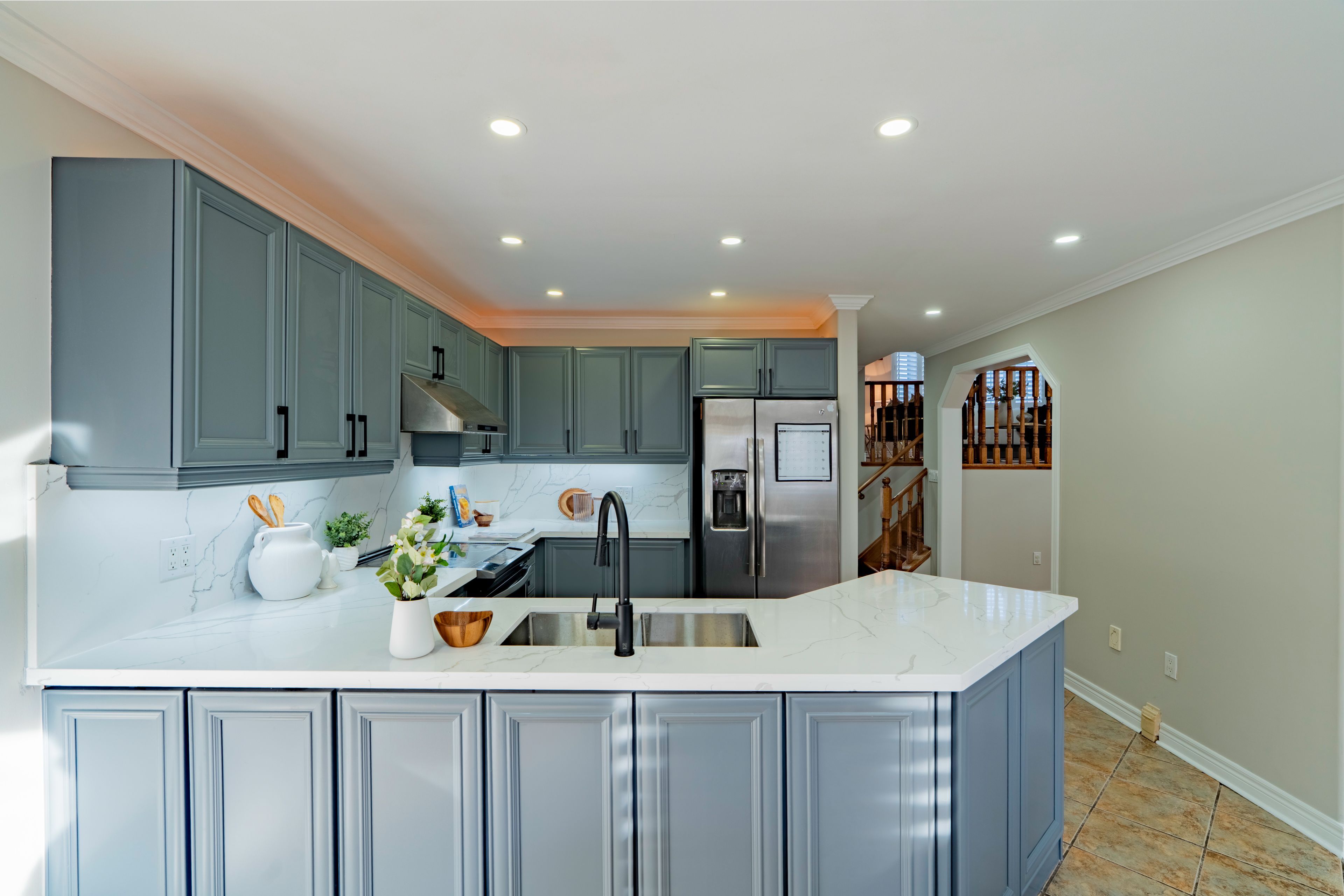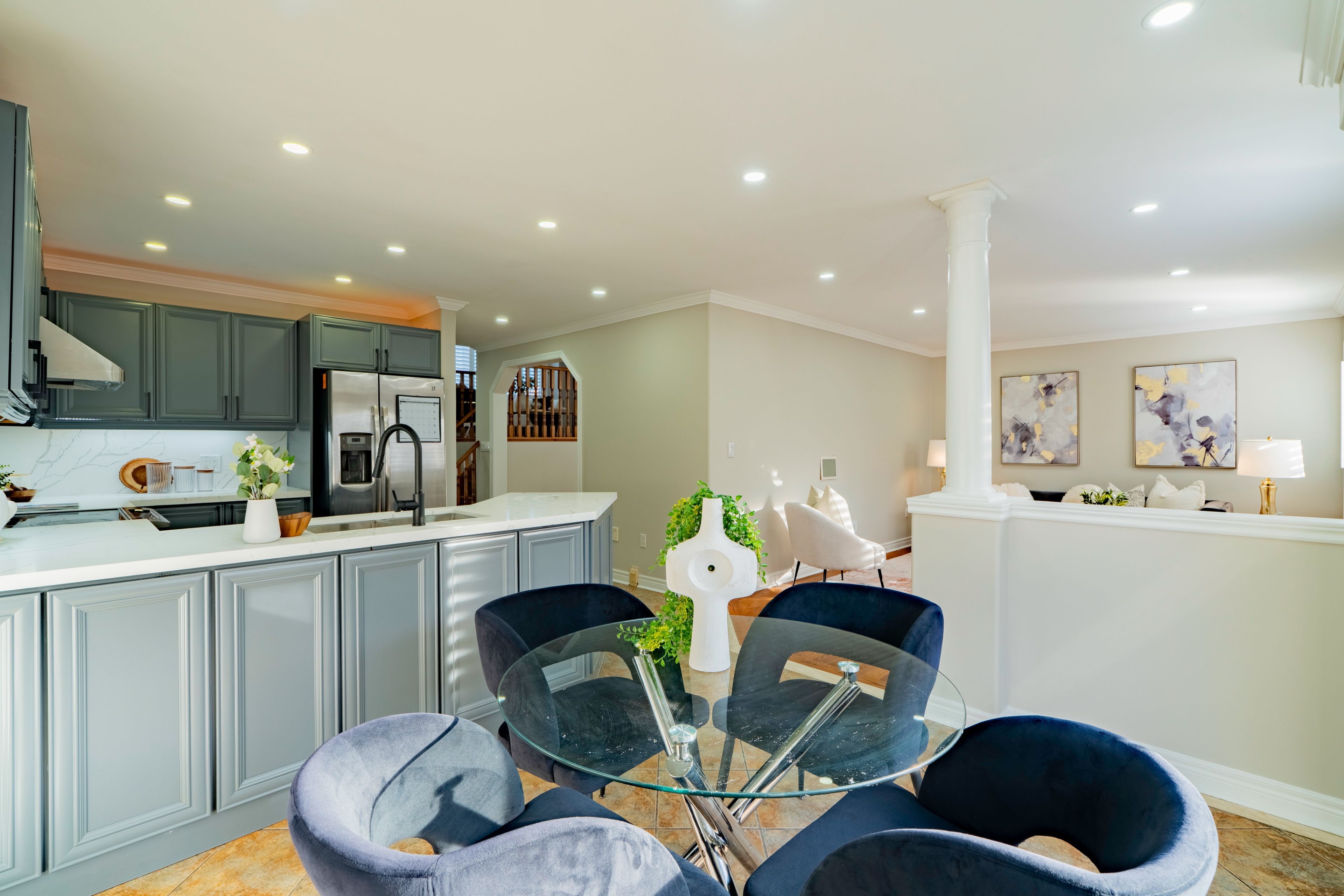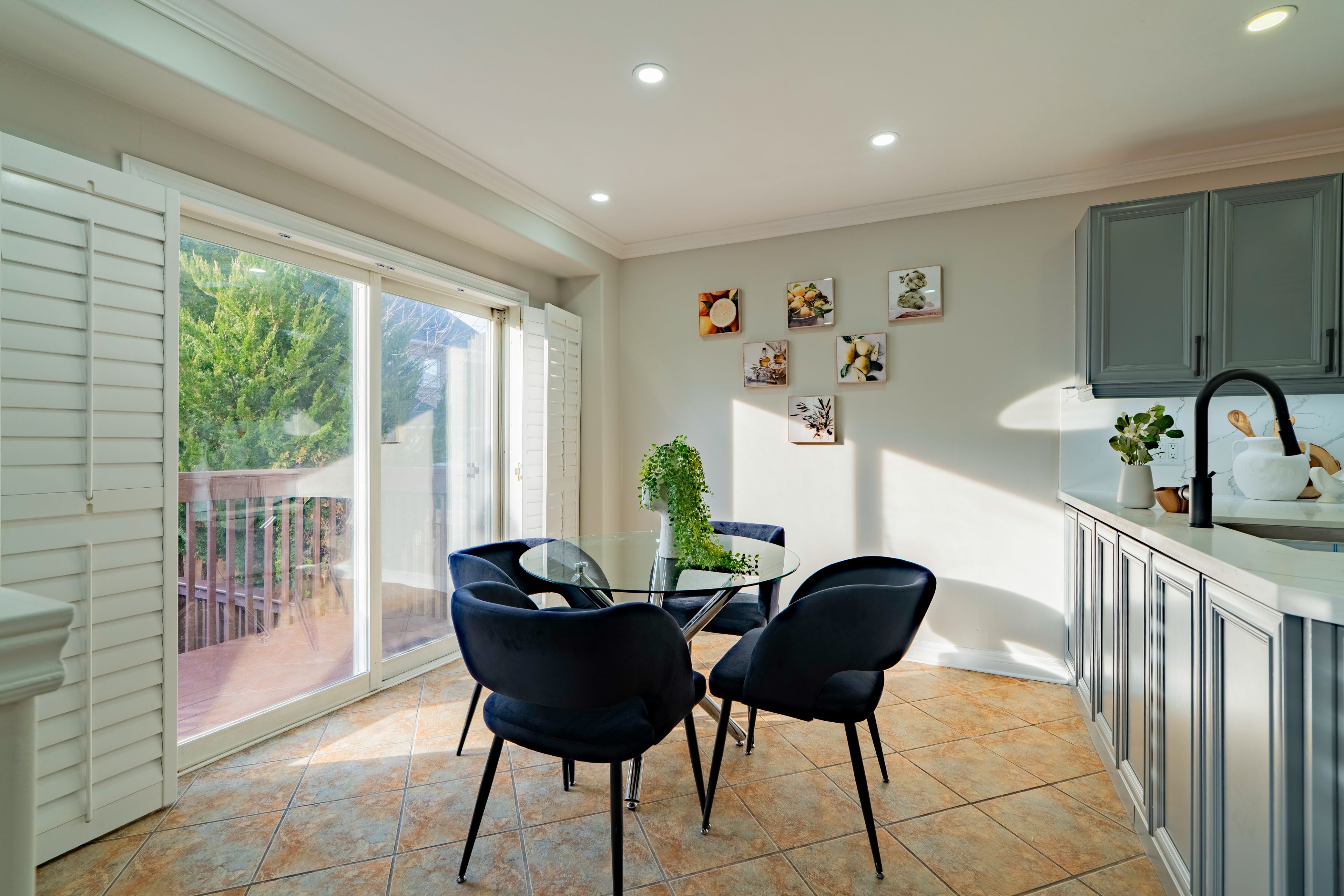 • Modern kitchen with quartz countertops and bright breakfast area.