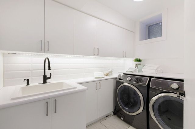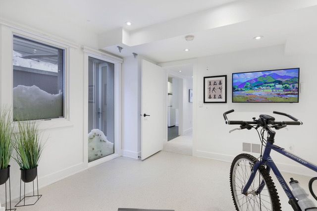 • Bright lower level features a cozy recreation room and dedicated home gym.