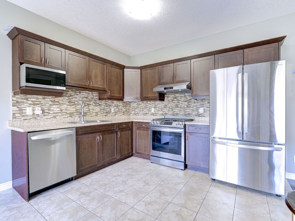• Modern kitchen featuring new appliances including a gas stove.