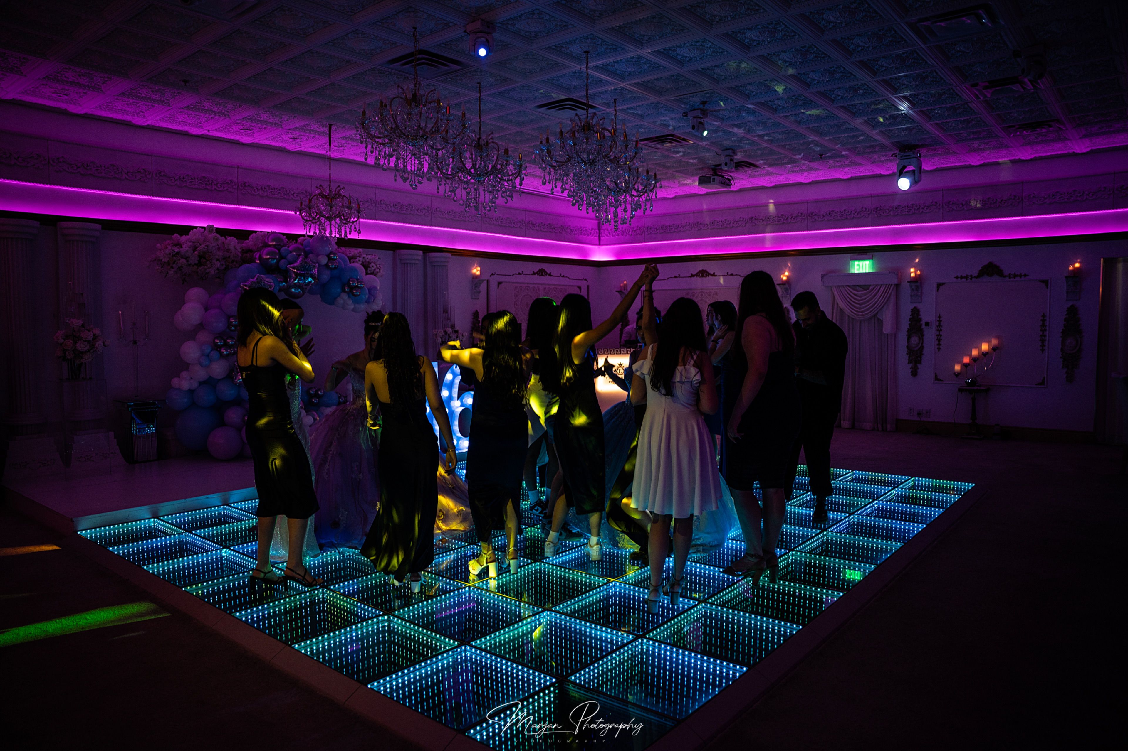 • Includes premium sound system and LED dance floor for events.