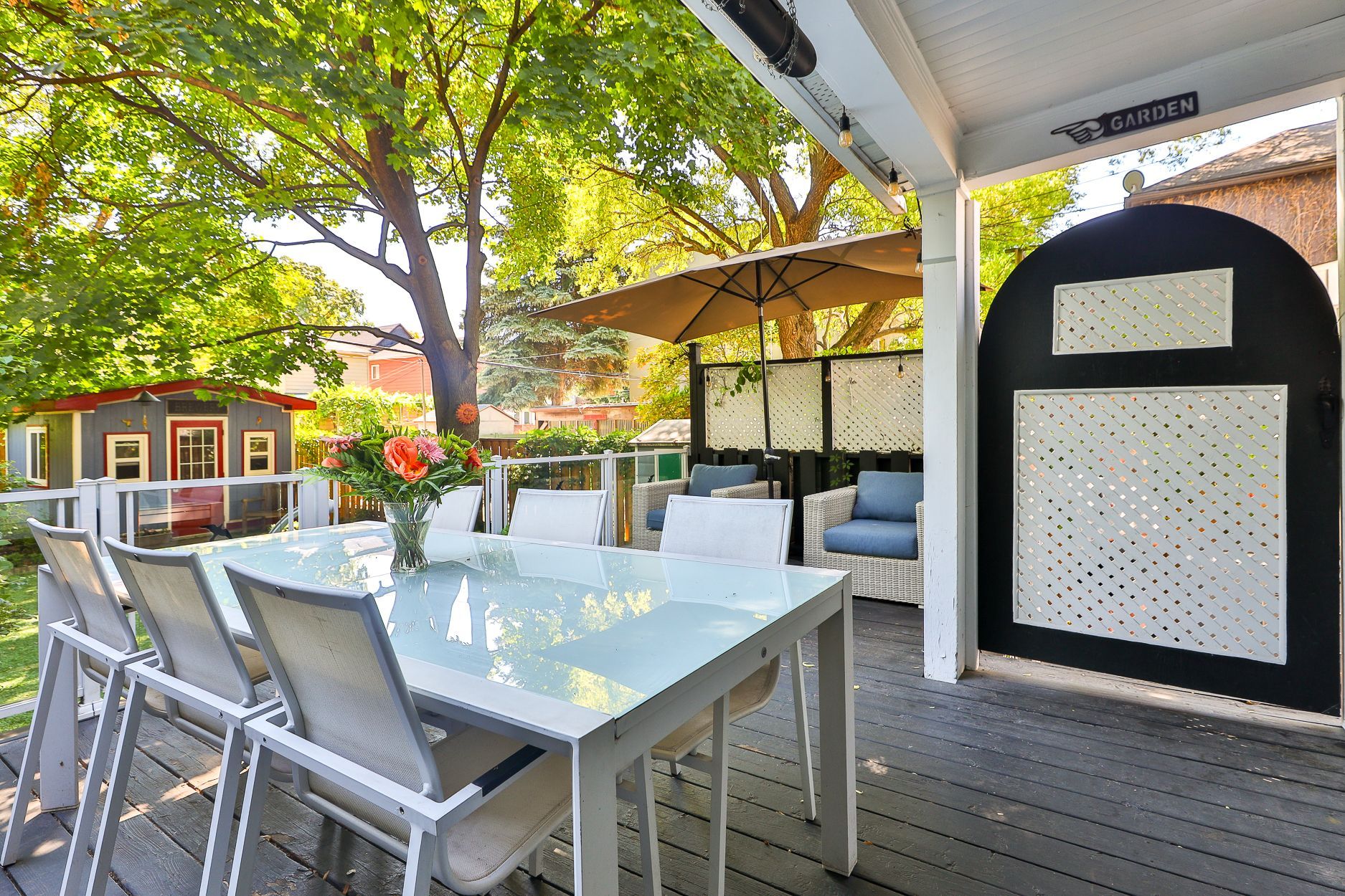 • Two lush gardens with a finished garden house for relaxing.