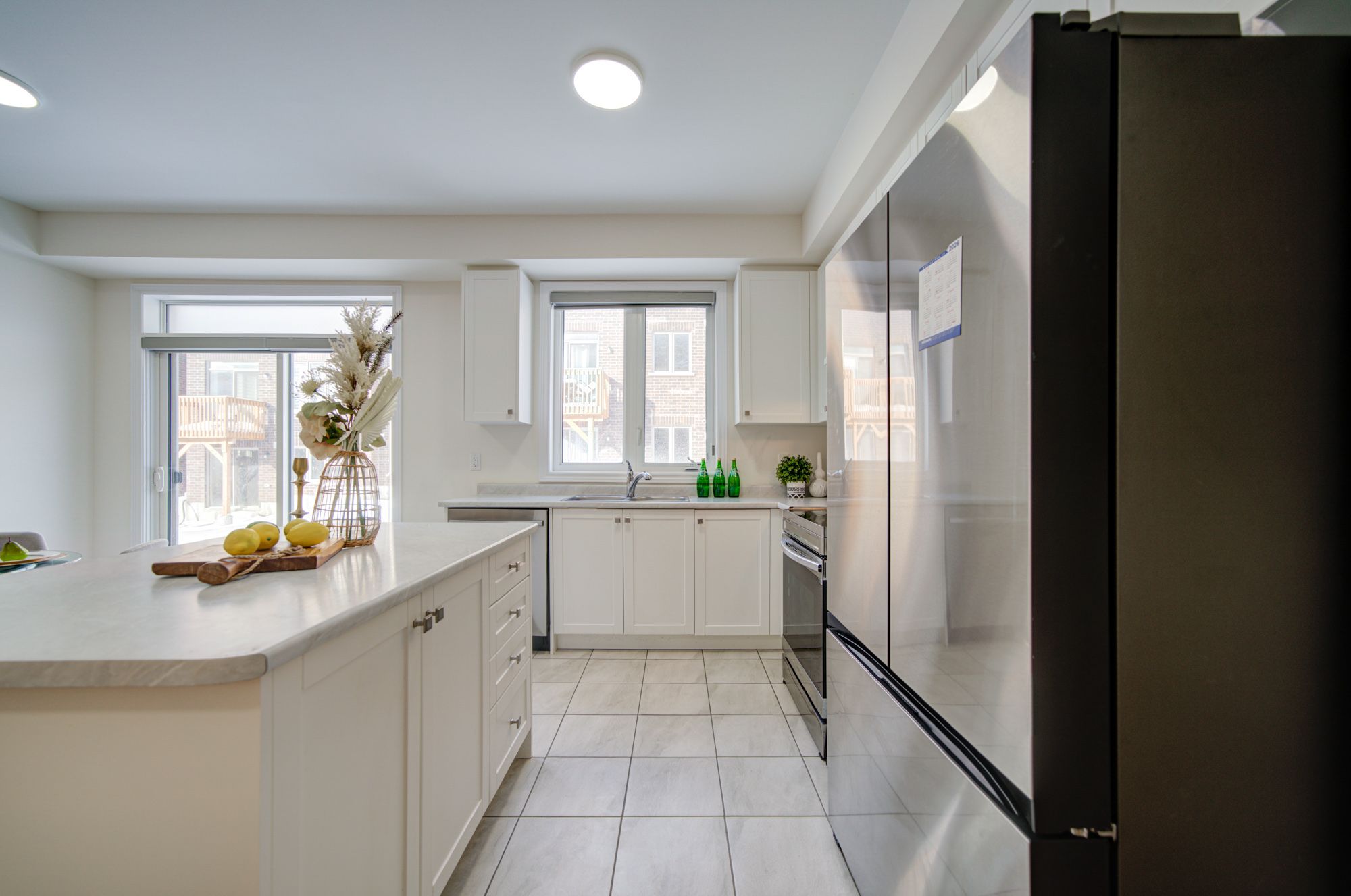 One year old stunning freehold townhouse in seaton! 4 bedrooms 3. 5 bathroomswith long driveway and backyard. It's1836 sqft, bright, spacious, modern design and open concept, 9 ft ceiling on main flr. Hardwood floors in living room with gas fireplace, large window. Kitchen with granite countertops, center island, double sink, s/s fridge, s/s stove, s/s dishwasher. Main floor access to garage. 2 master bedroom ( one is 13ft ceiling with large windows ) with 4 pcs ensuite. Just minutes away from highways 401, 407, and the pickering go station, it offers easy access to schools, parks, trails, and more. Prime location close to highways, grocery stores, banks, transit, schools, restaurants, and shopping. Just minutes away from highways 401, and the pickering go station. Dont's miss it. Move in condition.