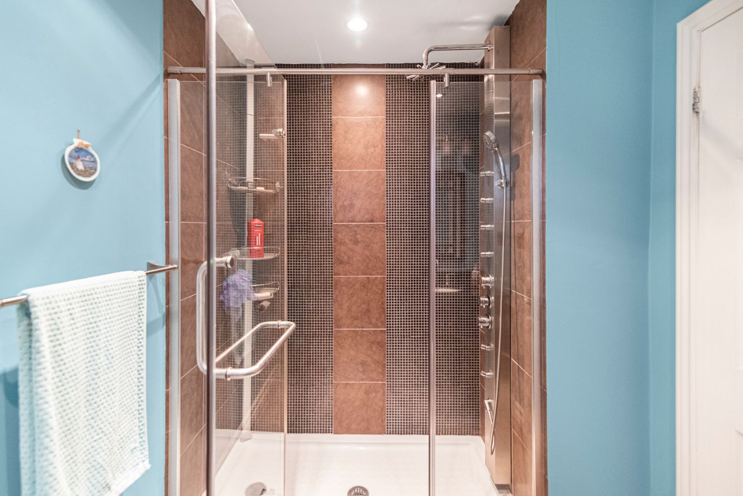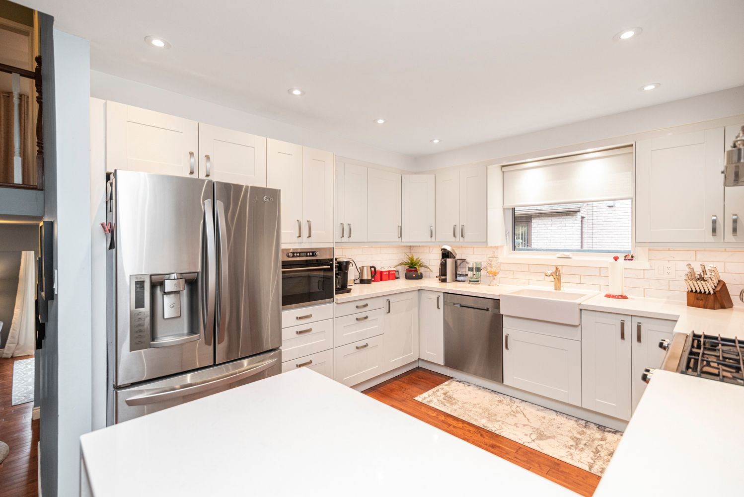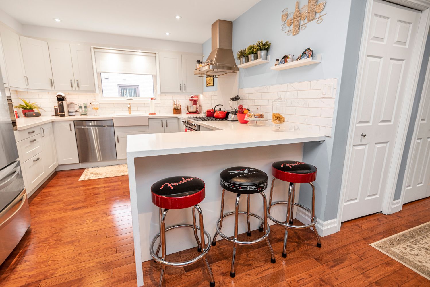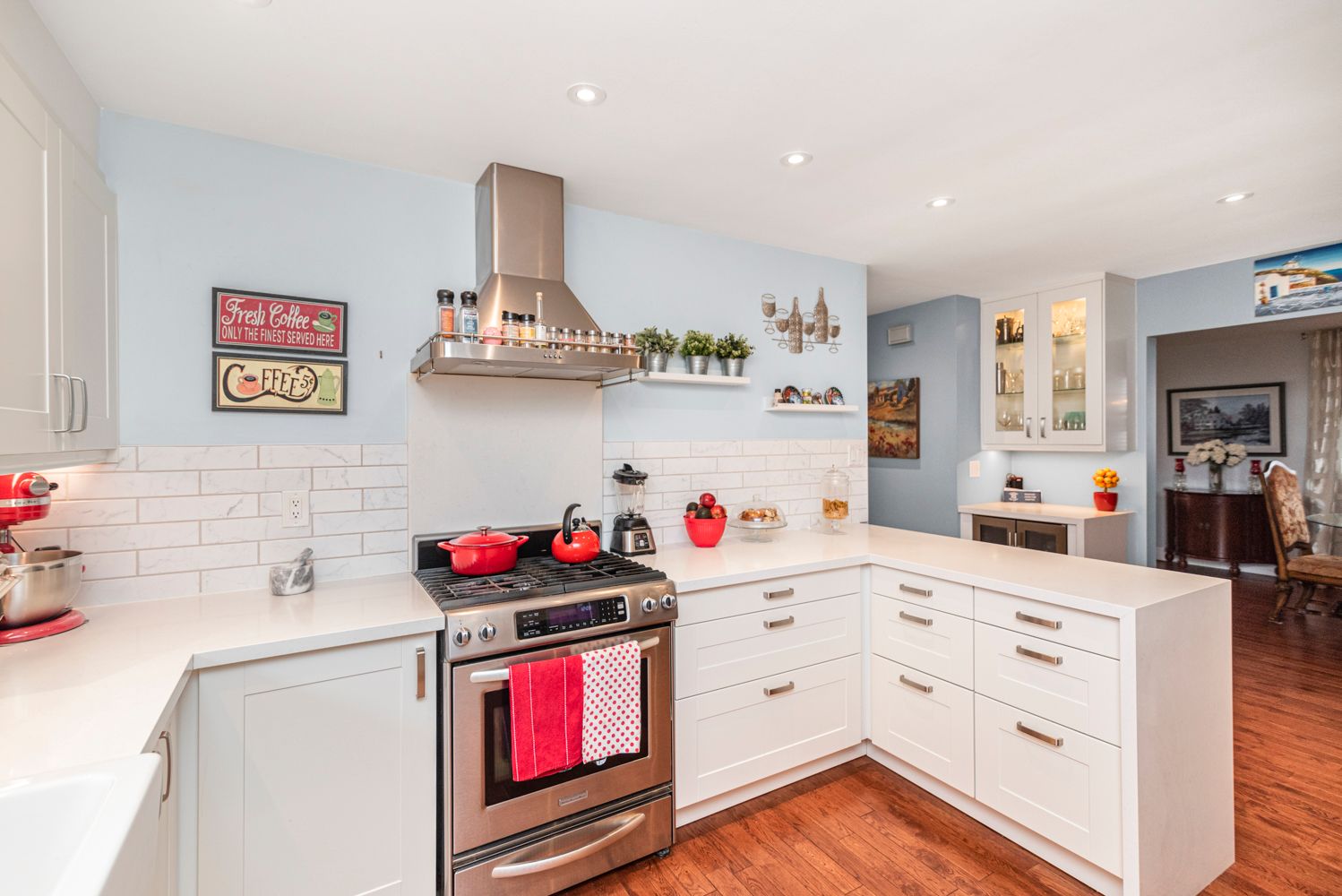 • Custom kitchen features quartz counters and stainless steel appliances.