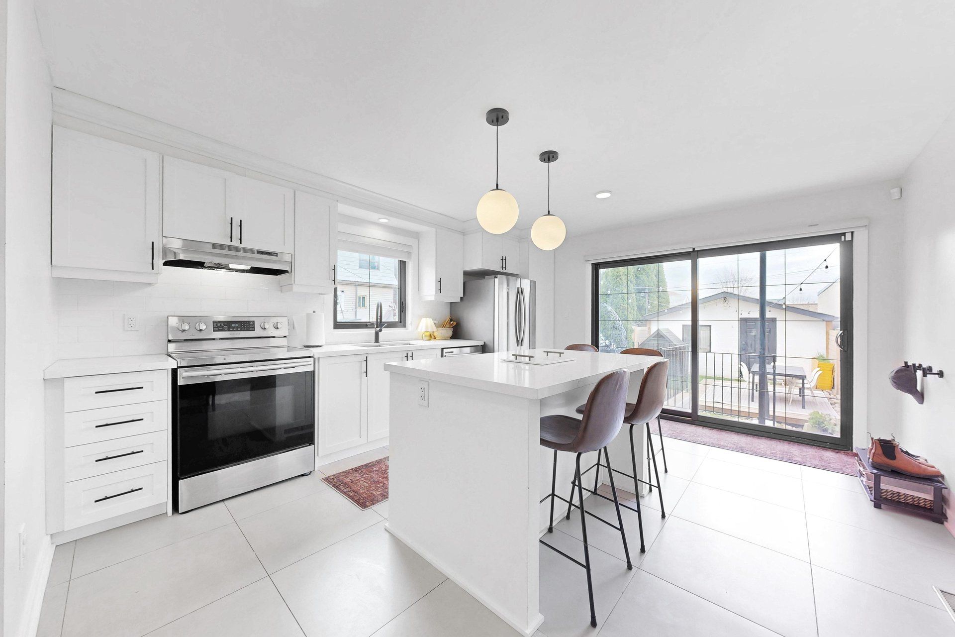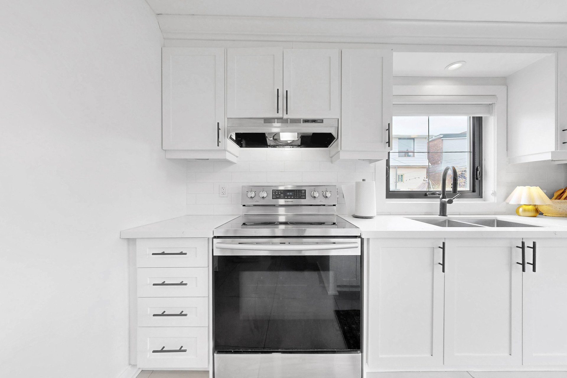 • Spacious kitchen with quartz countertops and large windows for natural light.