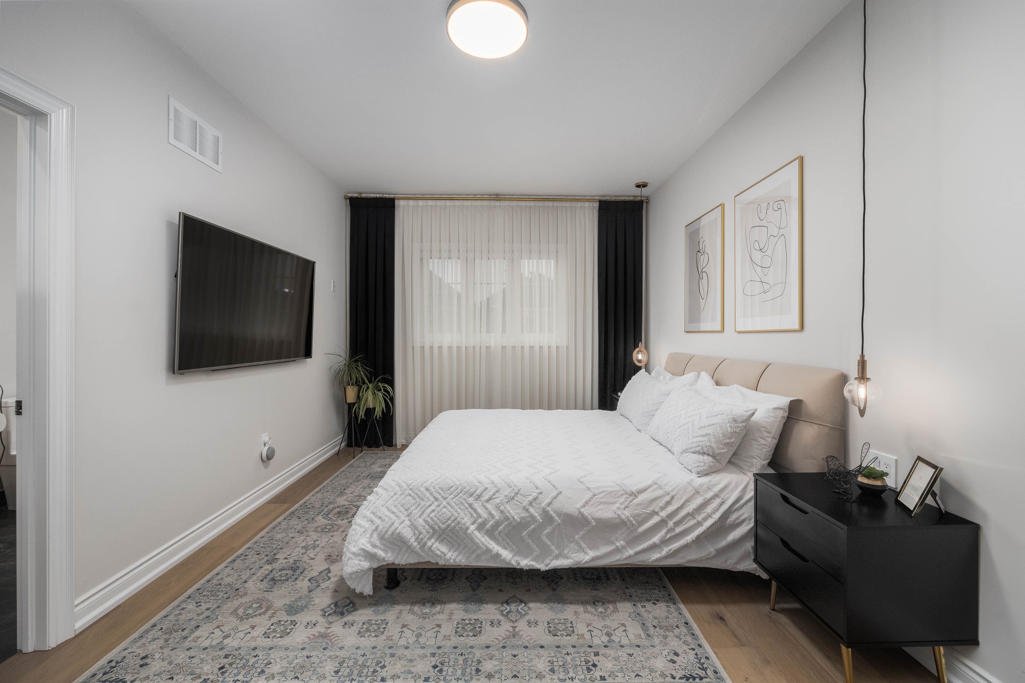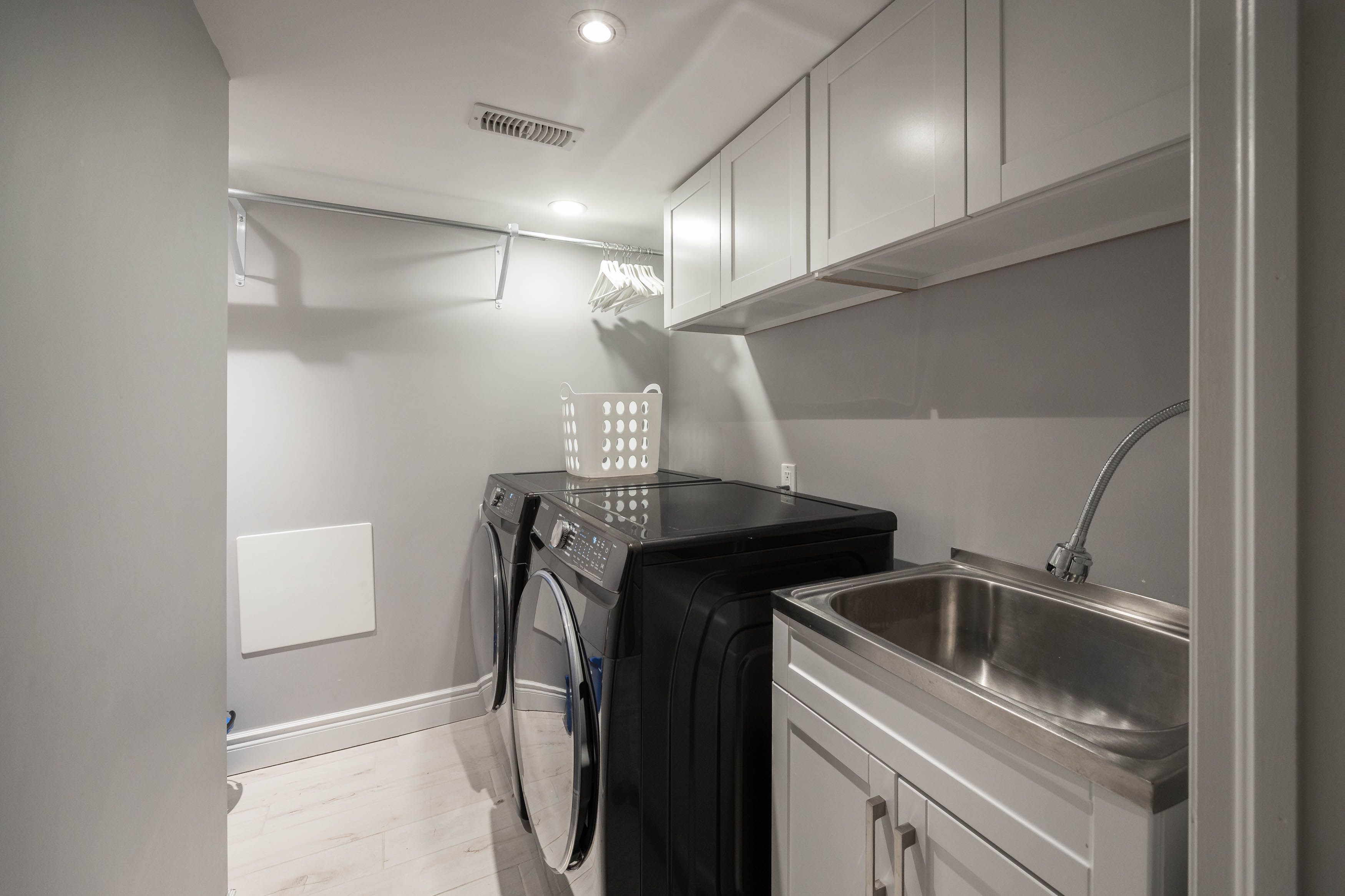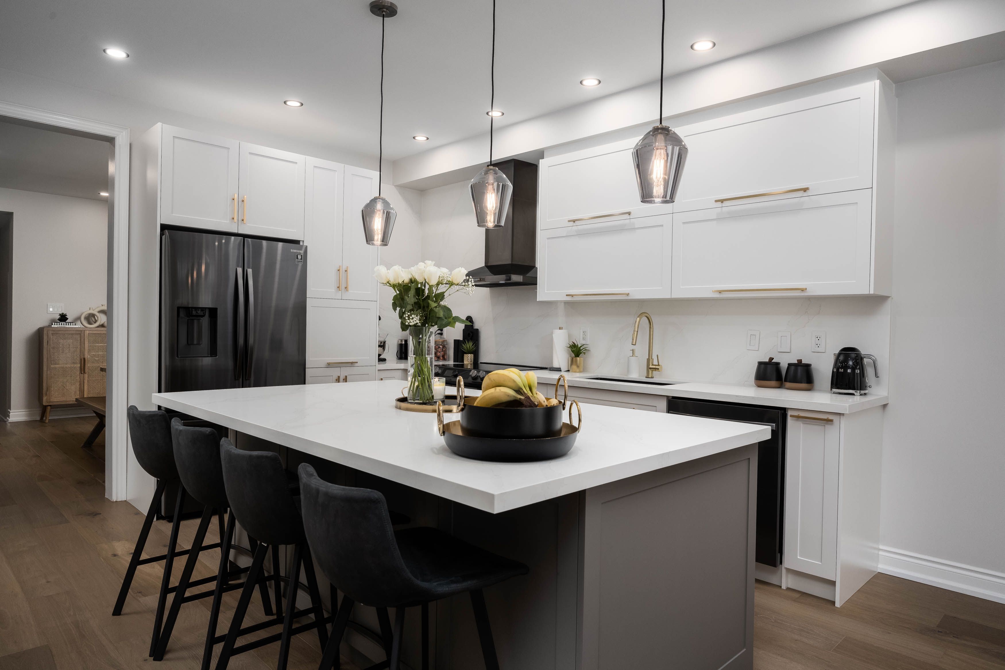 • Gorgeous kitchen features modern appliances and sophisticated two-tone cabinetry.