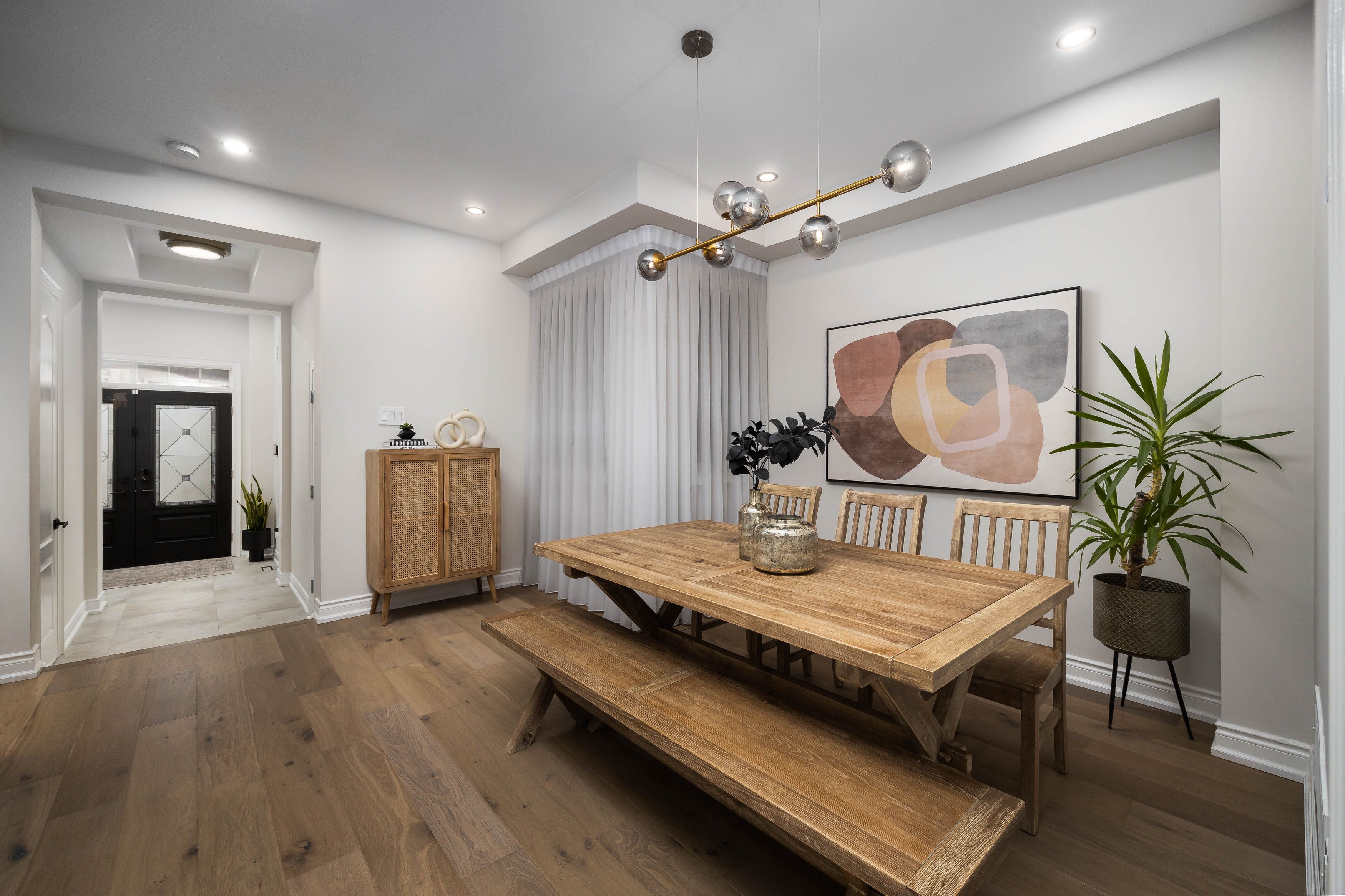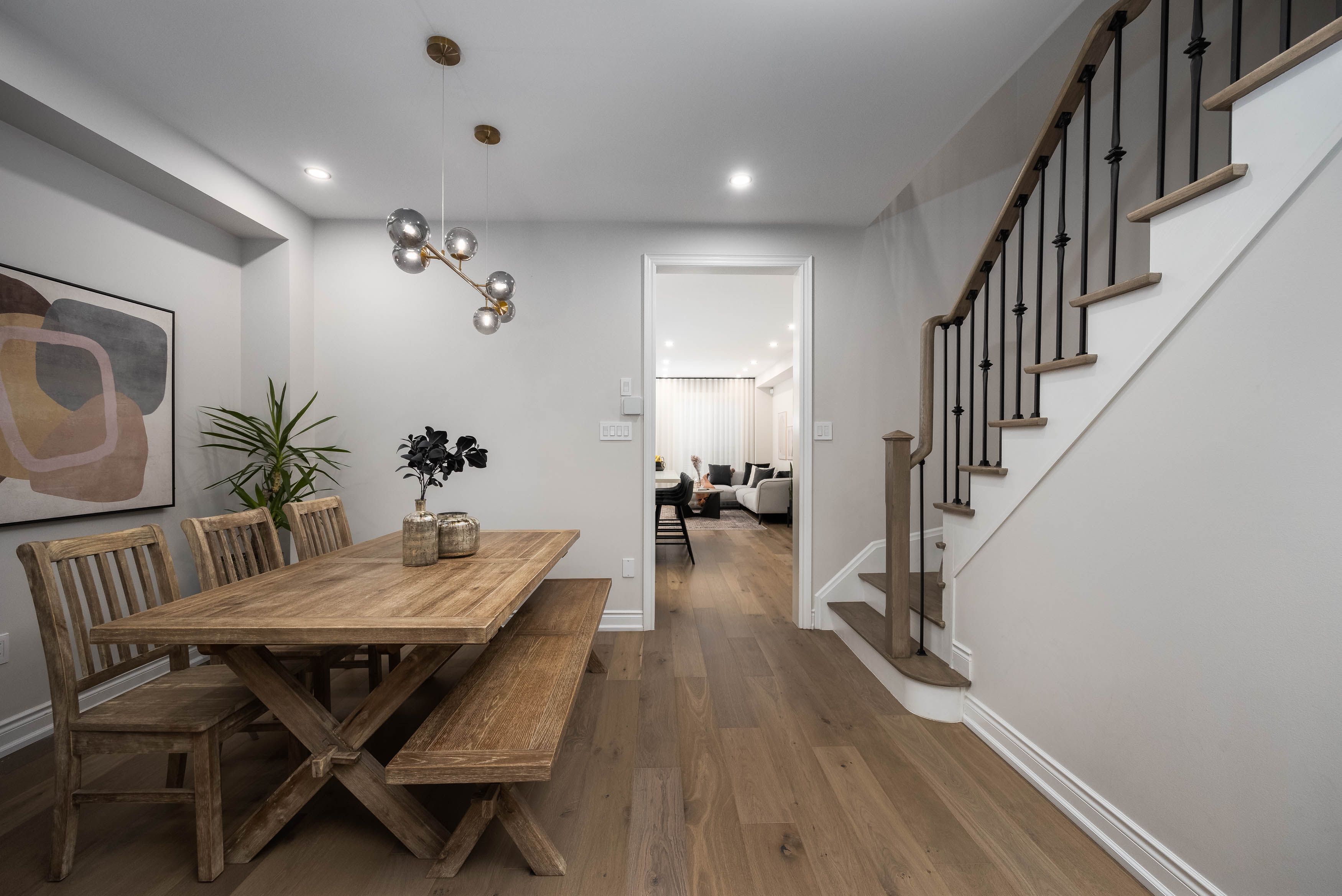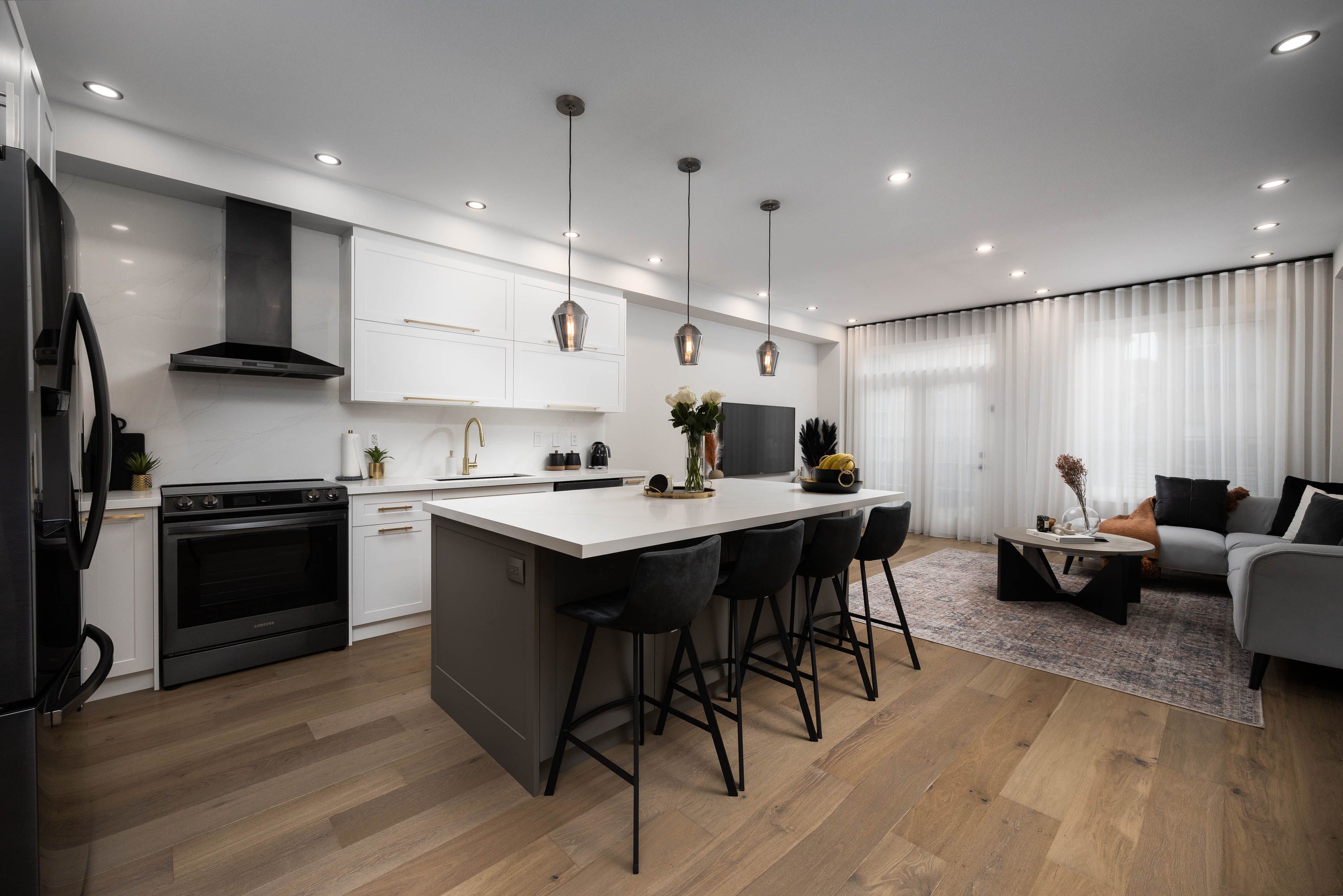 • Open-concept main floor with upgraded hardwood flooring and elegant pot lights.