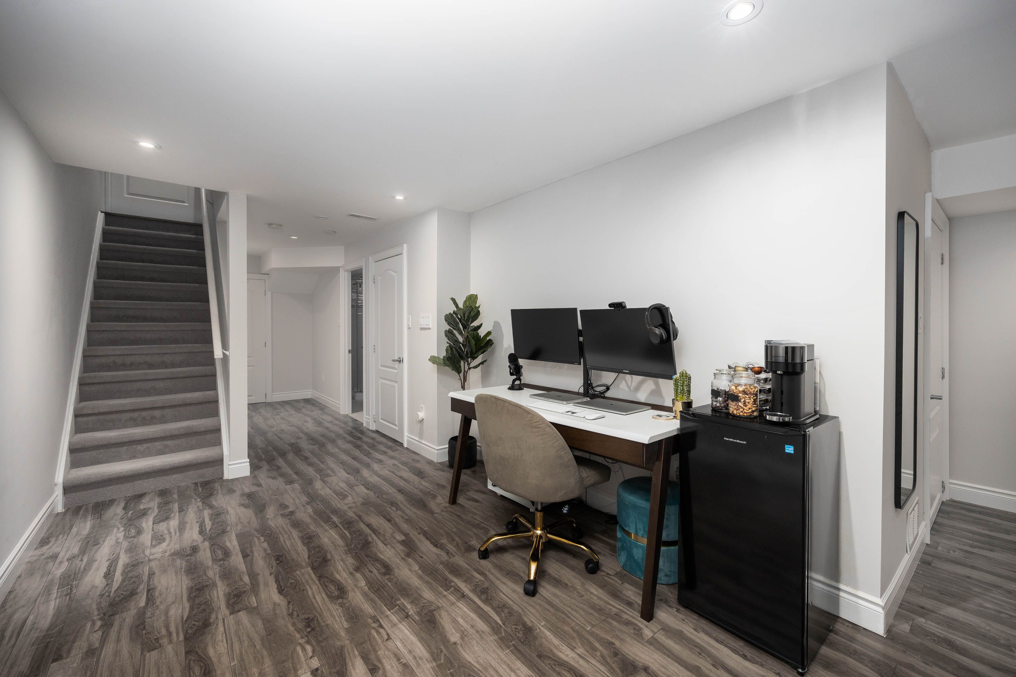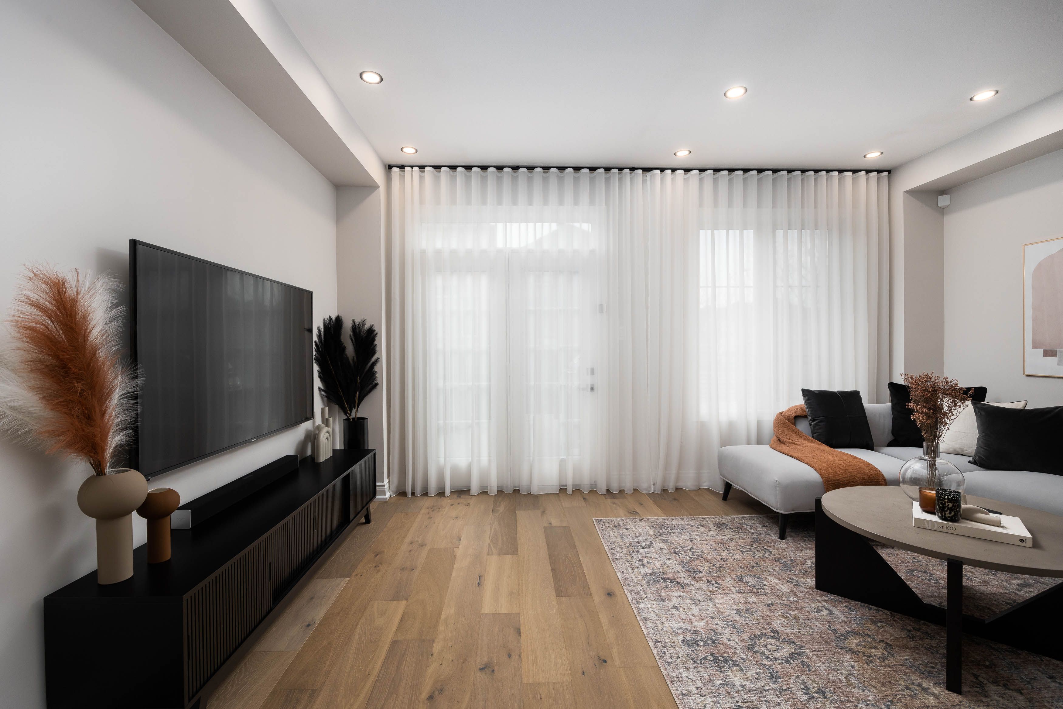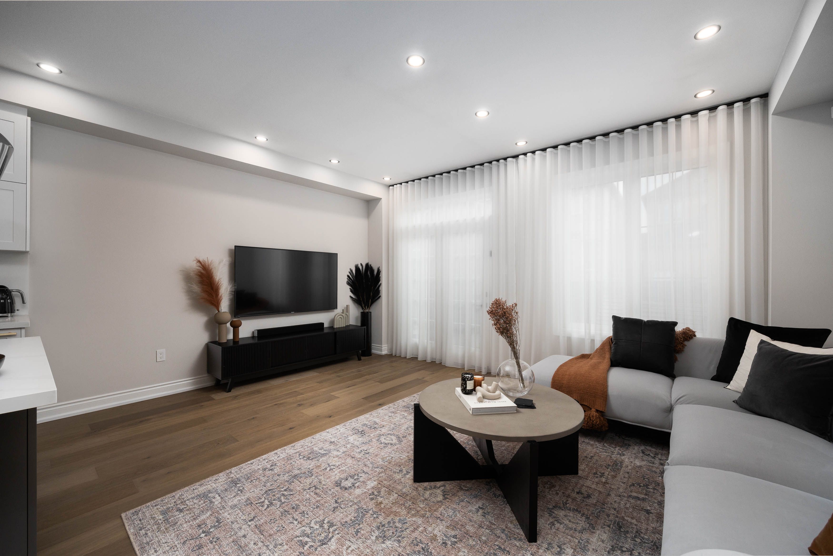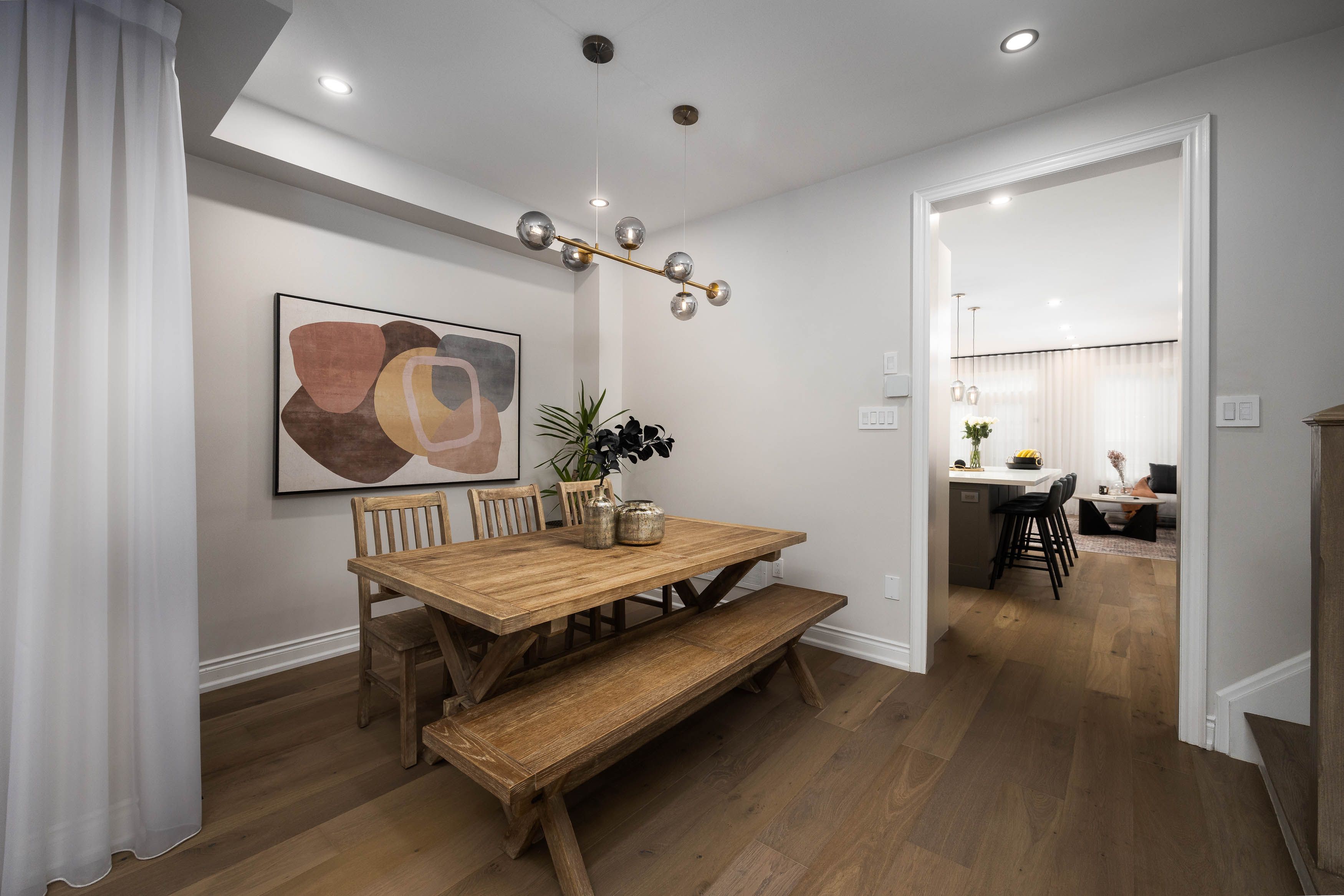 • Open-concept main floor with upgraded hardwood flooring and elegant pot lights.